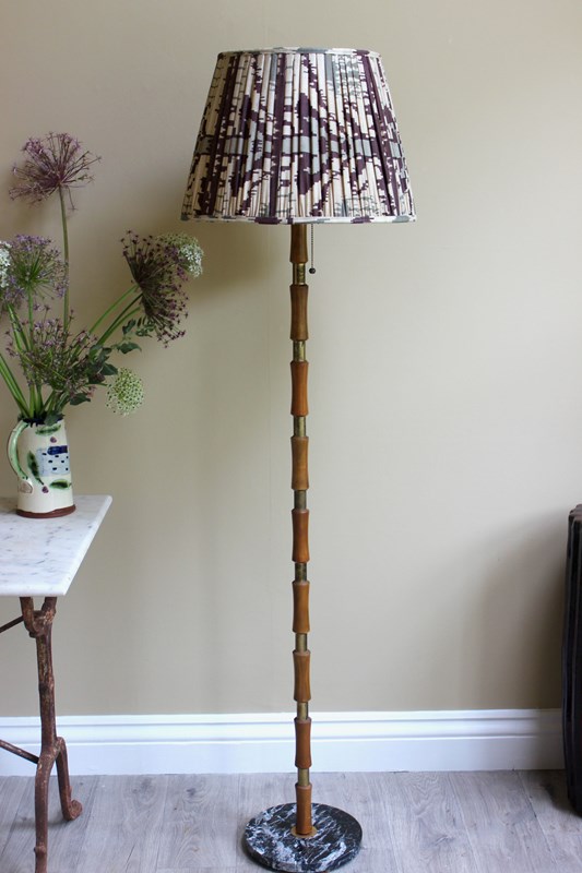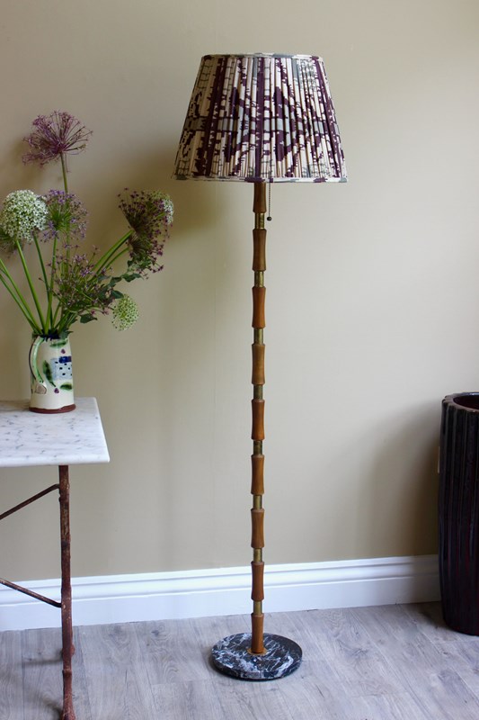 Super smart marble based French mid century floor lamp circa 1960 with original on/off switch pull chain , polished wood spindle with brass sections and shown with an OKA 45 cms dia stock shade ( not included ).