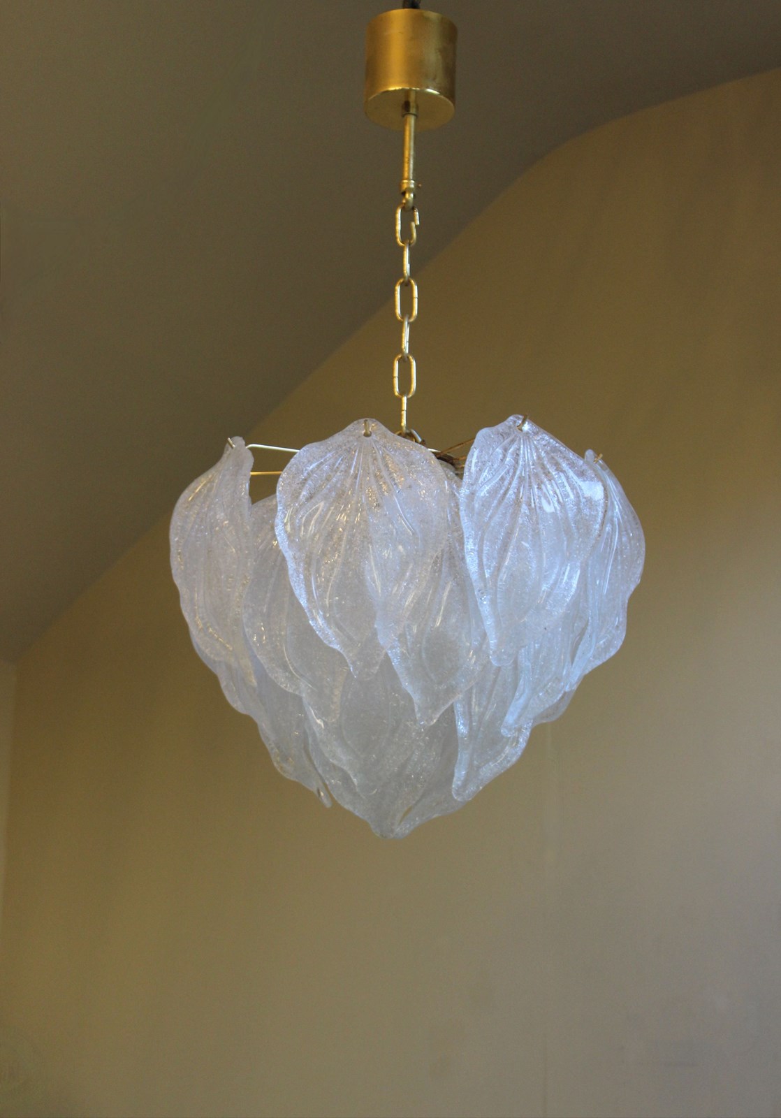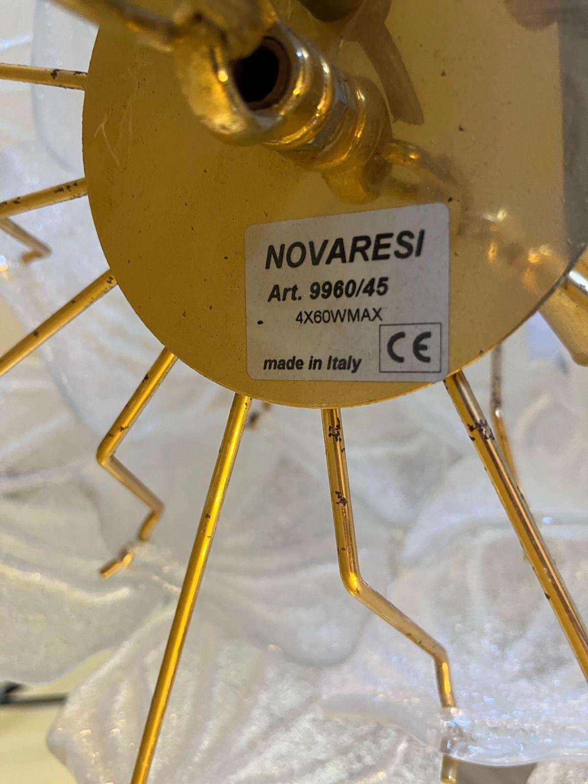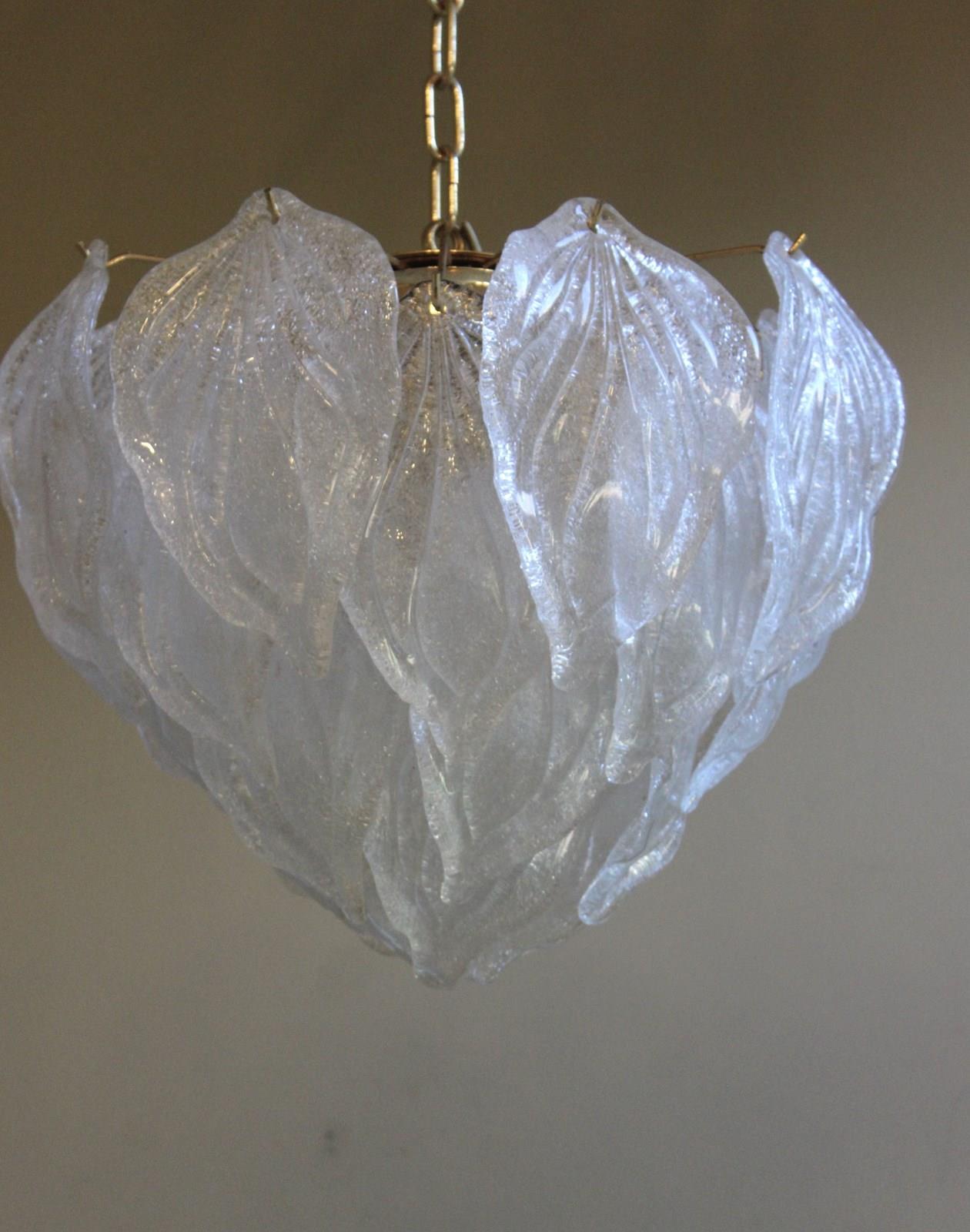 Elegant Murano semi transparent glass leaves in the form of a tulip flower suspended from an eletroplated gold frame with 4 internal light points - the perfect pendant