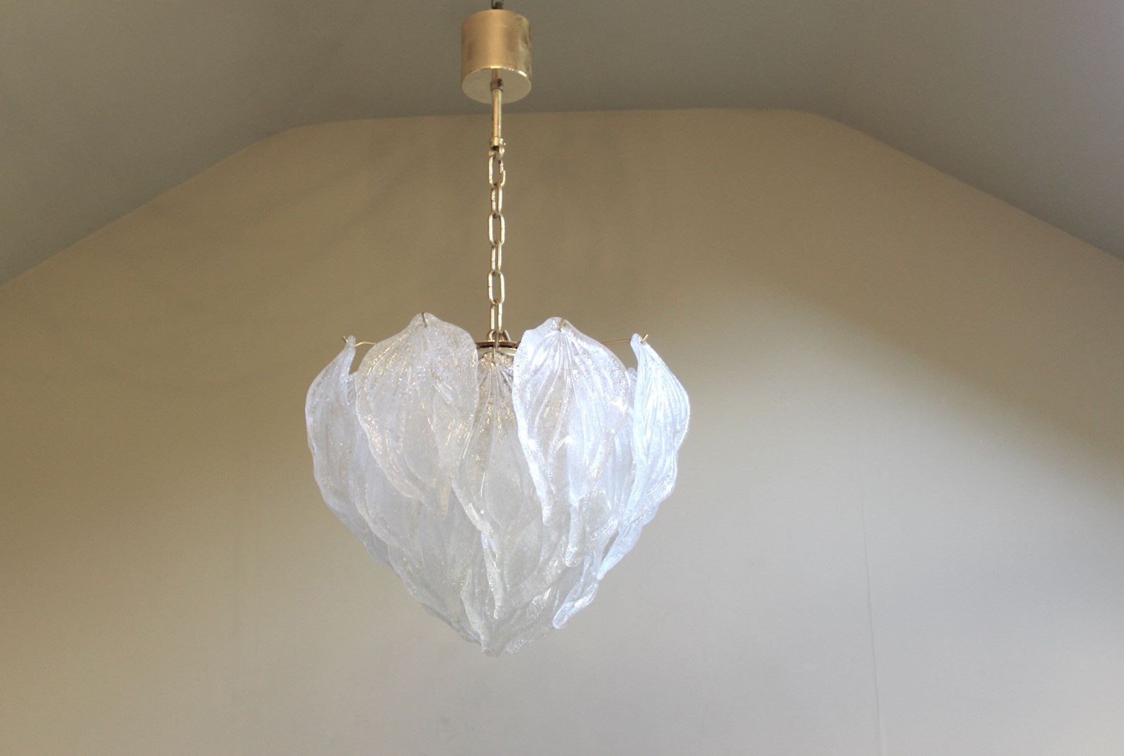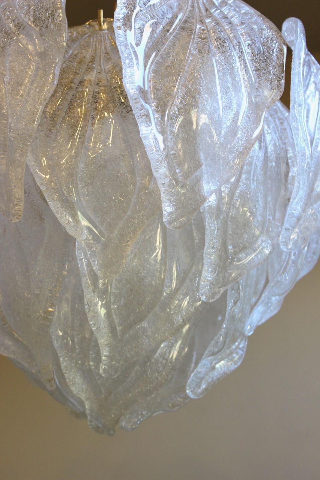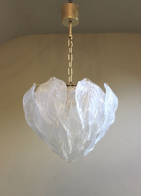Elegant Murano semi transparent glass leaves in the form of a tulip flower suspended from an eletroplated gold frame with 4 internal light points - the perfect pendant