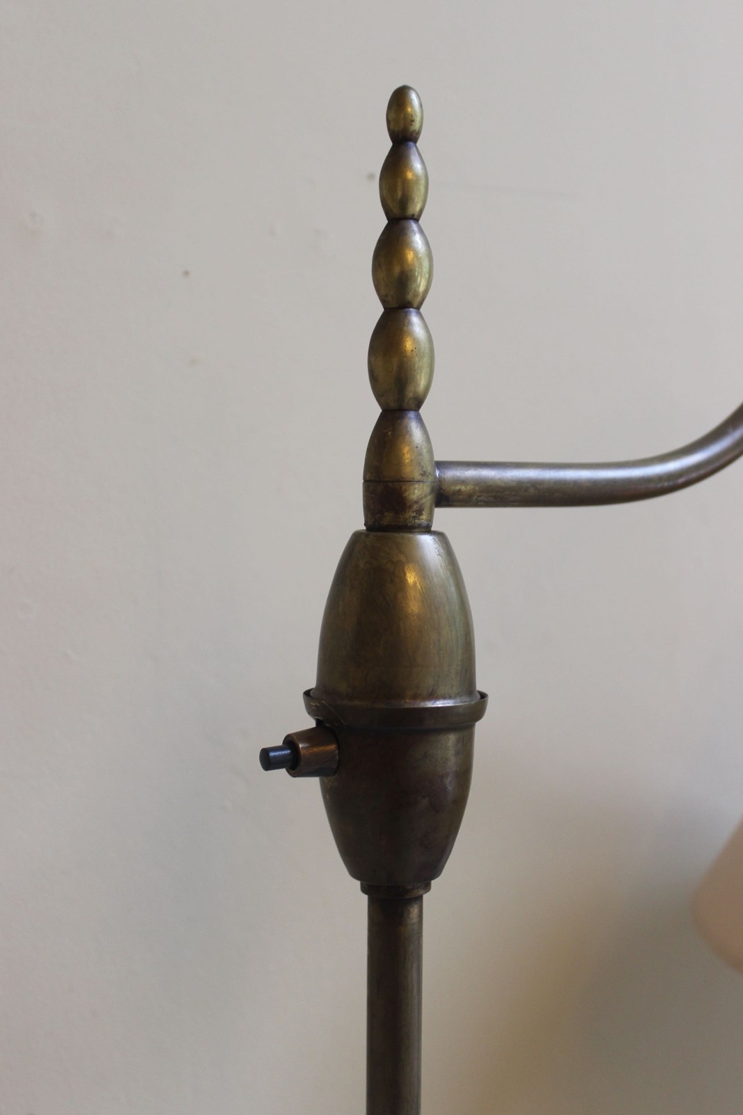 Great pair of French middle 20th C reading lamps with original on/off switches and custom made taupe silk shades