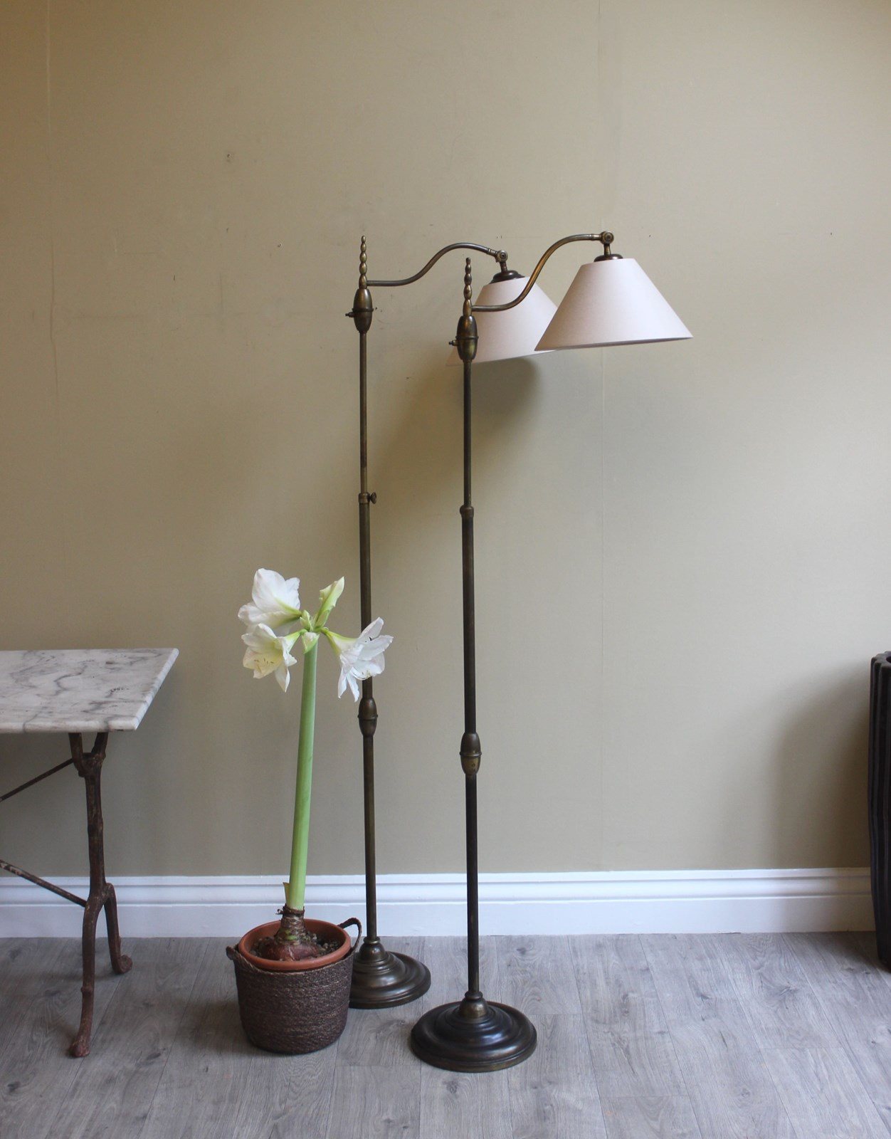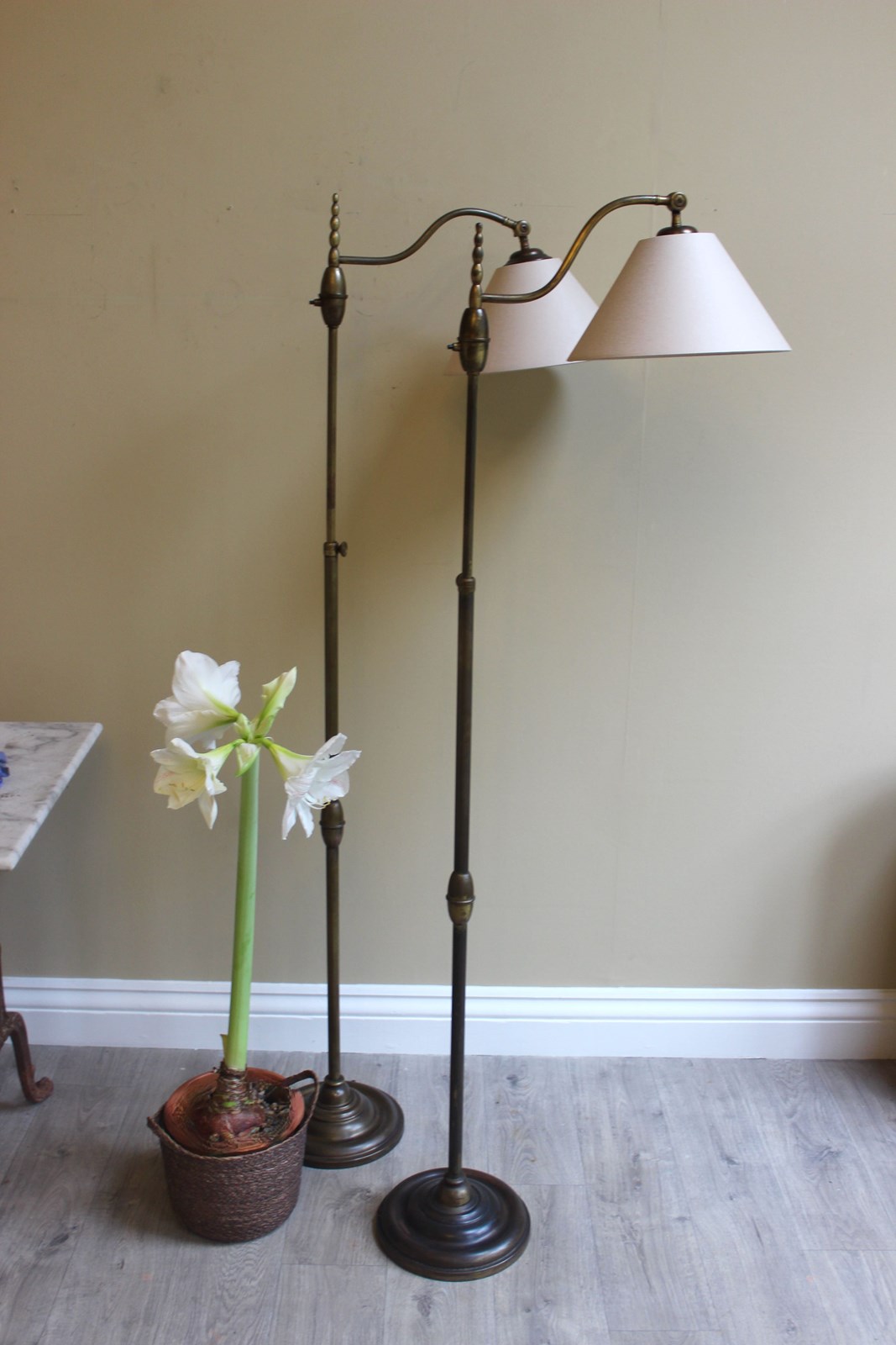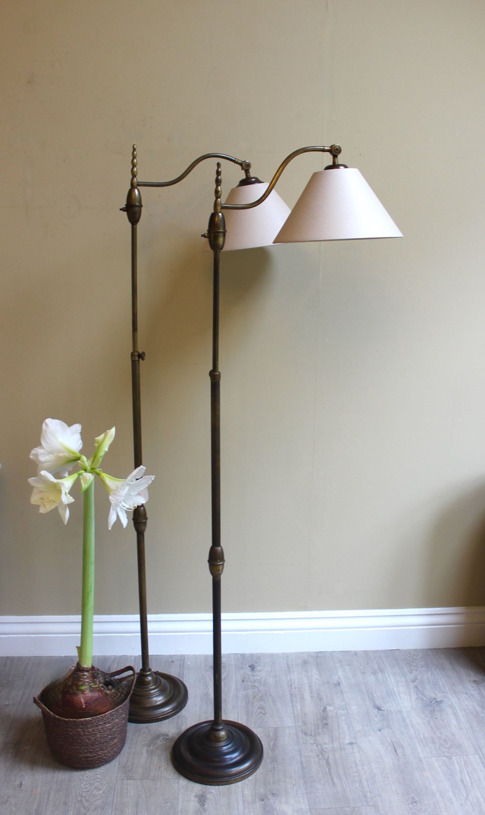 Height adjustment is from 160 cms down to approx 130 cms and the shades have adjustable positions for reading - perfect for beside a chair orsofa or in a library