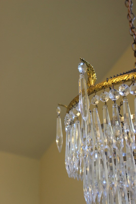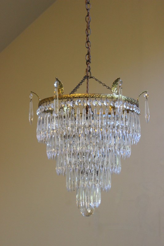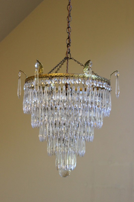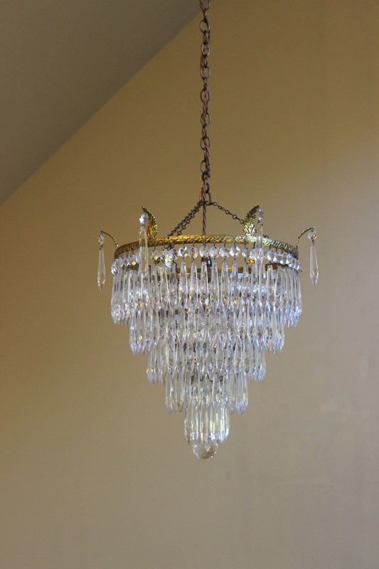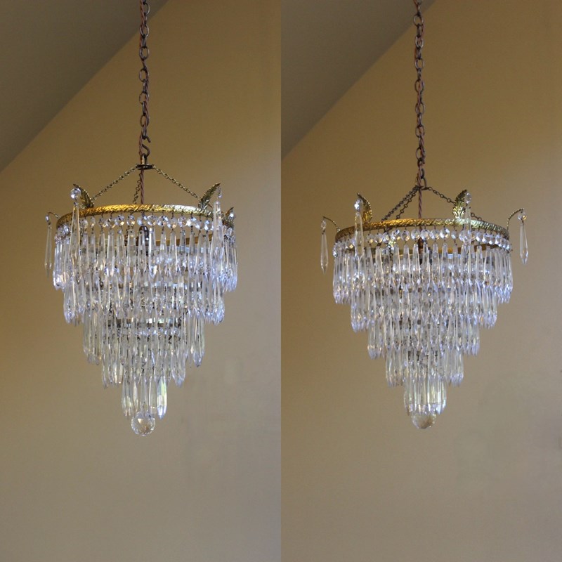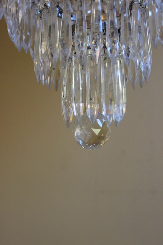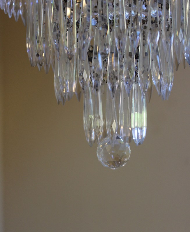 Great pair of English 5 tier cut glass waterfall pendants with single central bulb. The light reflected by the circular tiers of icicle drops terminating in a faceted sphere at the base.