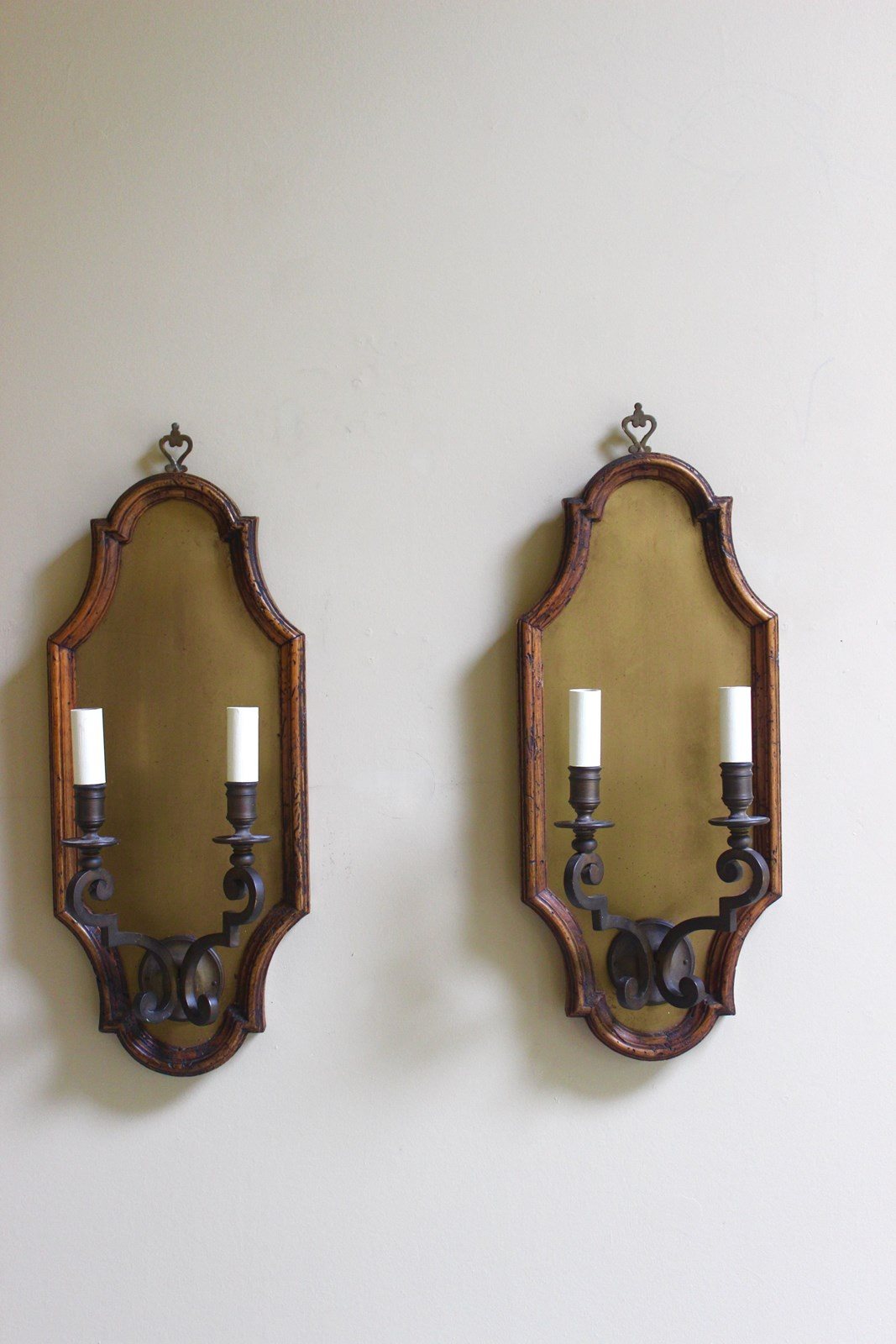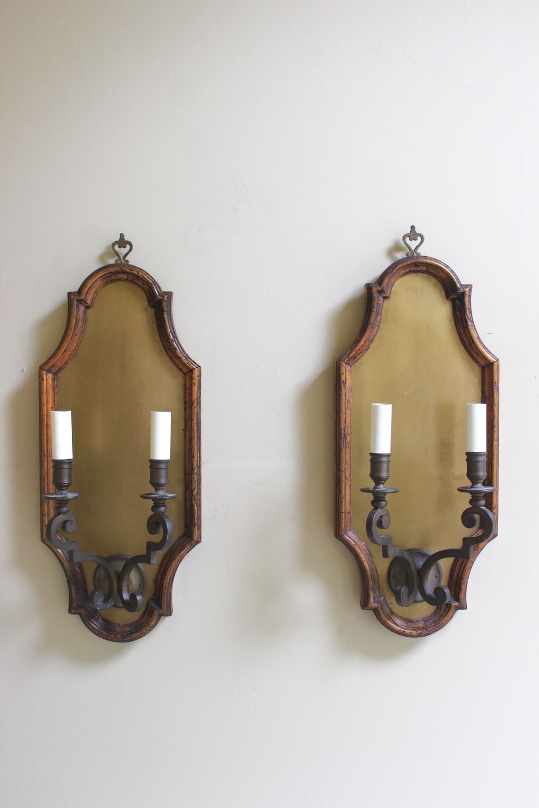 A pair of beautifully made darker brass twin branch sconces with wood frames and brass back plates - decorative brass loops to the top suitable for clip shades (see stock no 9668150)