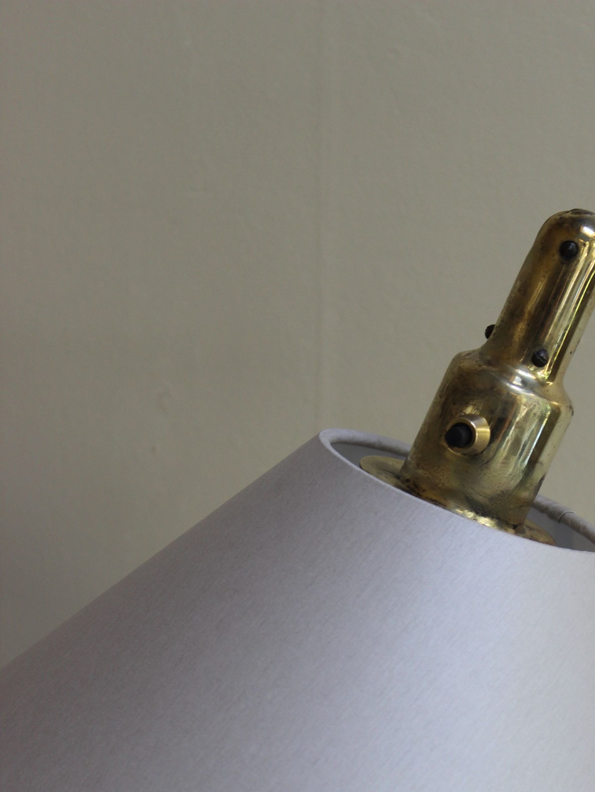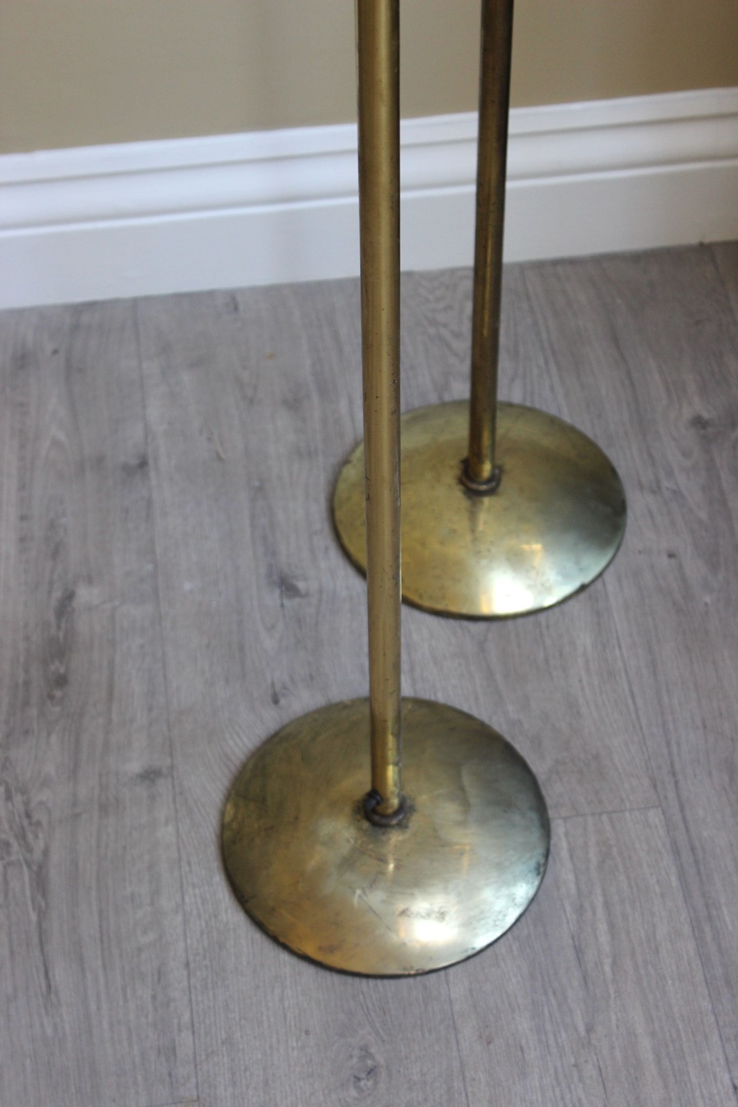 Slim profile pair of French mid century floor lamps with weighted bases and adjustable heights ( 160 cms - 130 cms ) they are actually very similar in tone one being very slightly darker on the spindle - variances in colour/tone are due to the lamps previous positions in the original homes they came from.