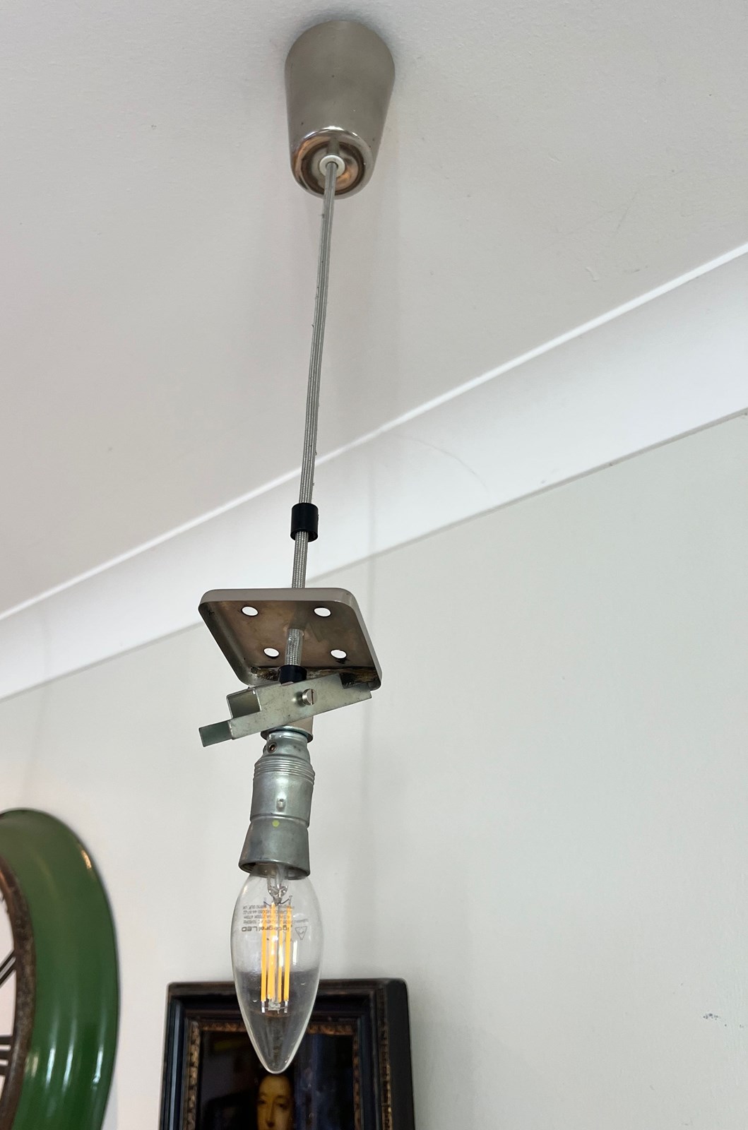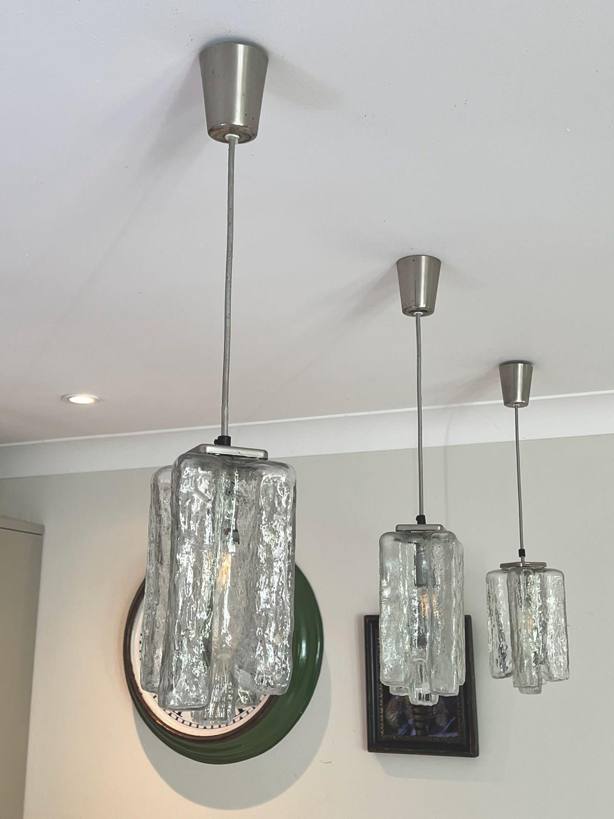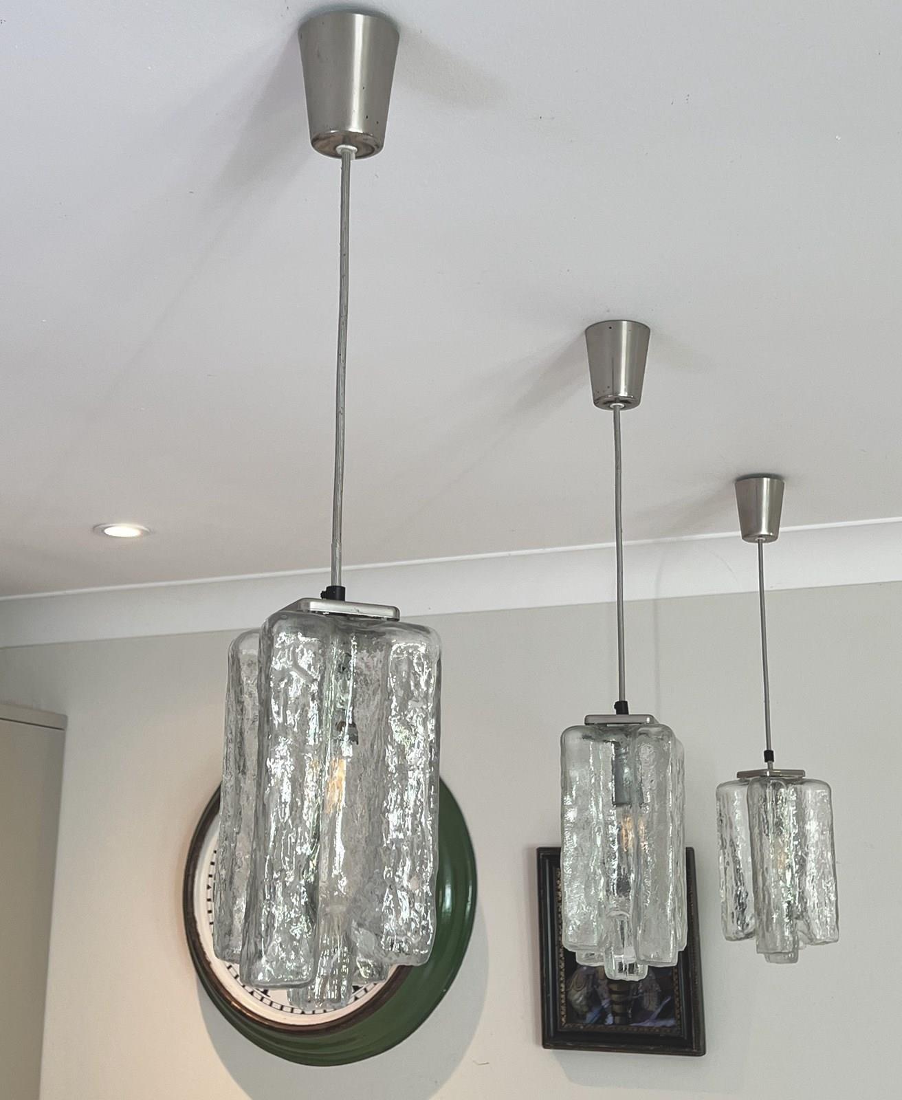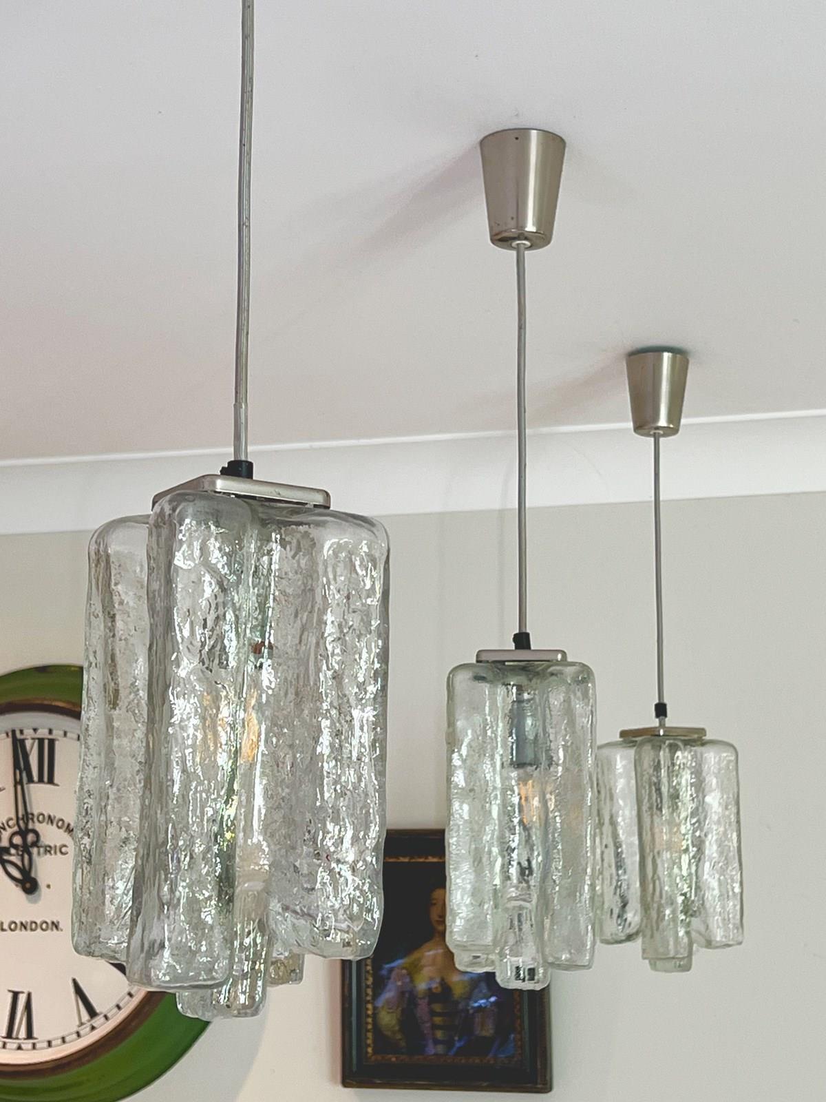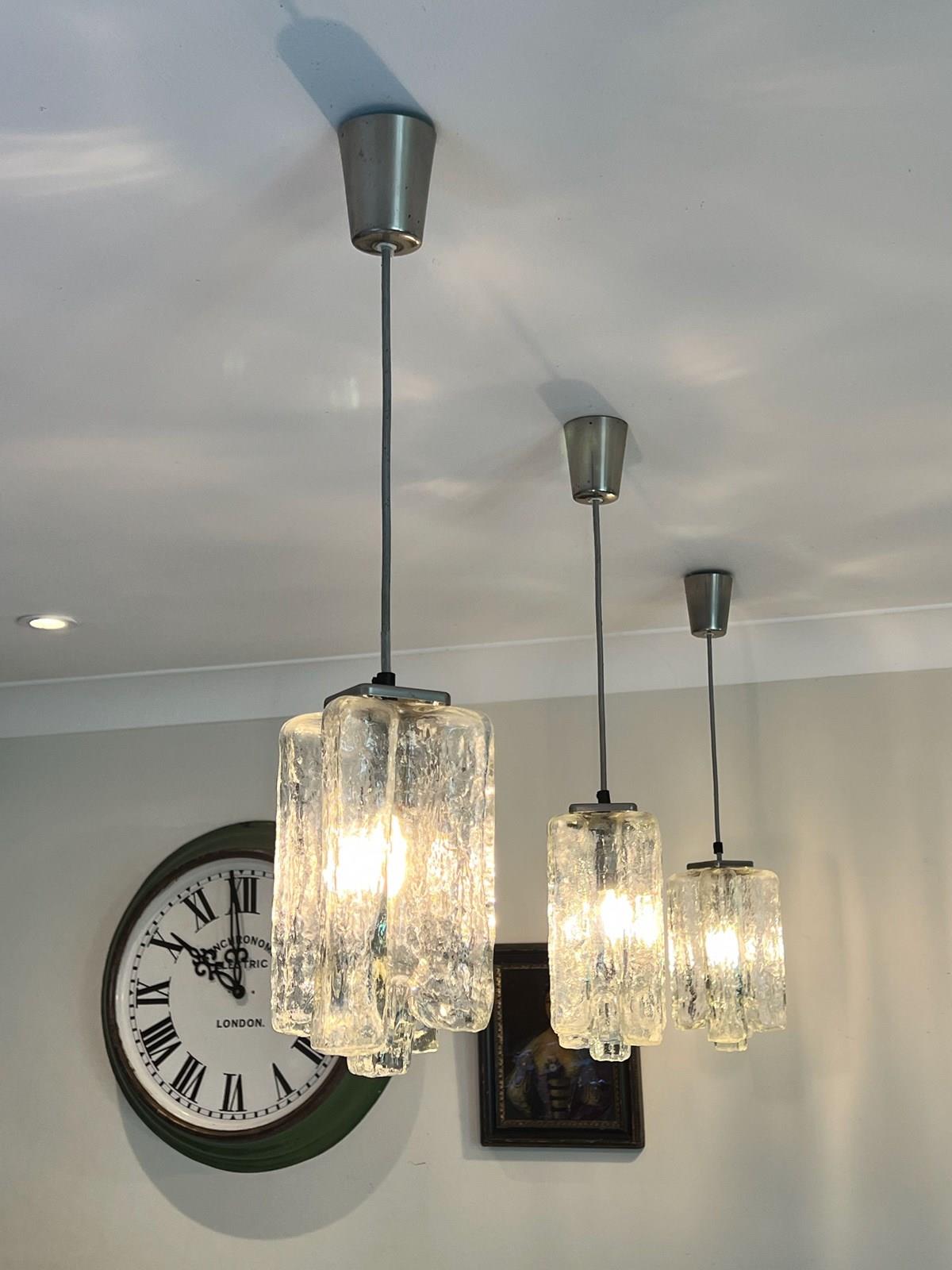 Set of 3 lovely glass mid century ceiling pendants suitable for over a counter top each glass shade measures 27 cms top to base and the ceiling plate is approx 10 cms drop between there is silver cable presently measuring about 30 cms ( can be lengthened or shortened ) these were hung above a counter top 199 cms x 95 cms