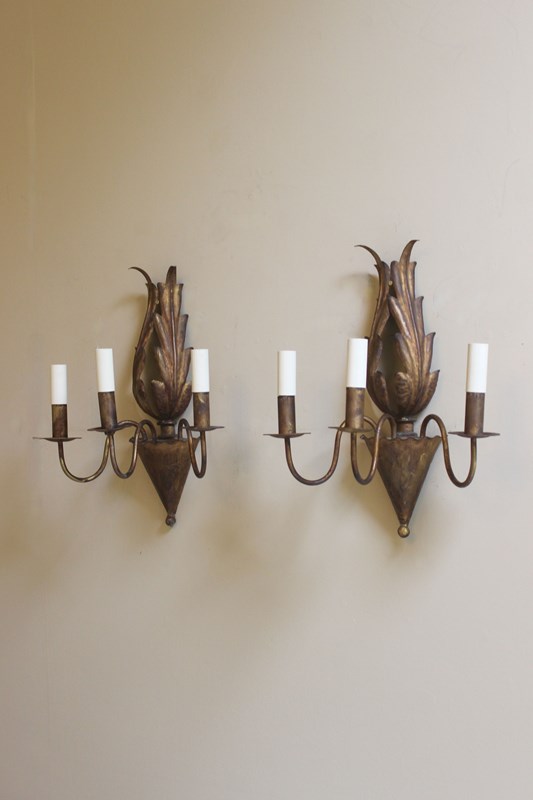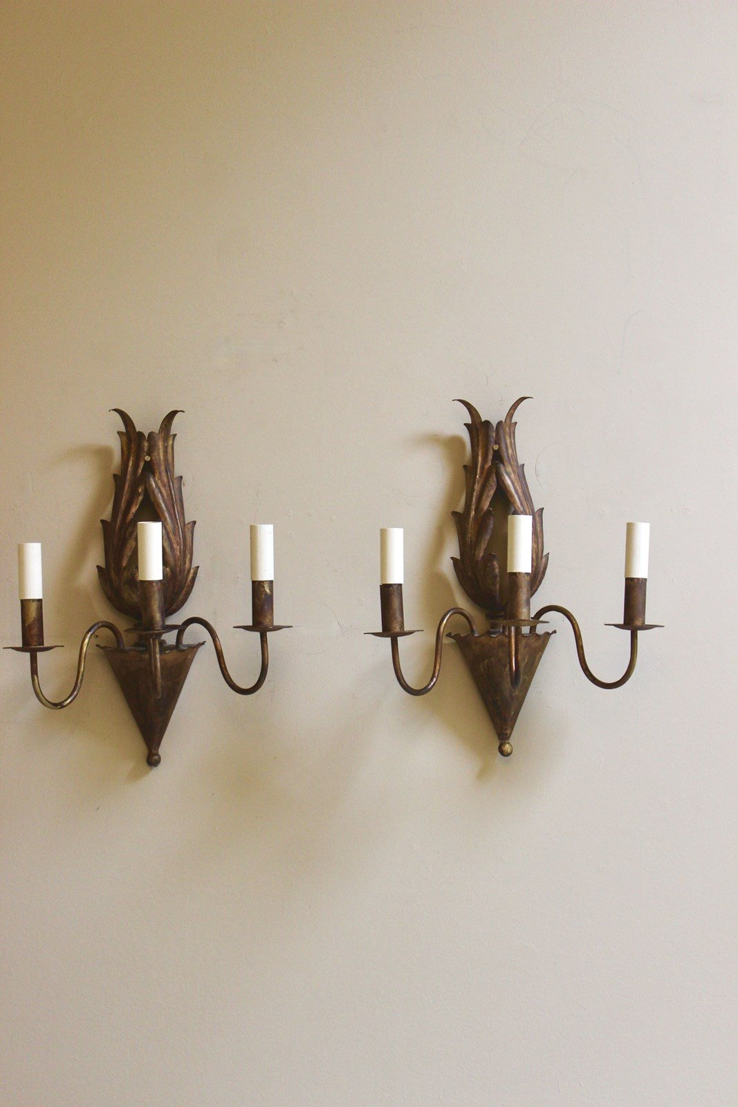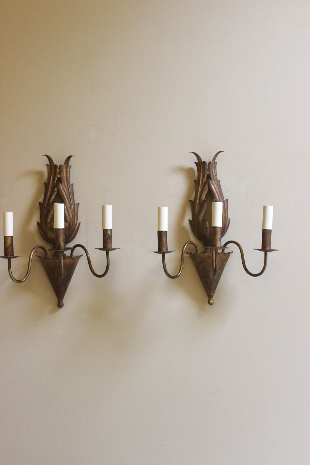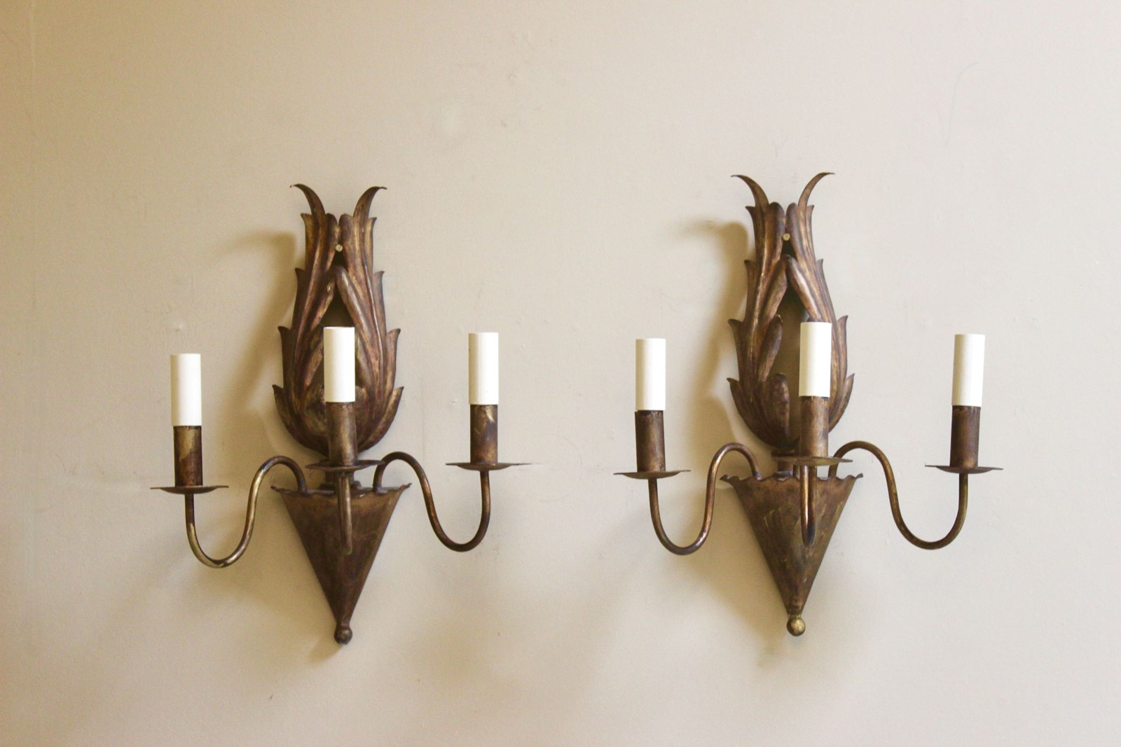 Substantial pair of architectural three branch gilt metal wall lights each with metal leaf decoration - wiring exit point is 14 cms up from the base.