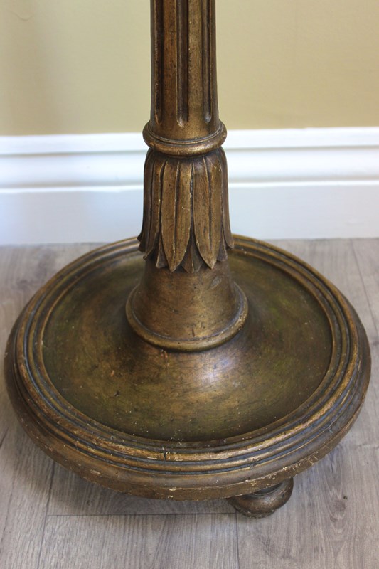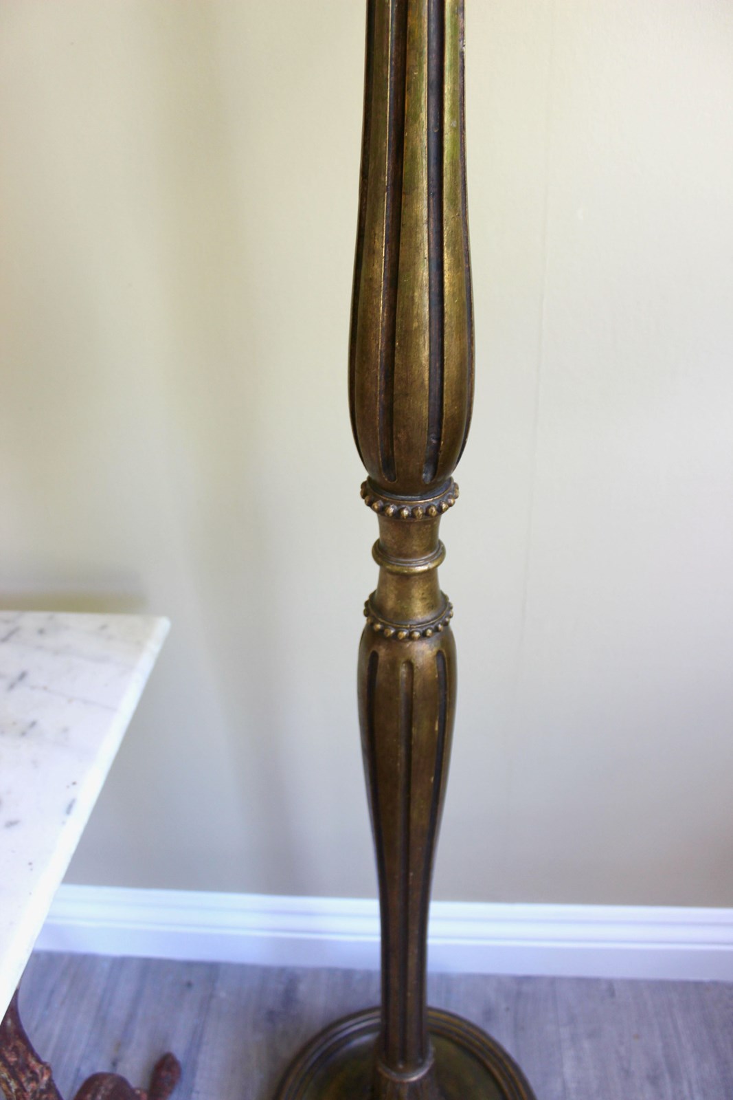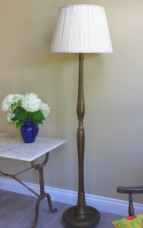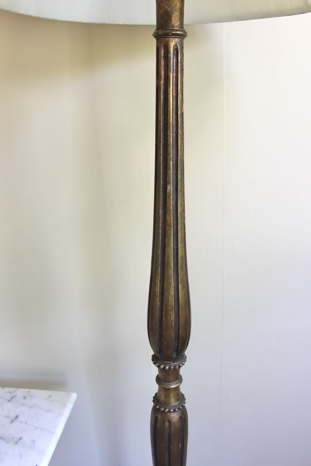 Superb example of an English giltwood floor lamp circa 1930 perfect country house floor lamp taller than average so would suit a large room, the is lamp has the most delightful patina and simple decoration we have shown it with a pleated stock shade at 50 cms dia. The shade is not included. Height to lampholder from the floor is 63 cms.