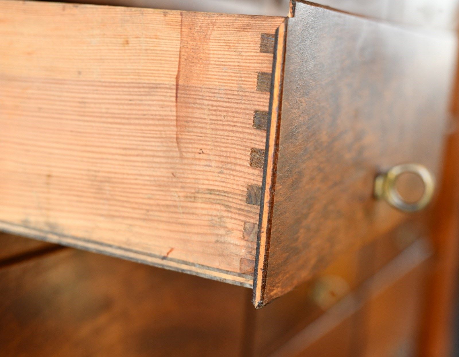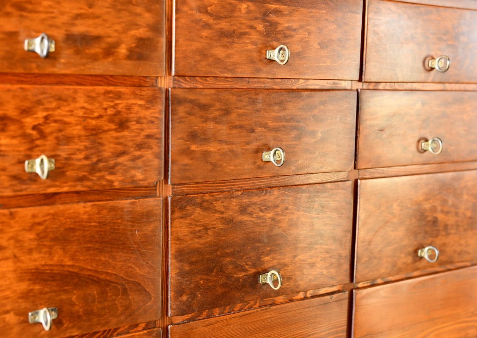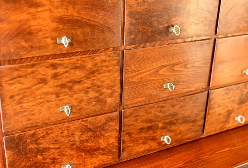 Fully restored, all drawers run smoothly and the cabinet has been given several coats of wax oil.