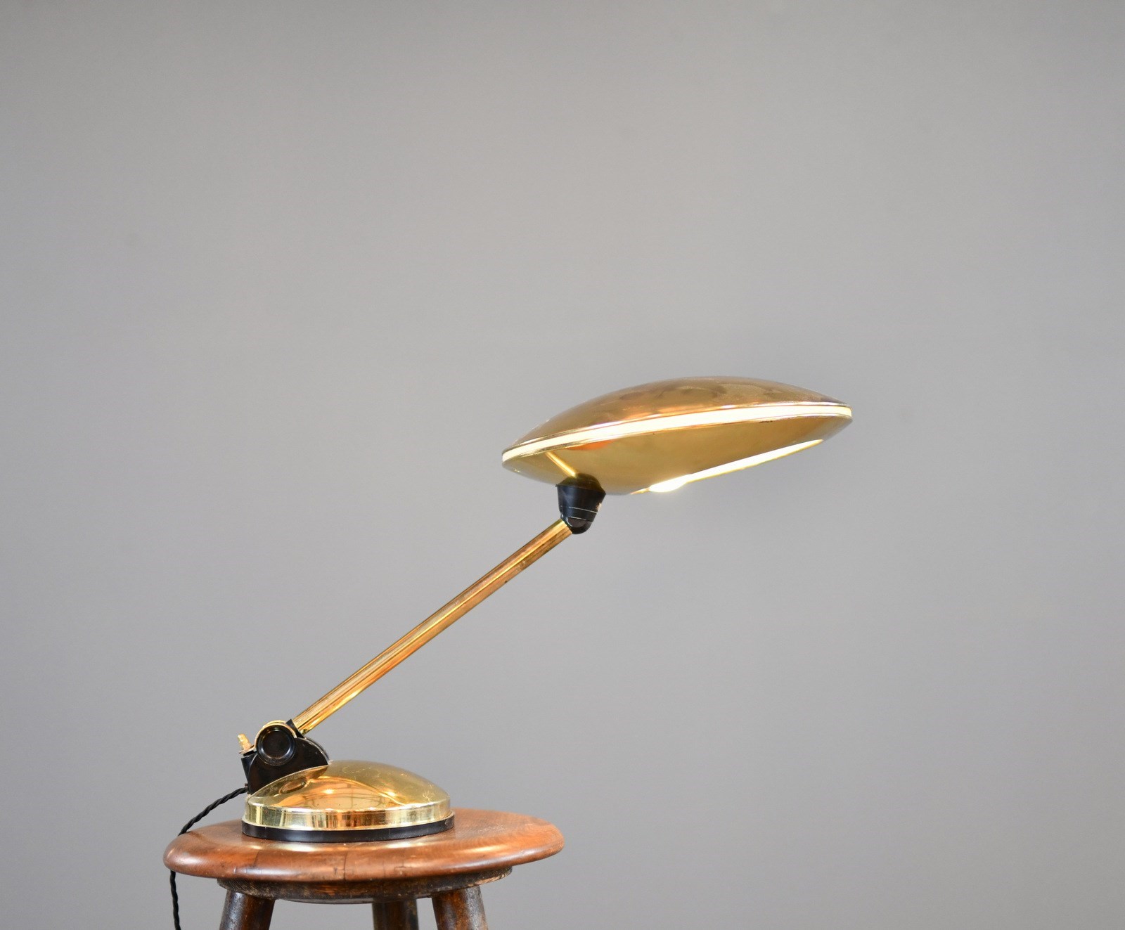 Lamp has been rewired with modern electrical components. Some small dents on the shade and patina from past use.