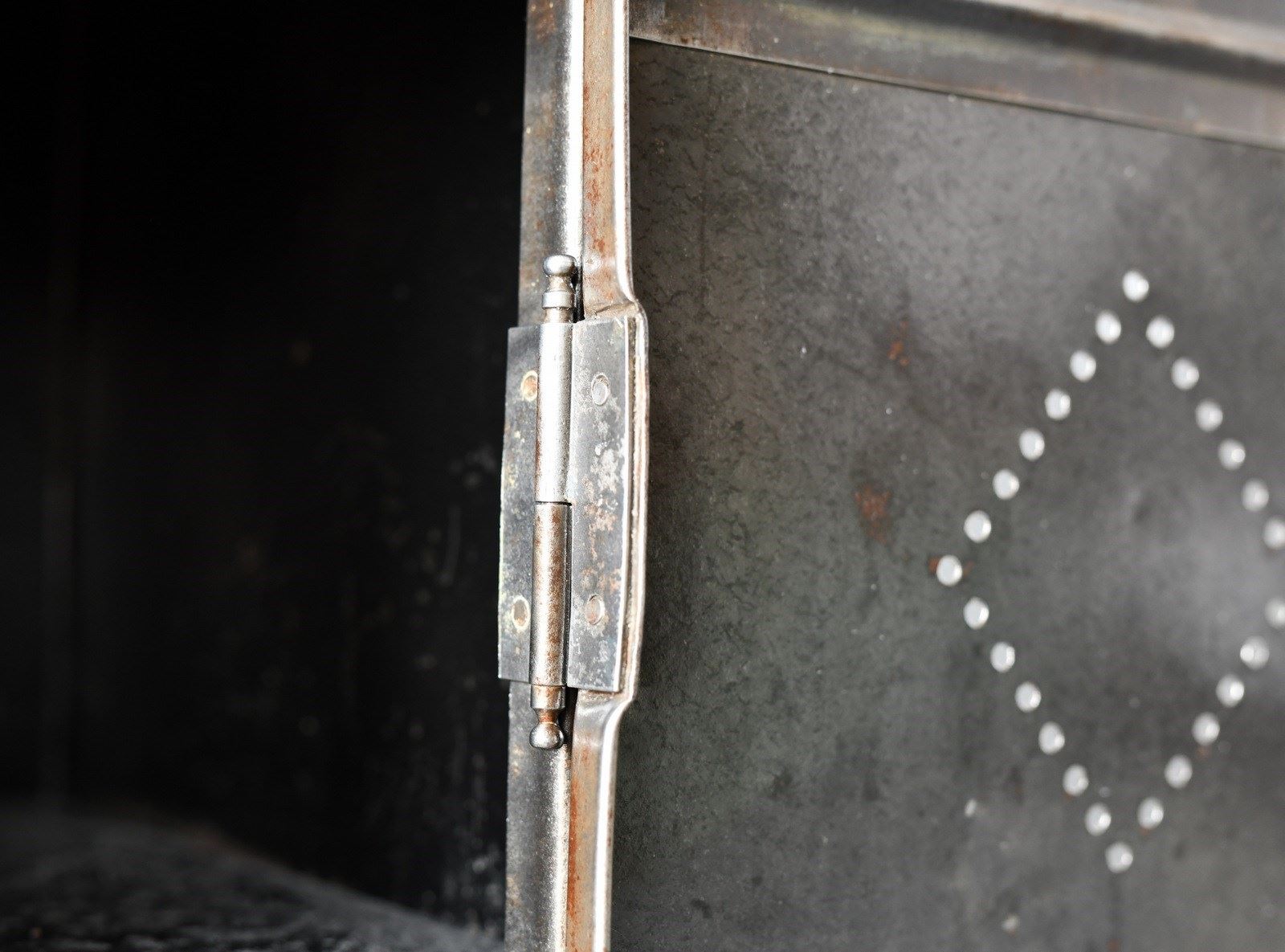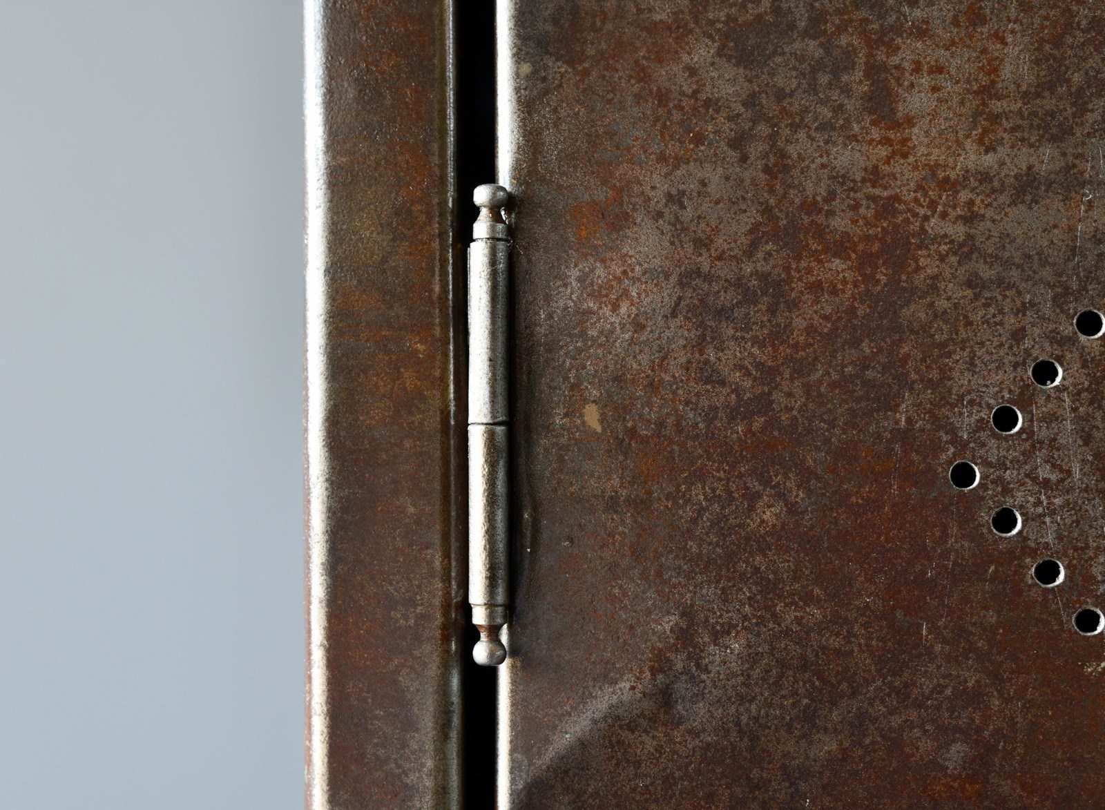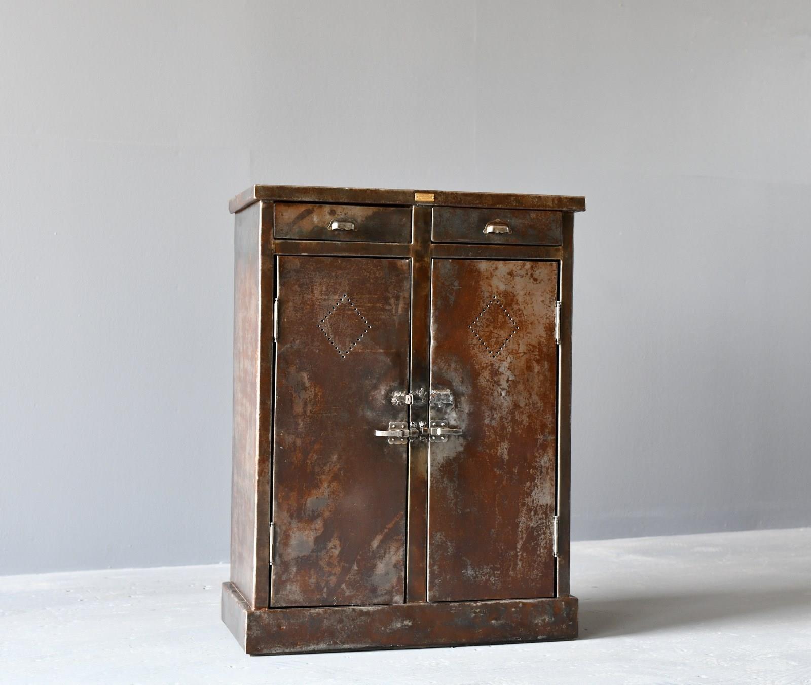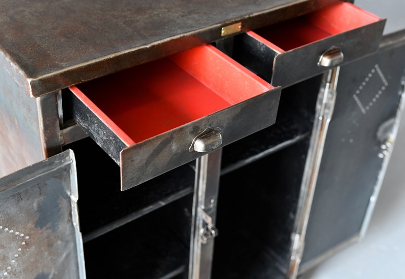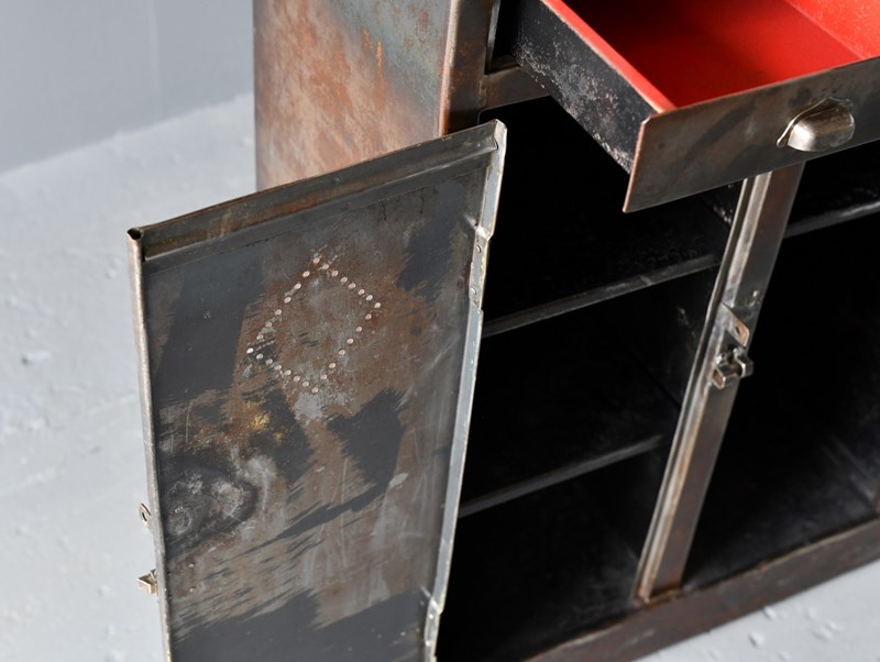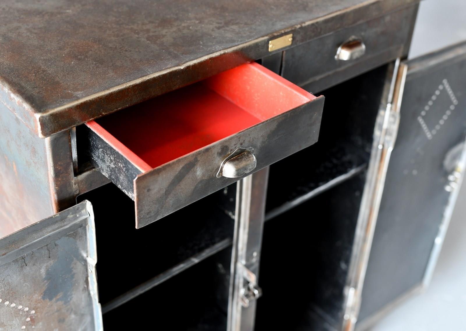 The steel shows sign of dents and dings, the cabinet has been refinished inside with black and red paint to match the original paint. The outside of the cabinet has been given several coats of clear lacquer.