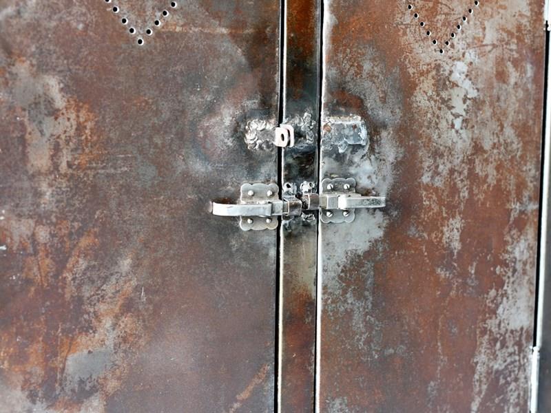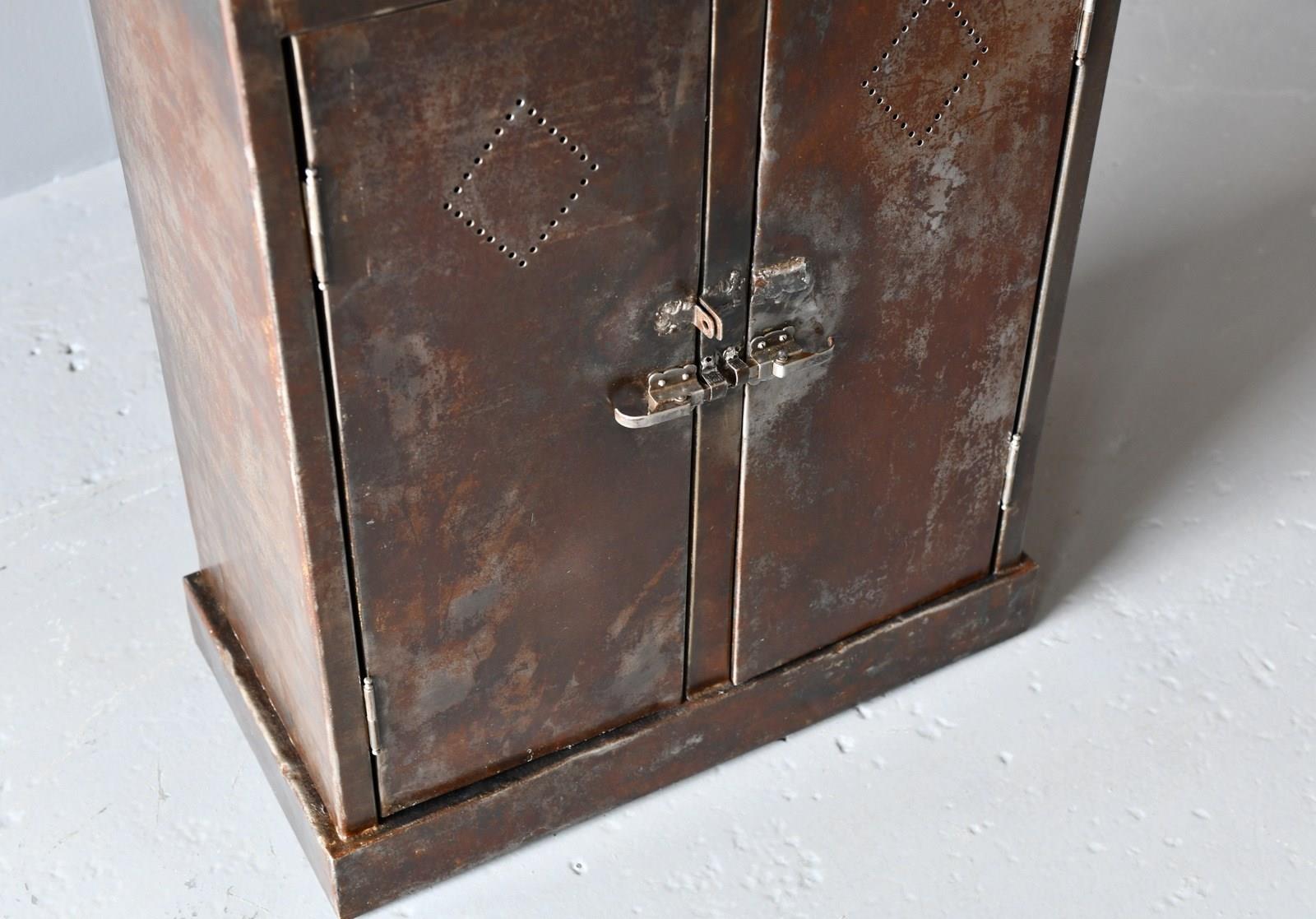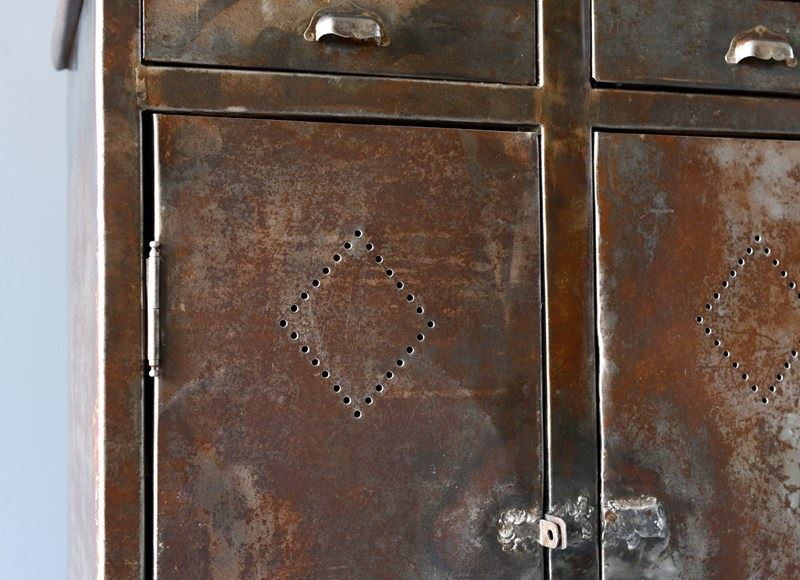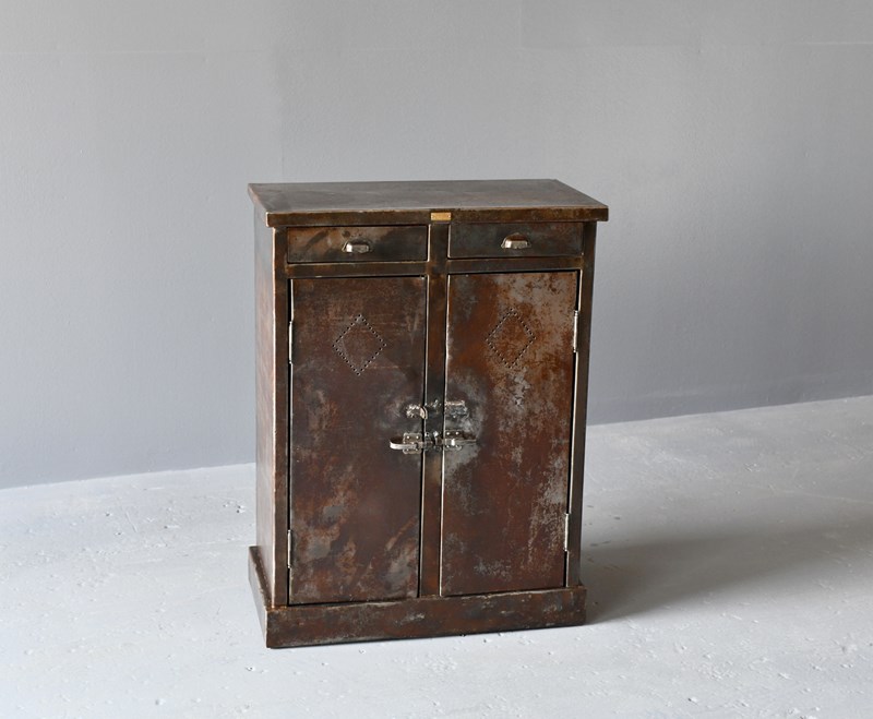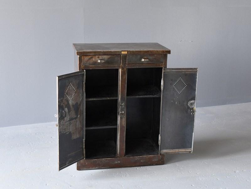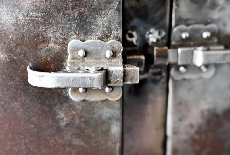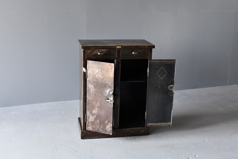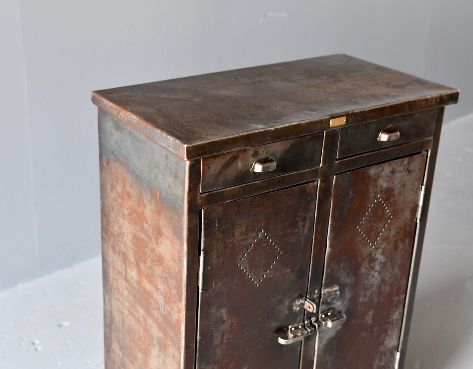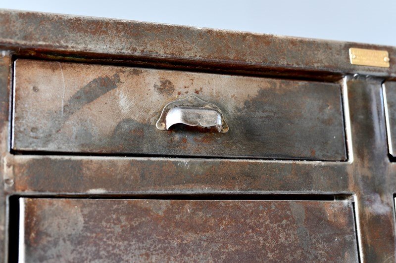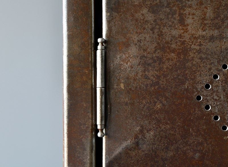 The steel shows sign of dents and dings, the cabinet has been refinished inside with black and red paint to match the original paint. The outside of the cabinet has been given several coats of clear lacquer.