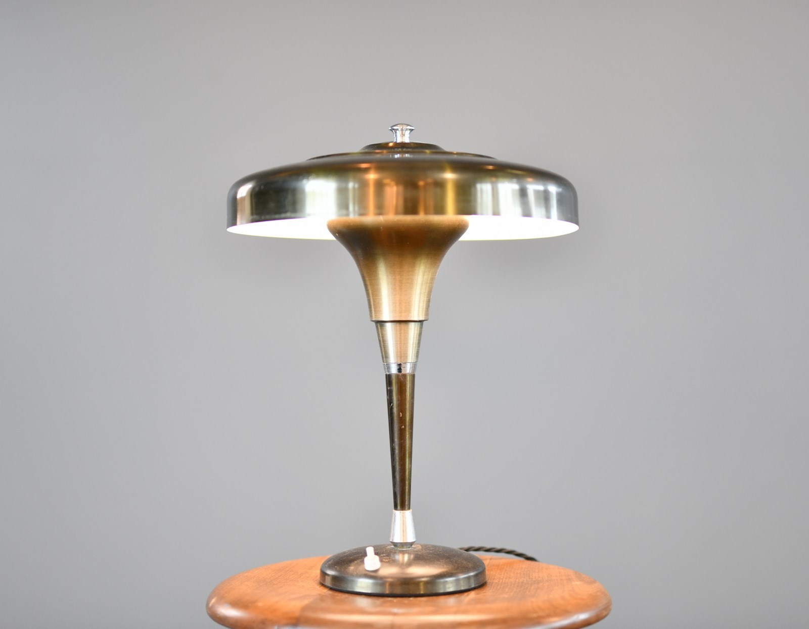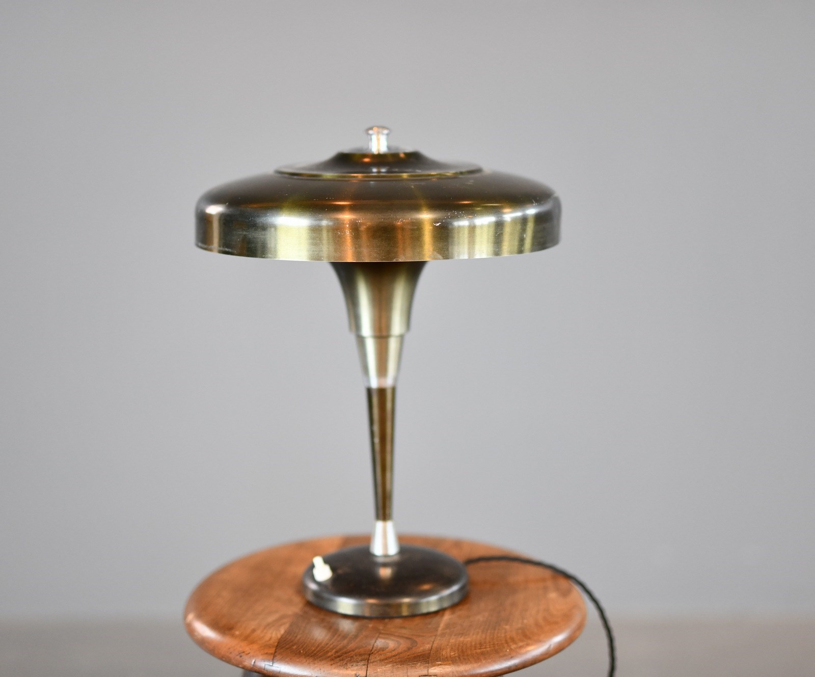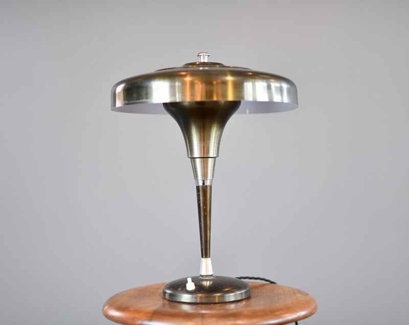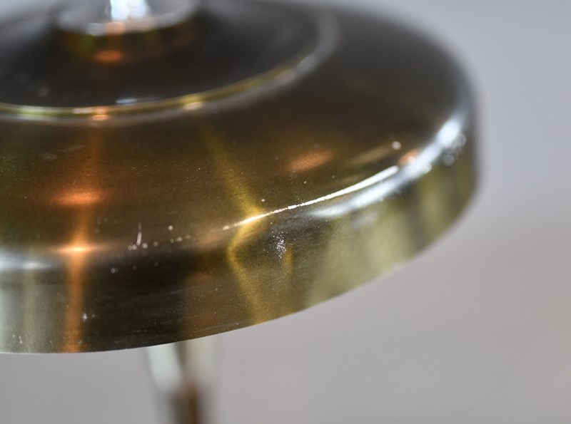 Lamp has been rewired with modern electrical components. Some small dents on the shade and patina from past use.