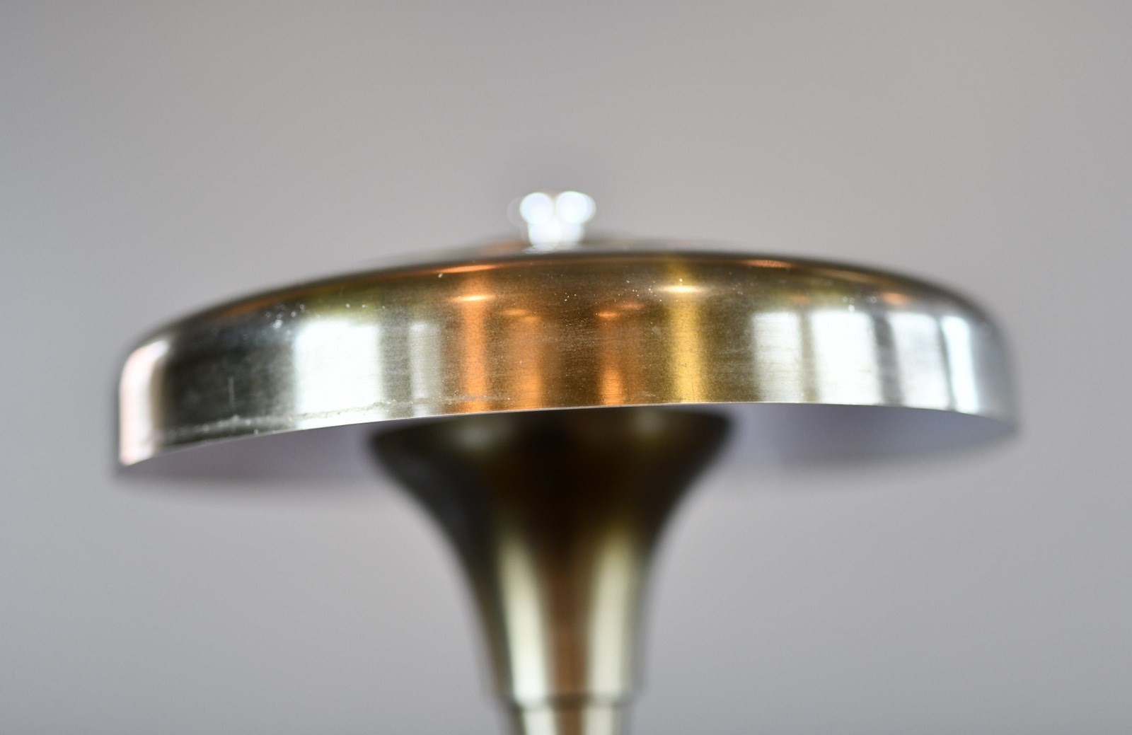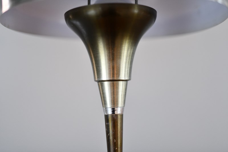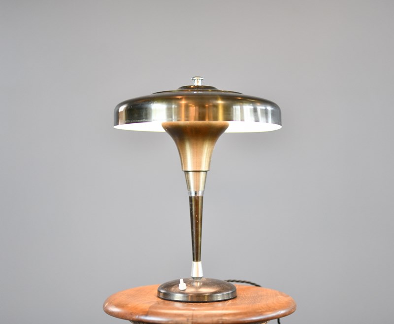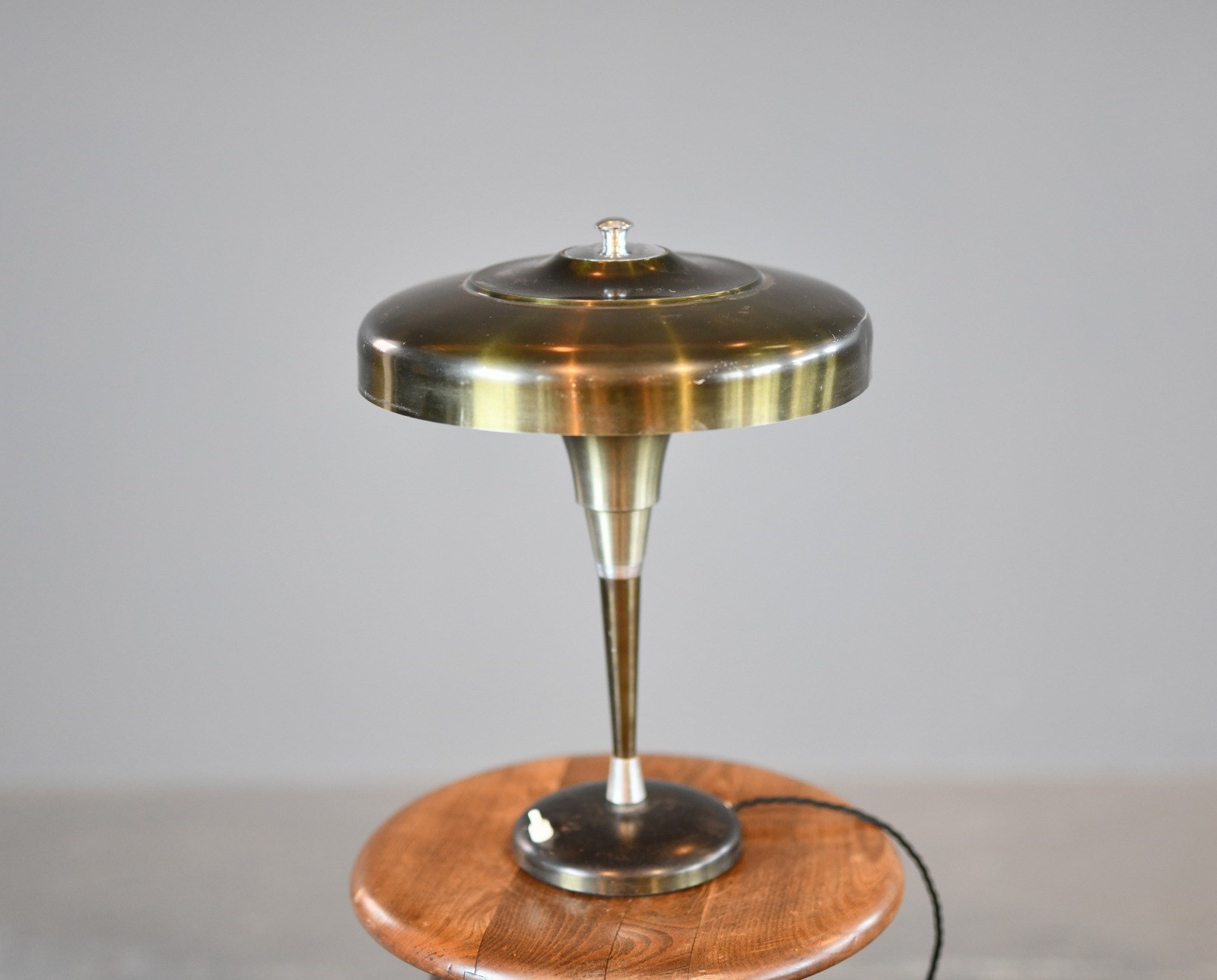 Lamp has been rewired with modern electrical components. Some small dents on the shade and patina from past use.