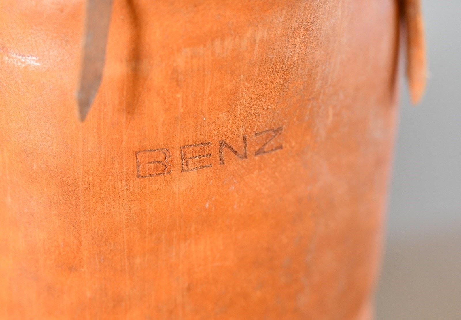 The leather has been cleaned and treated to make it more supple and give it a light sheen. There are some cracks and wear to the leather in places. The inside was previously stuffed with straw so still has a slight smell of straw.