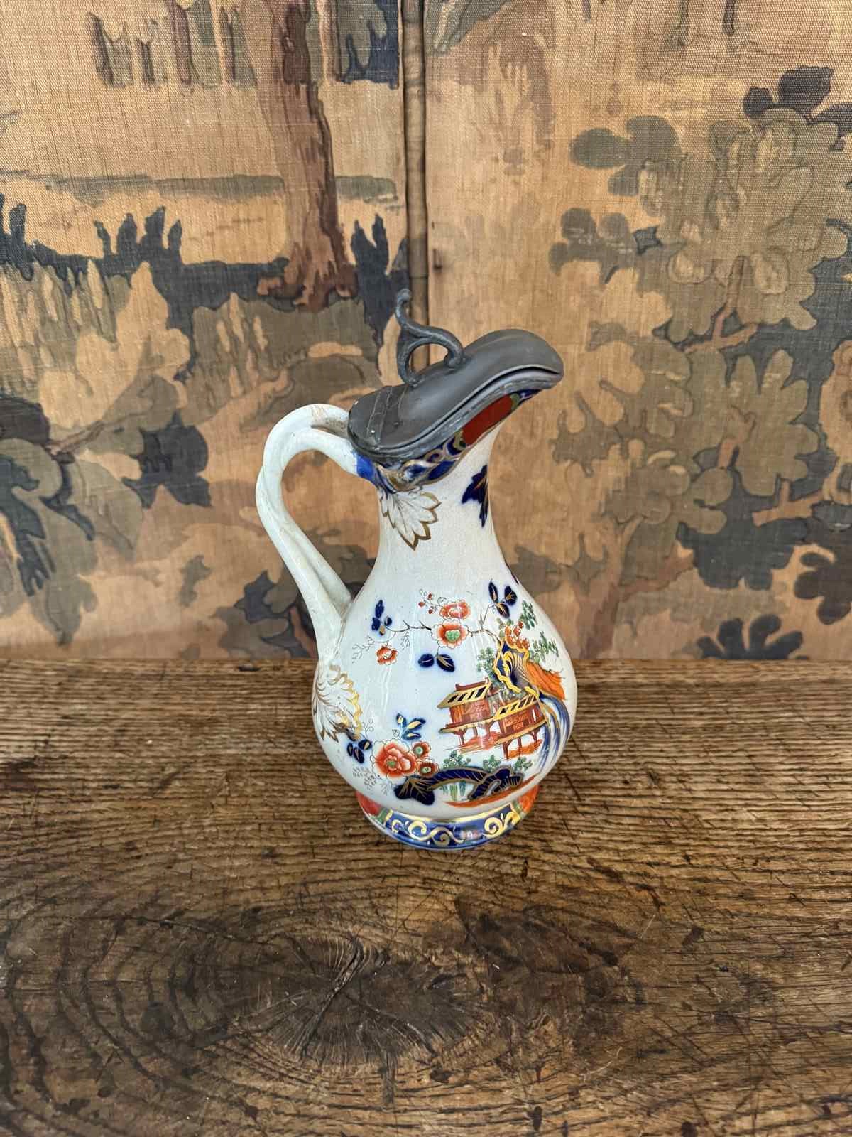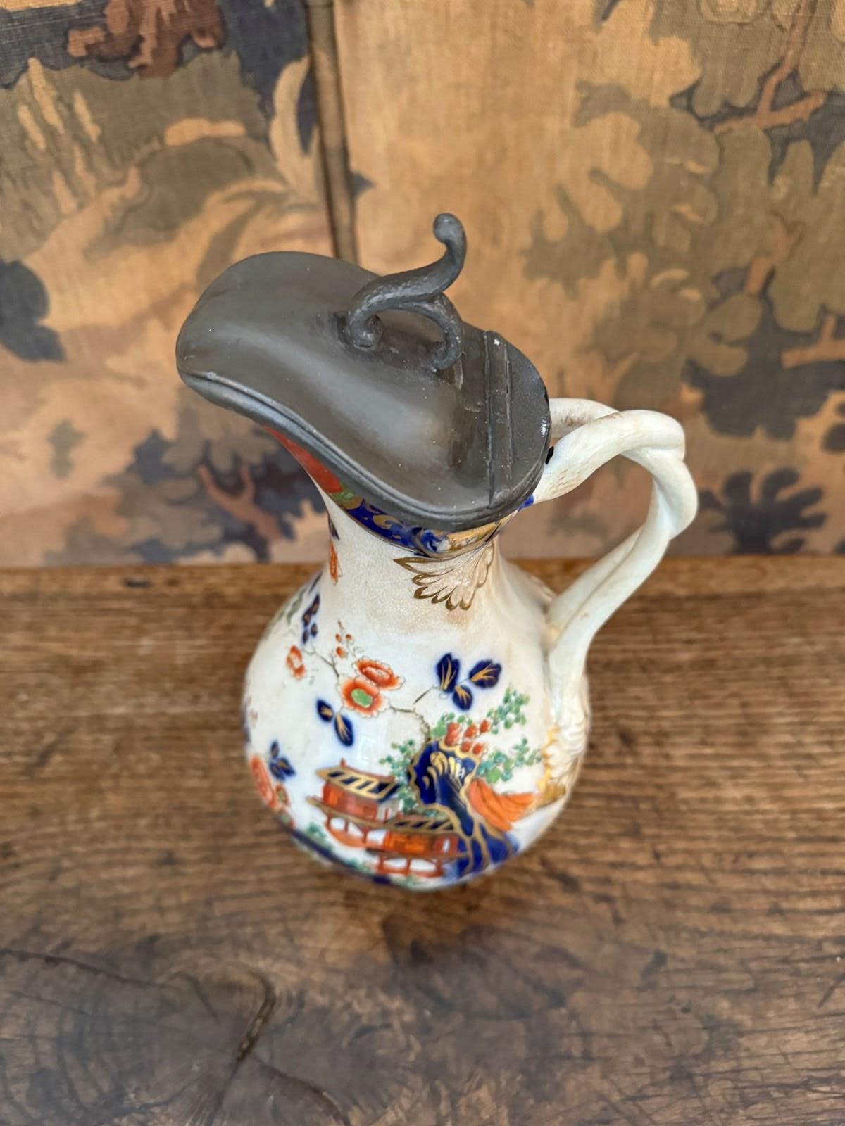 Pretty glazed ironstone pottery jug with hinged pewter lid.