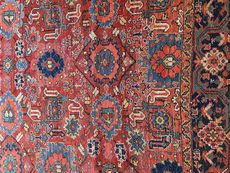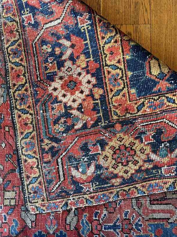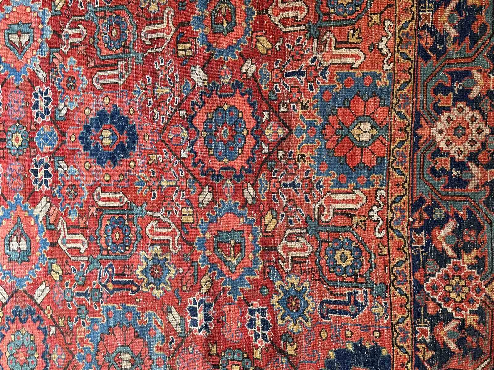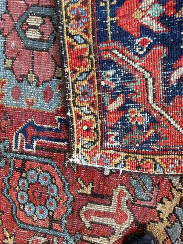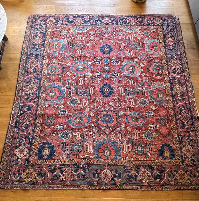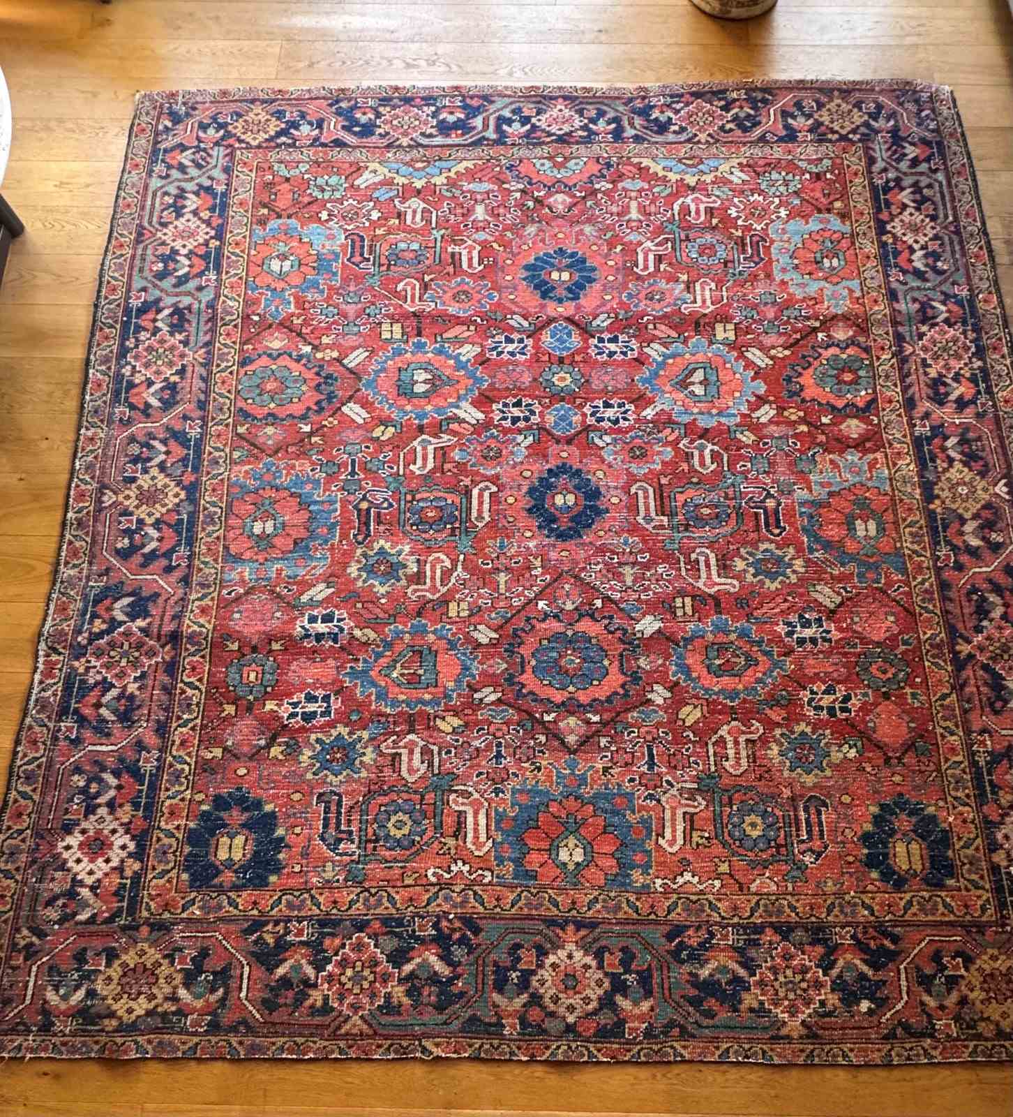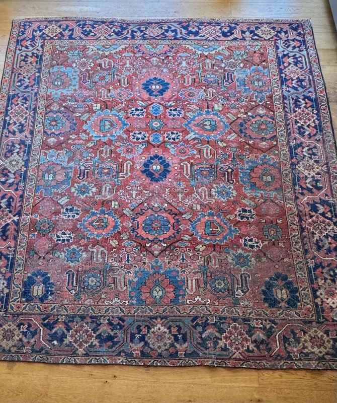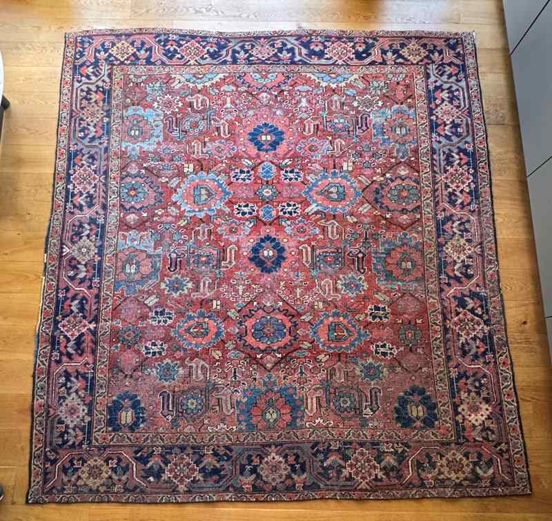 A beautiful large early 20th century Heriz carpet. Handmade in wool. Some wear and recolouring, but otherwise in good overall condition. Good size as nearly square.