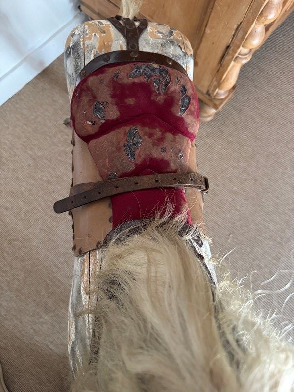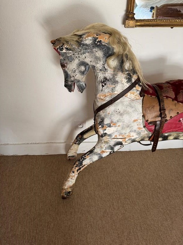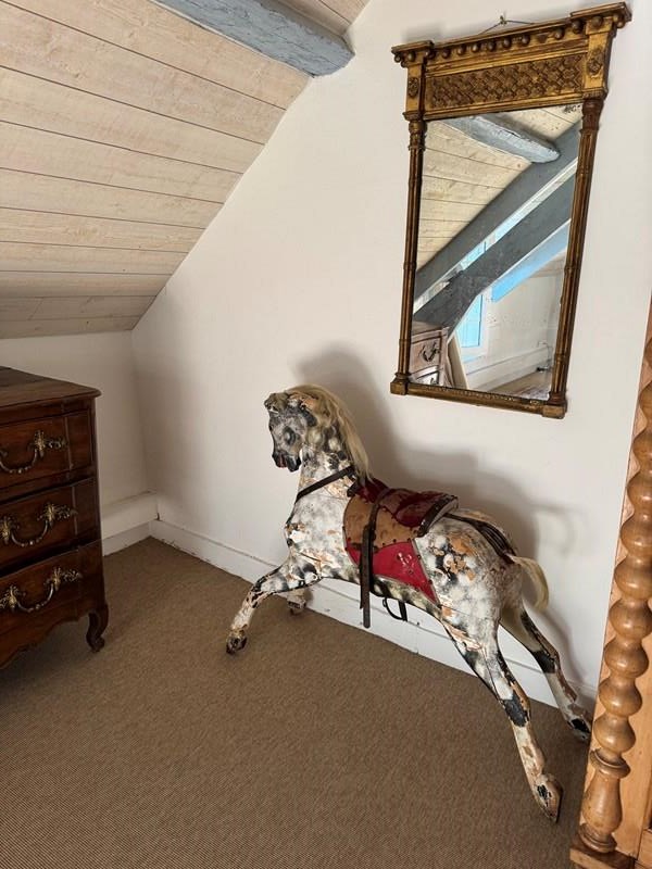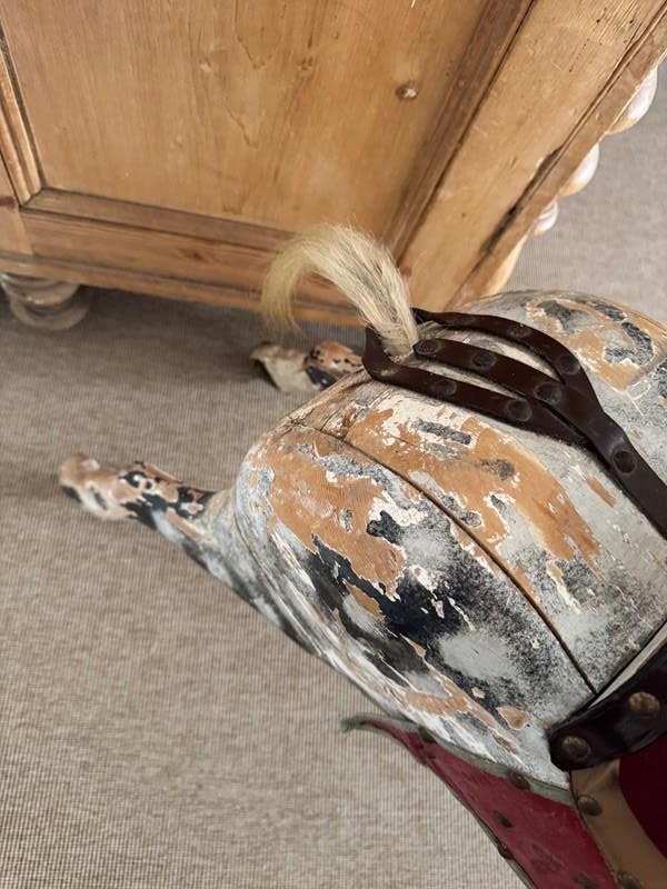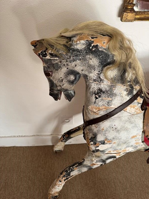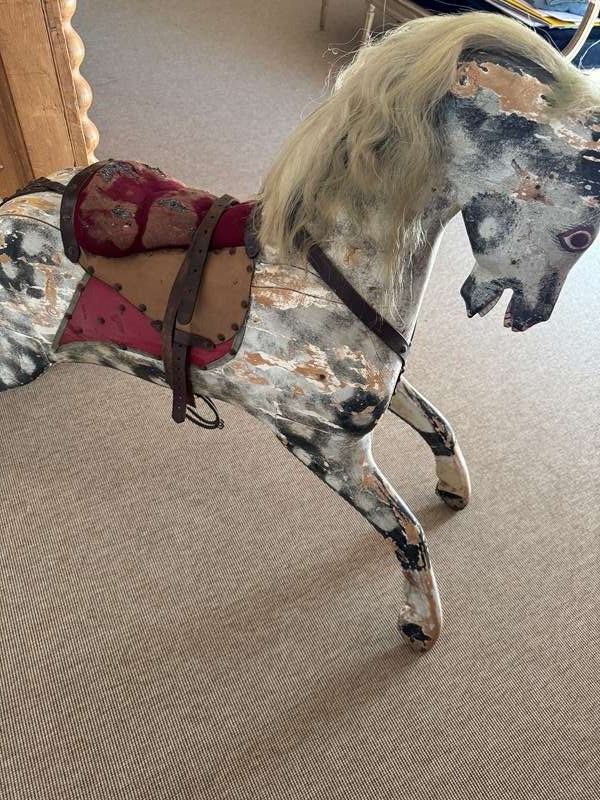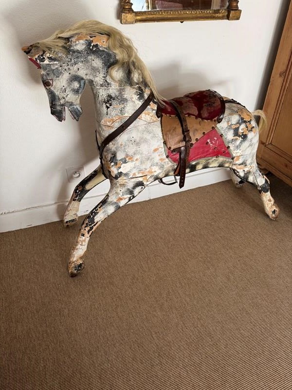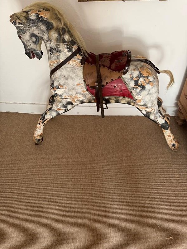 A beautiful mottled grey wooden part rocking horse. Full of character great decorative object in an entrance or bedroom. Some visible losses but still strong and sturdy. Has been well used.
