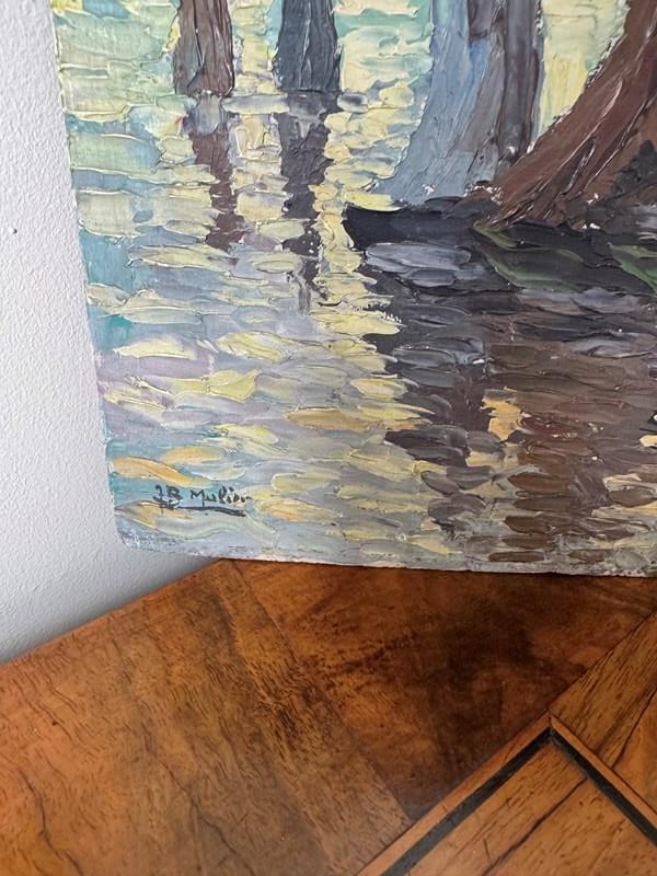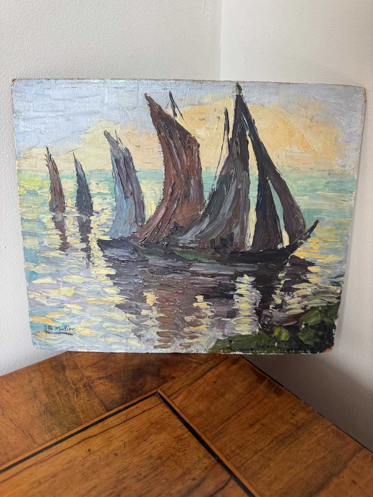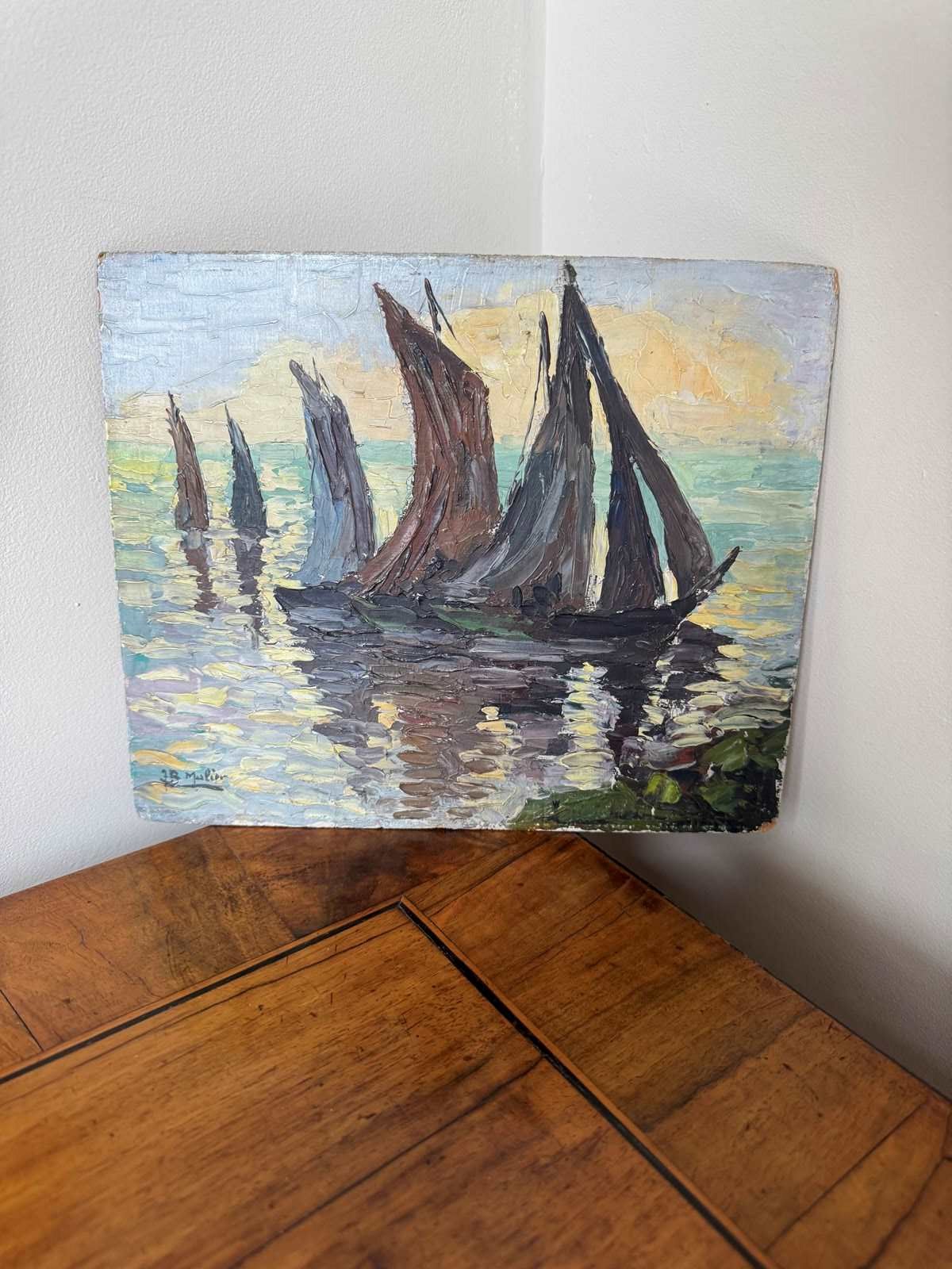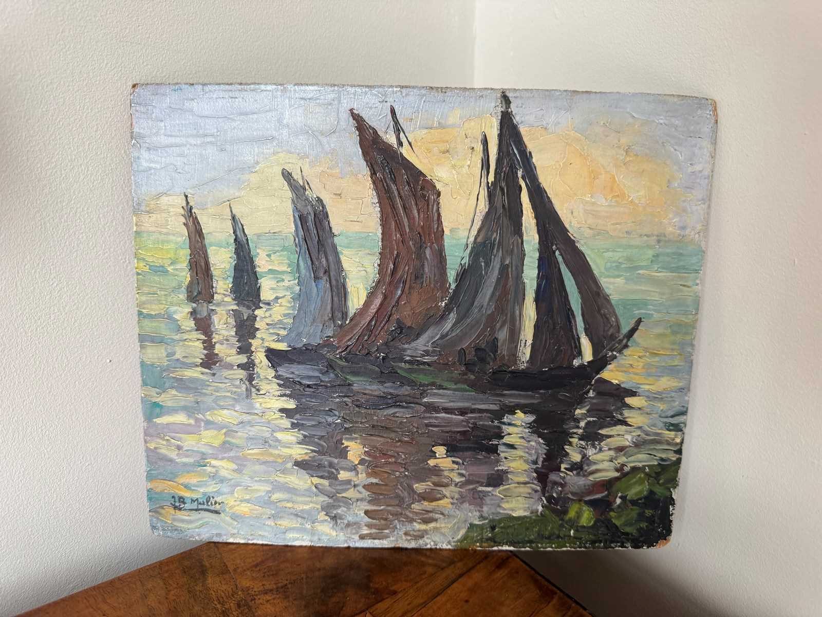 Pretty Impressionist style oil on board painting of sailboats. Signed JB Muller.