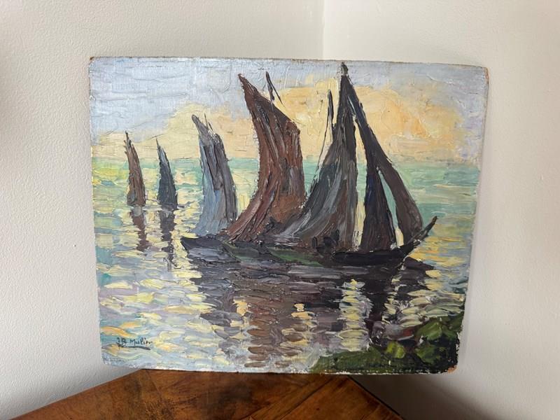 French Small Oil Painting On Board Of Sail Boats