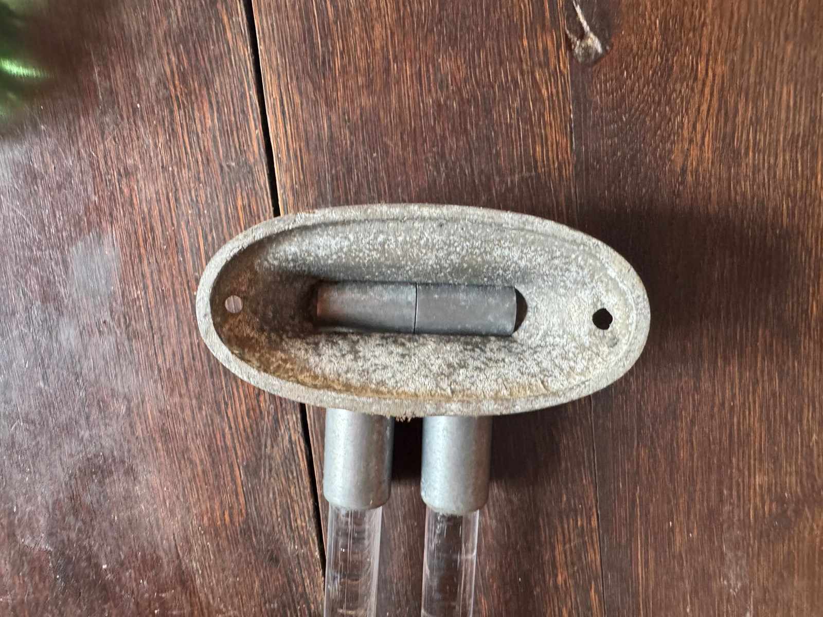 Àn elegant French modernist glass (small chip) and chrome plated two armed towel rail. Some wear to the chrome. Very well made.