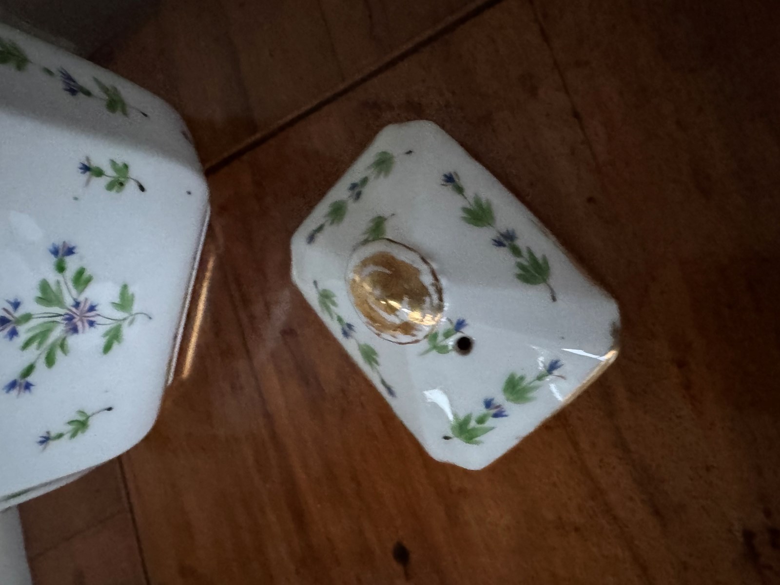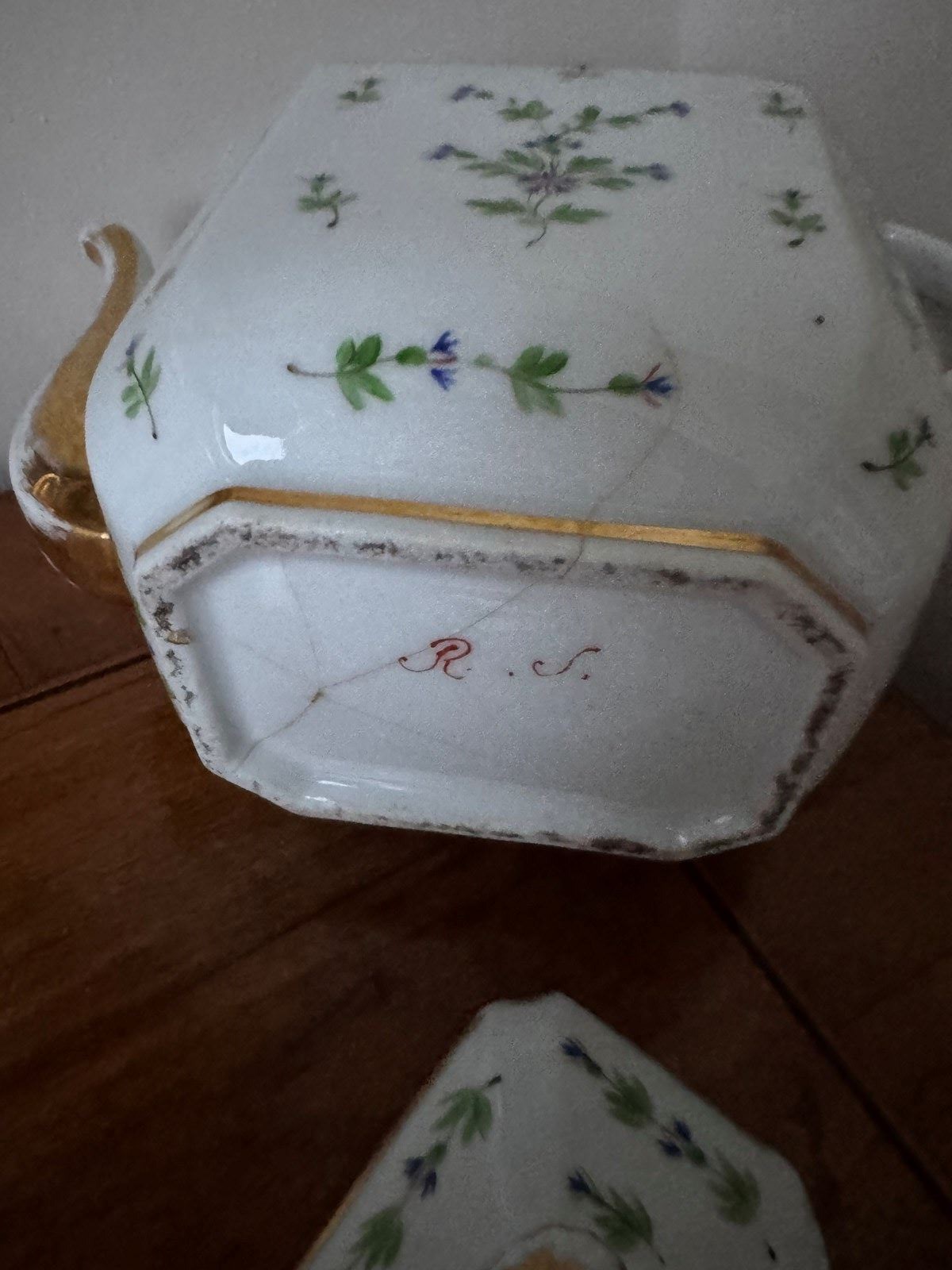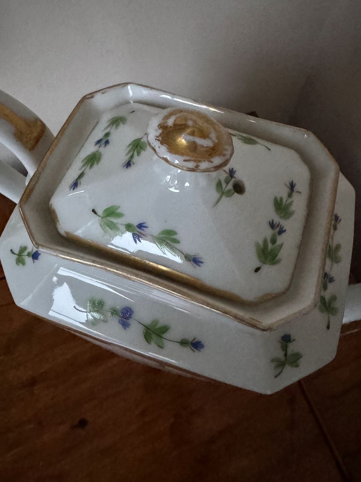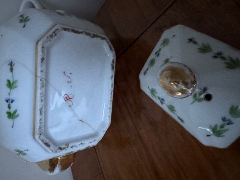 A really beautiful French Antique teapot. The teapot has historic damage, hairline and other cracks so is sold as a decorative object not to be used. Lovely to sit on a shelf or cabinet.