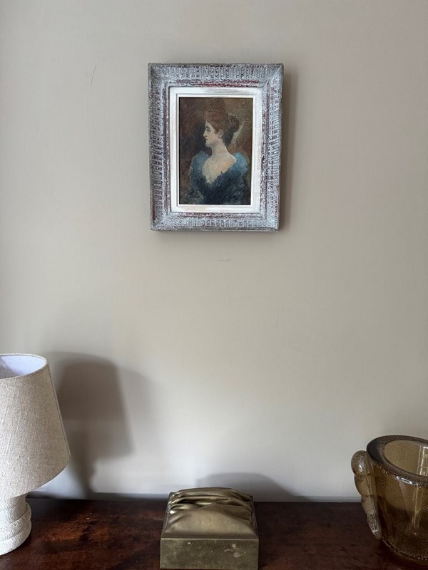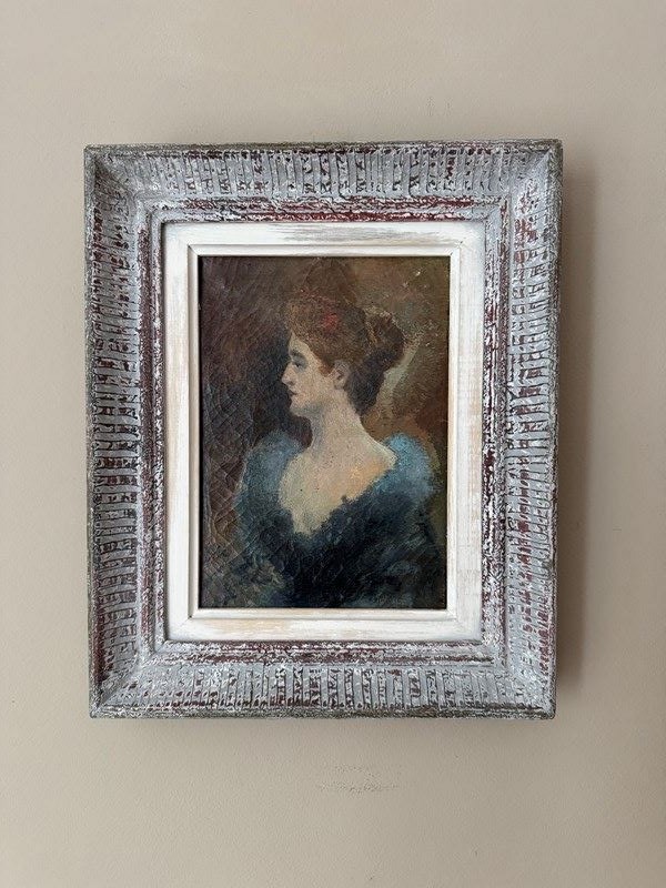 Beautiful small oil on canvas portrait painting of a lady. Indistinctly signed.