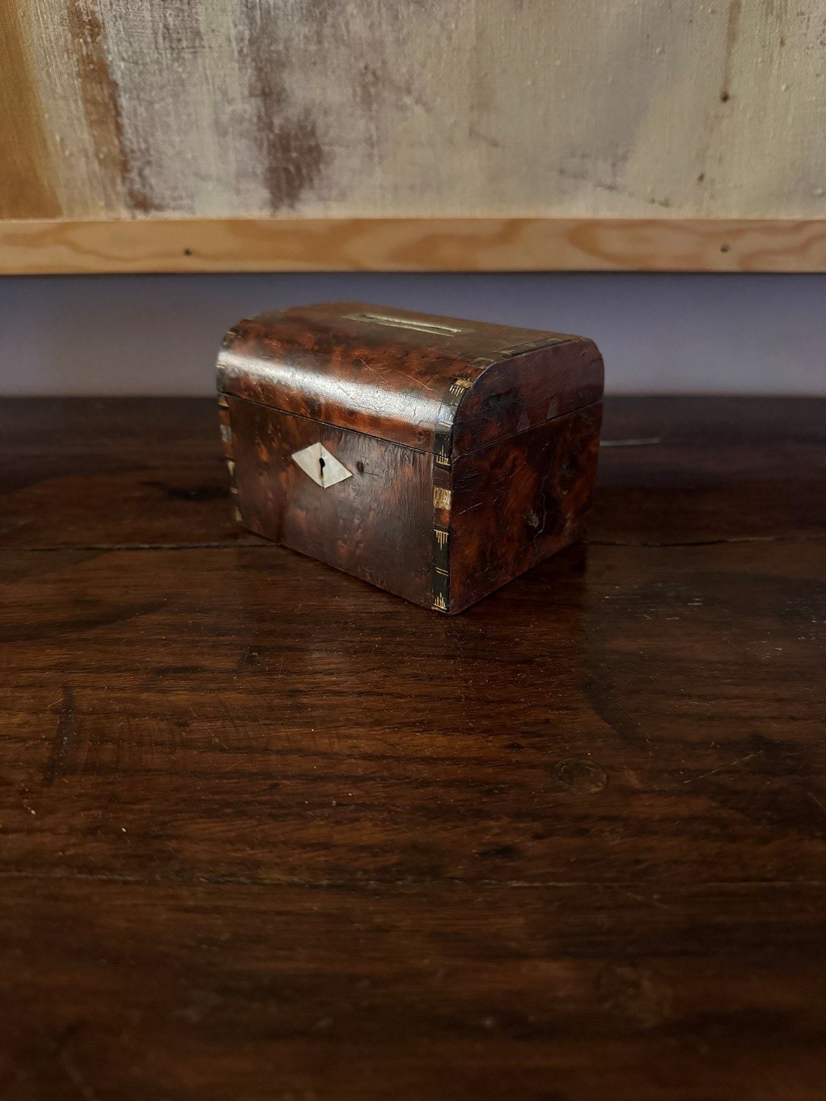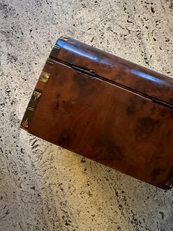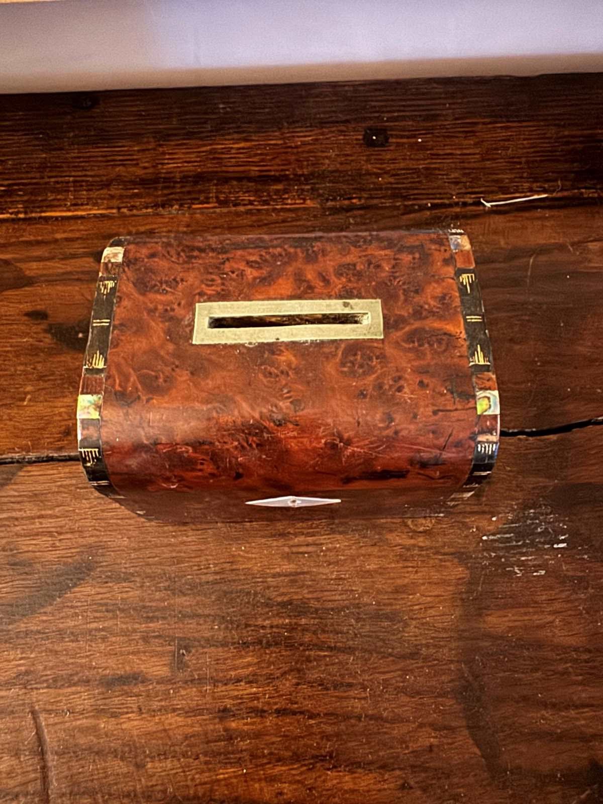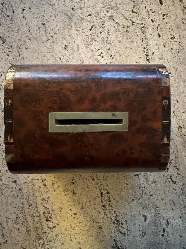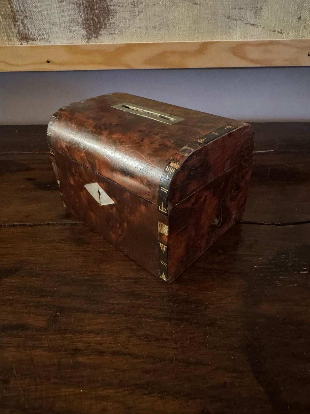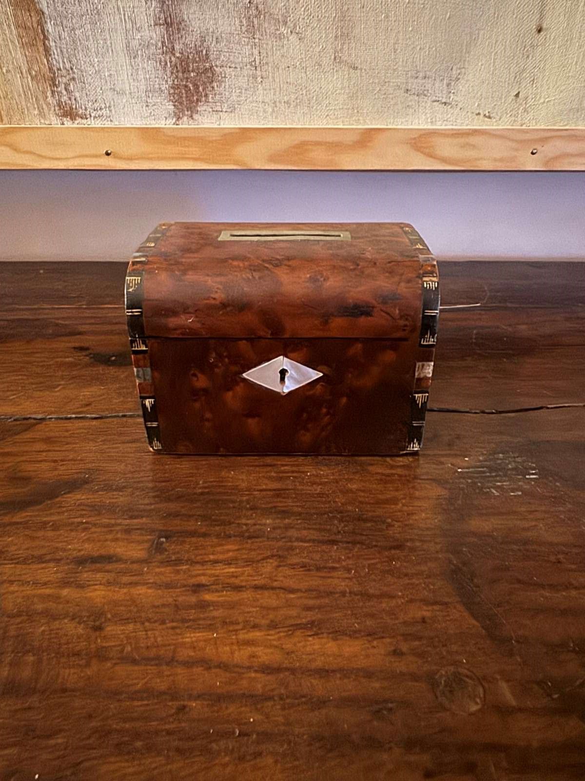 Small Victorian burr walnut and mother of pearl money box. Minor damage. Great gift idea.