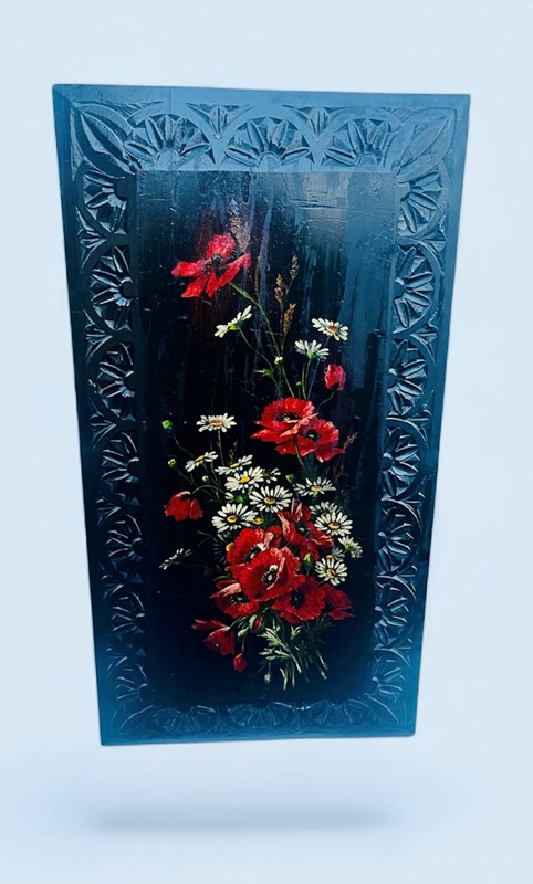 A wonderful carved, hand painted wall hanging with beautiful flowers. Slight surface blemishes as seen .