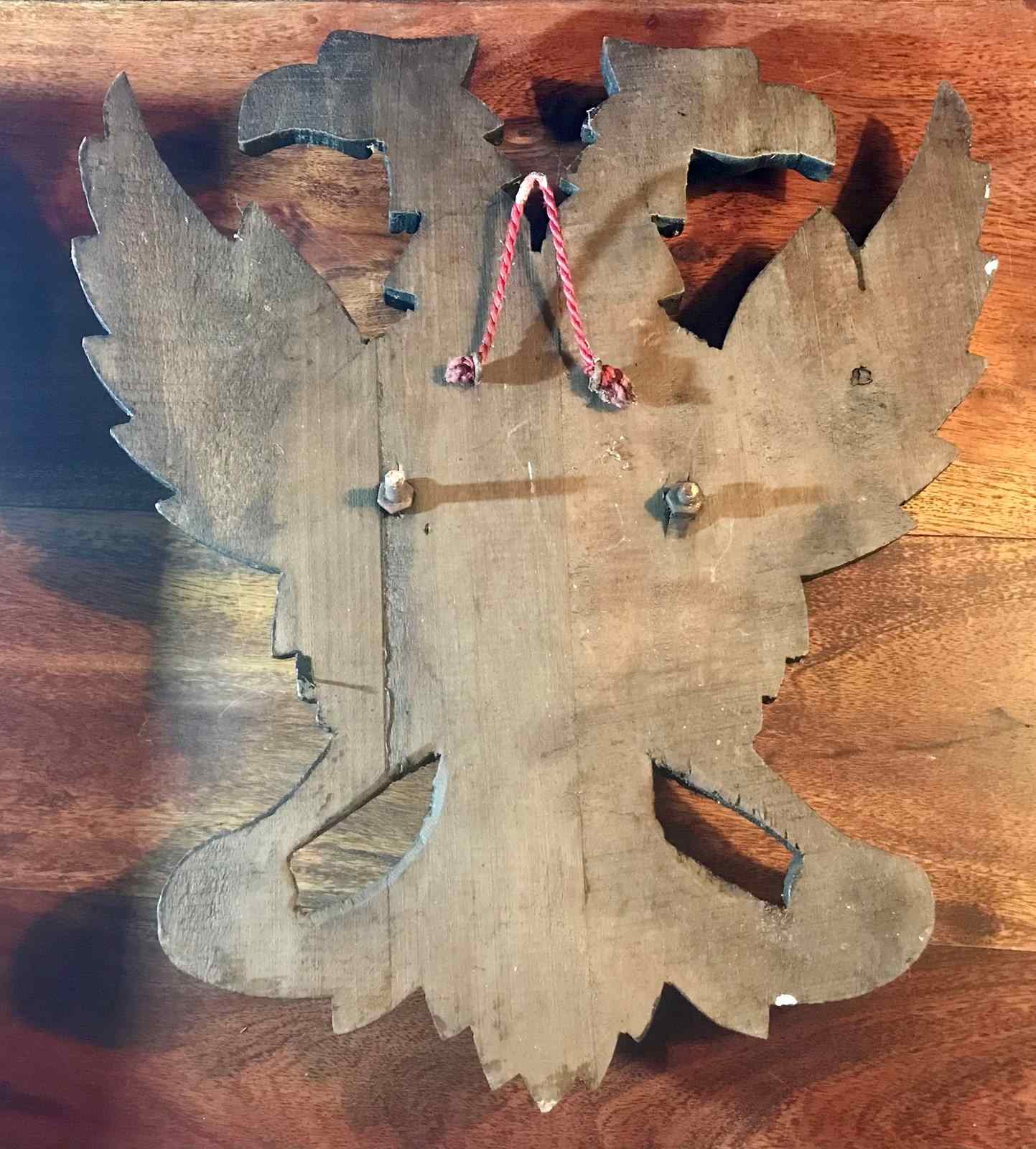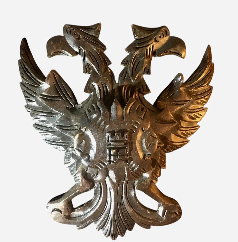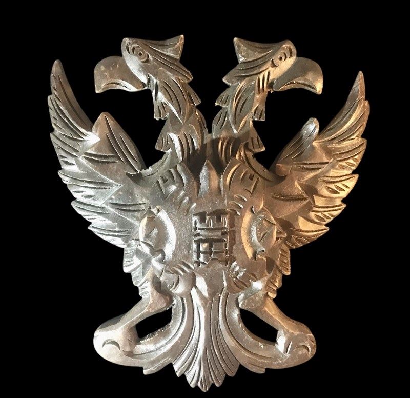 A carved wooden coat of arms with the doppel Adler. Double eagles head ,mostly from Germanic history but this one I believe is from Spain.