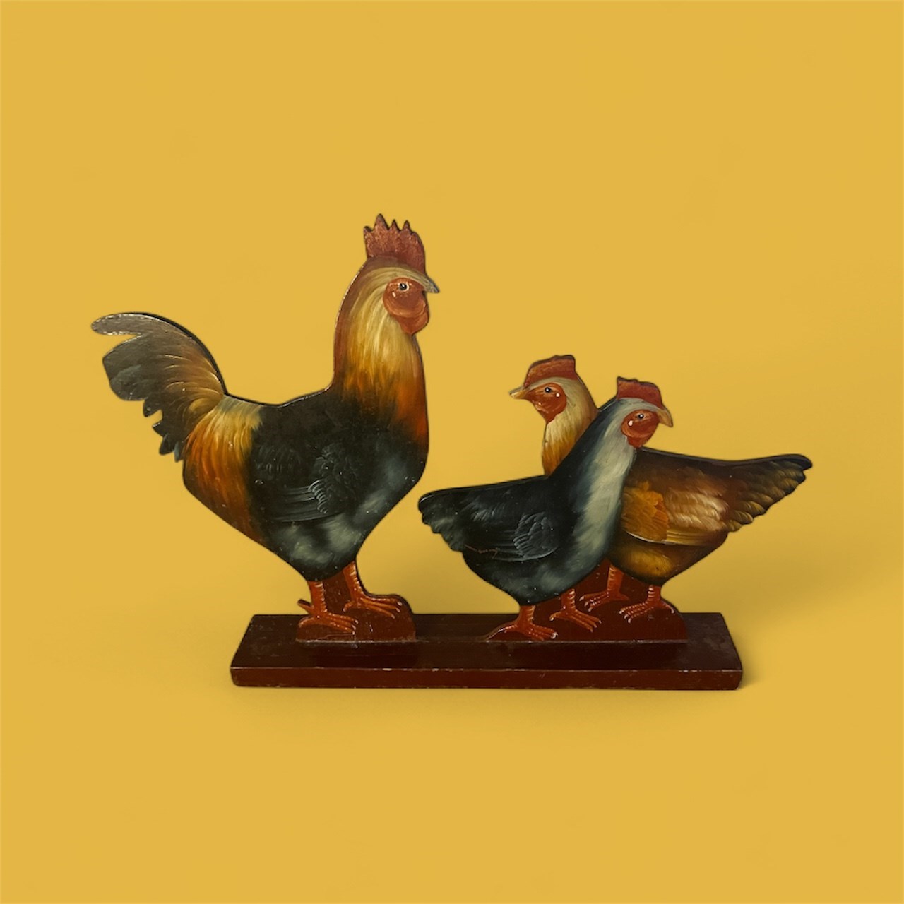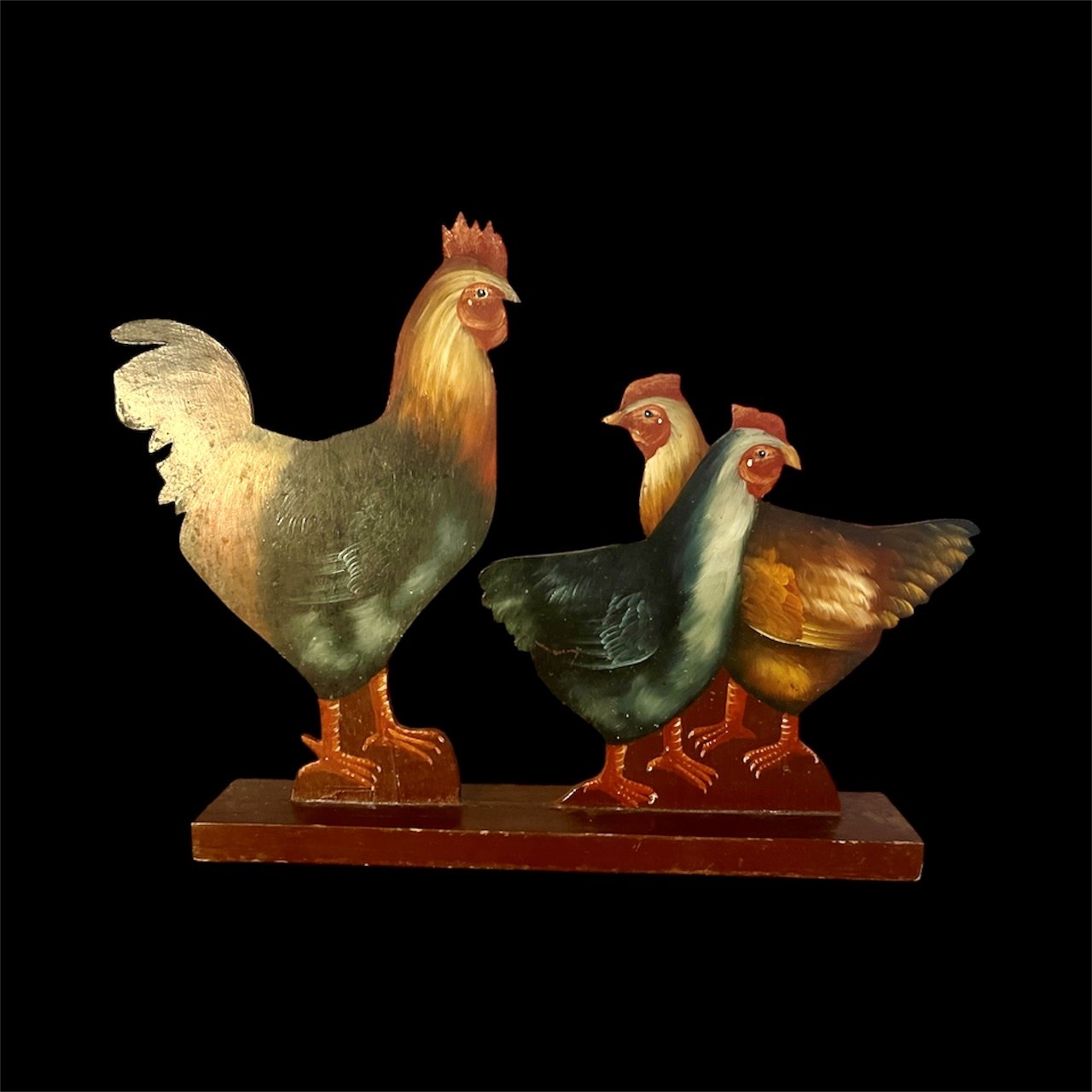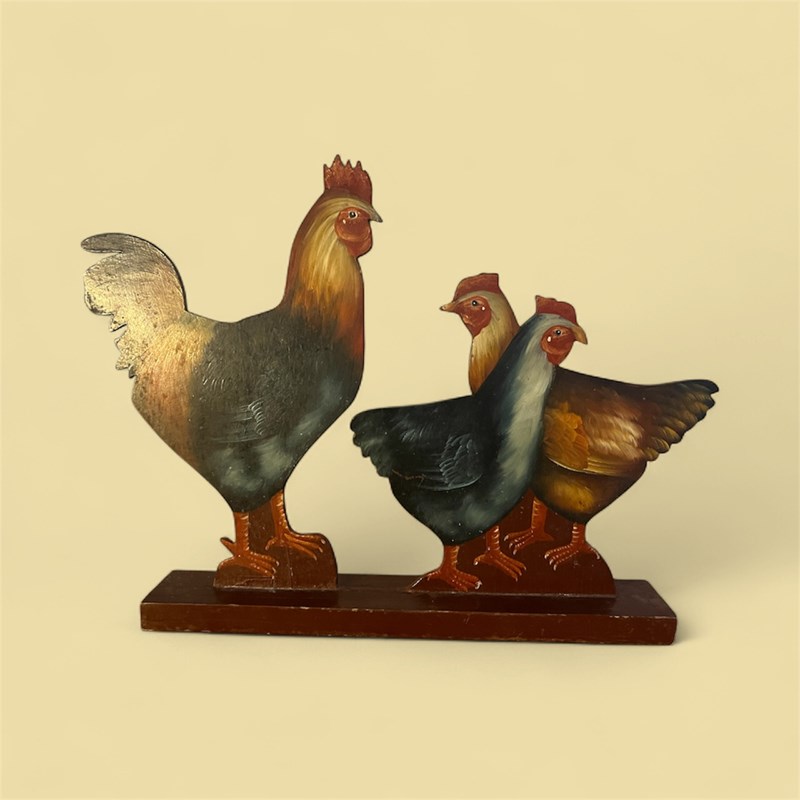 A double sided dummy board of a cockerel and 2 hens, nicely painted probably used as advertisement. A wooden plynth and wood carved chickens hand painted.