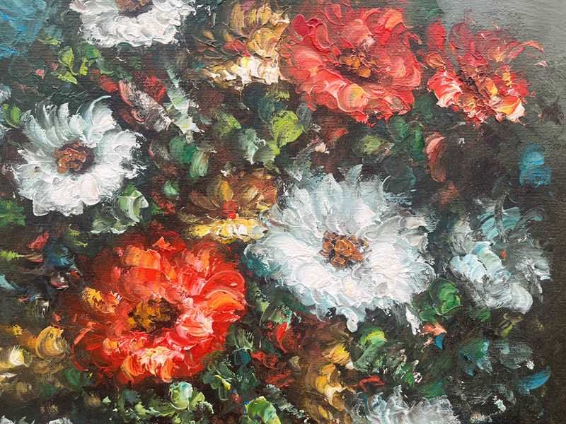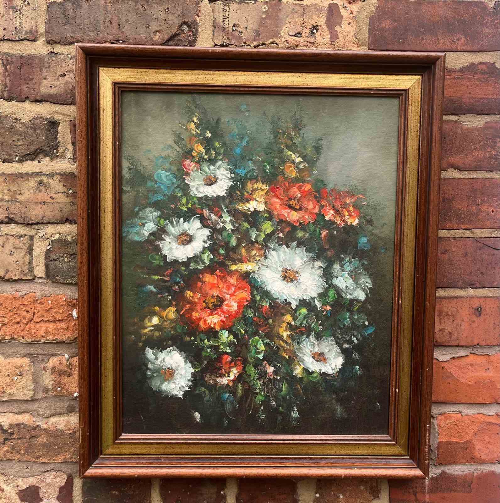 A recent painting of flowers probably painted before the millennium and nicely framed.