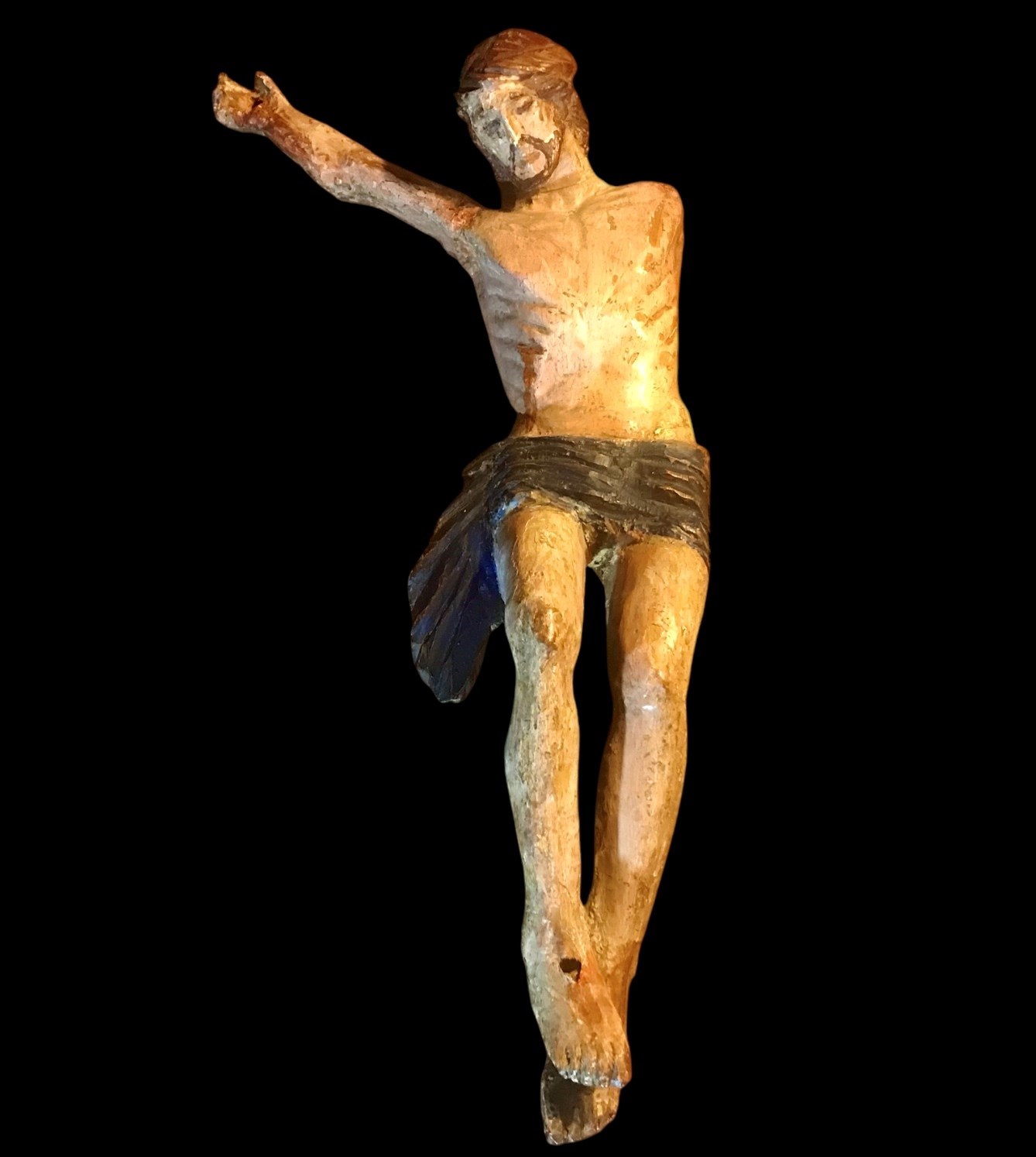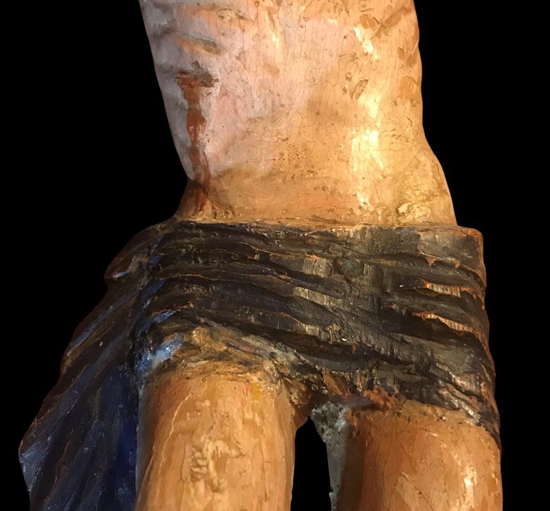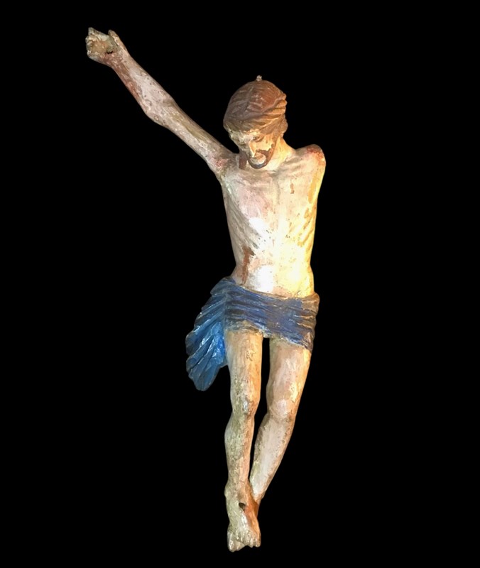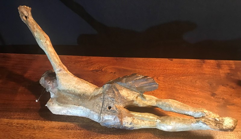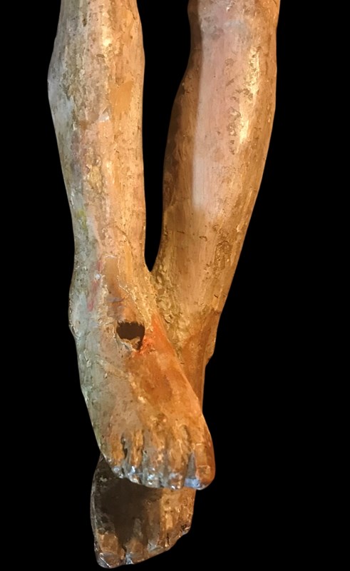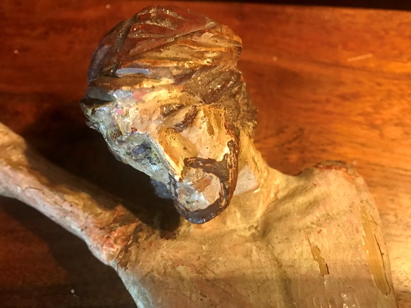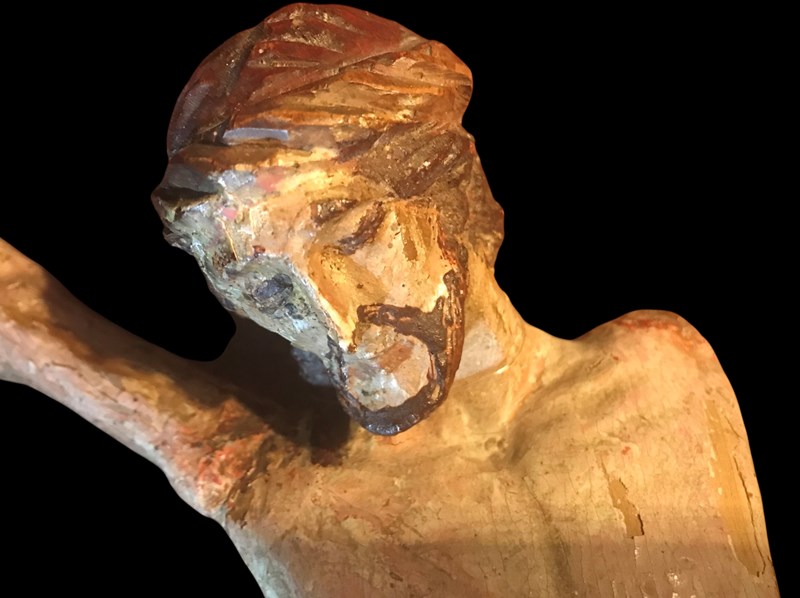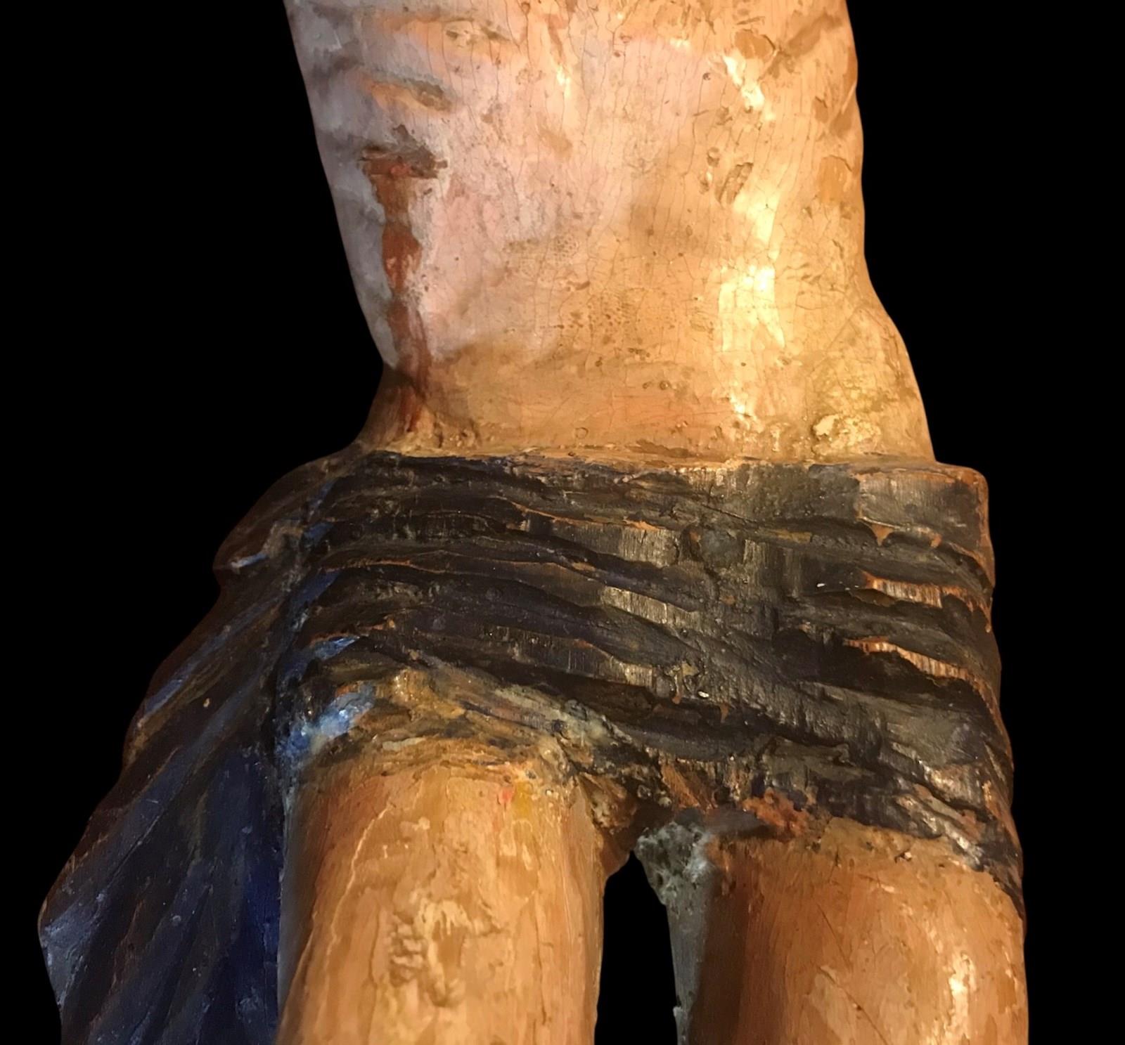 traces of paint loss and the wood showing through, one arm missing but still this is a great old piece.