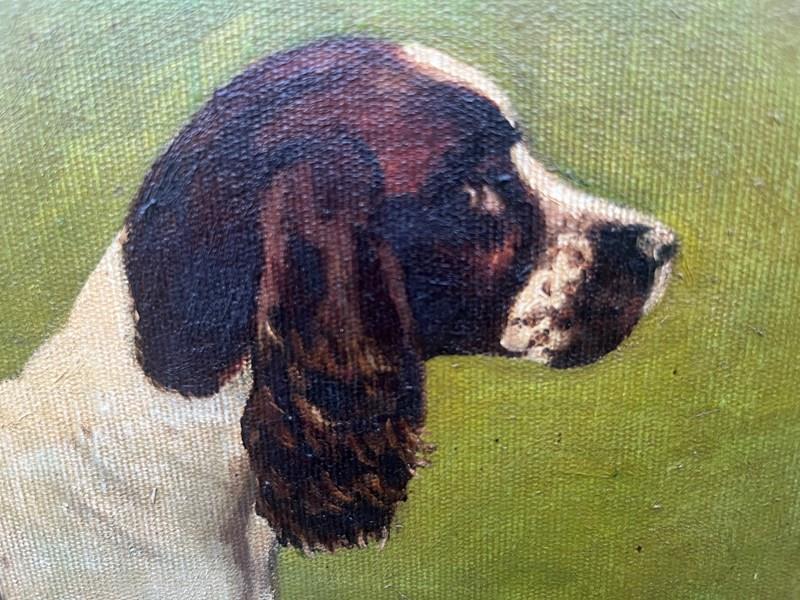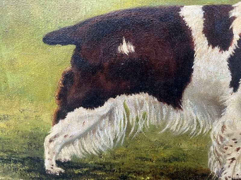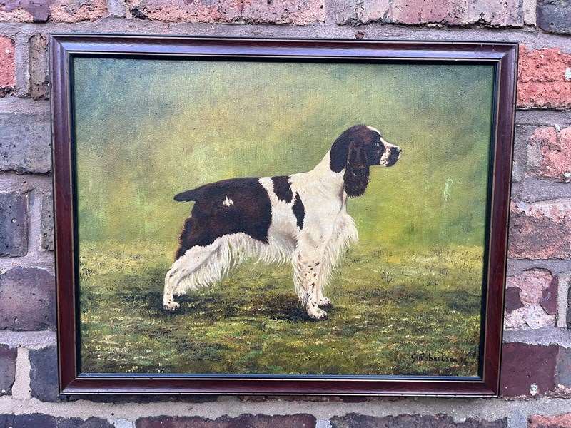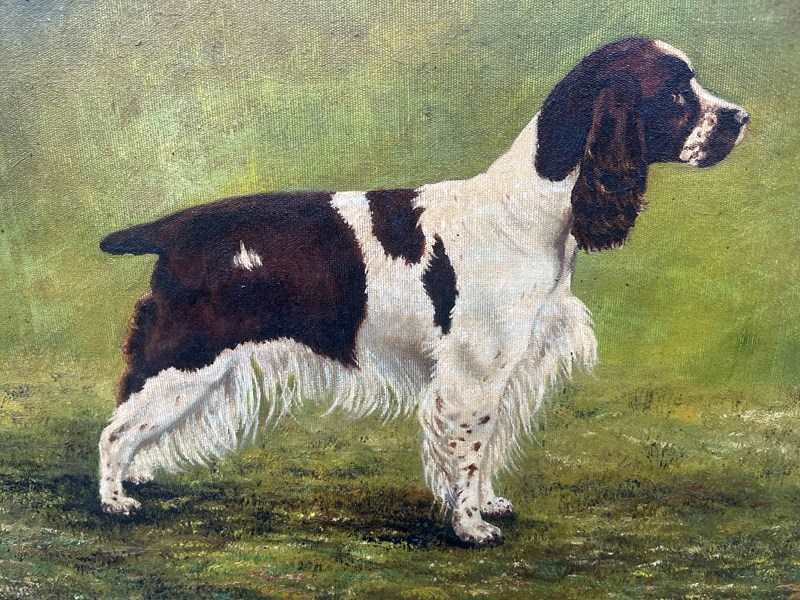 The painting depicts a liver and white English Springer Spaniel in a traditional "stack" or show pose.