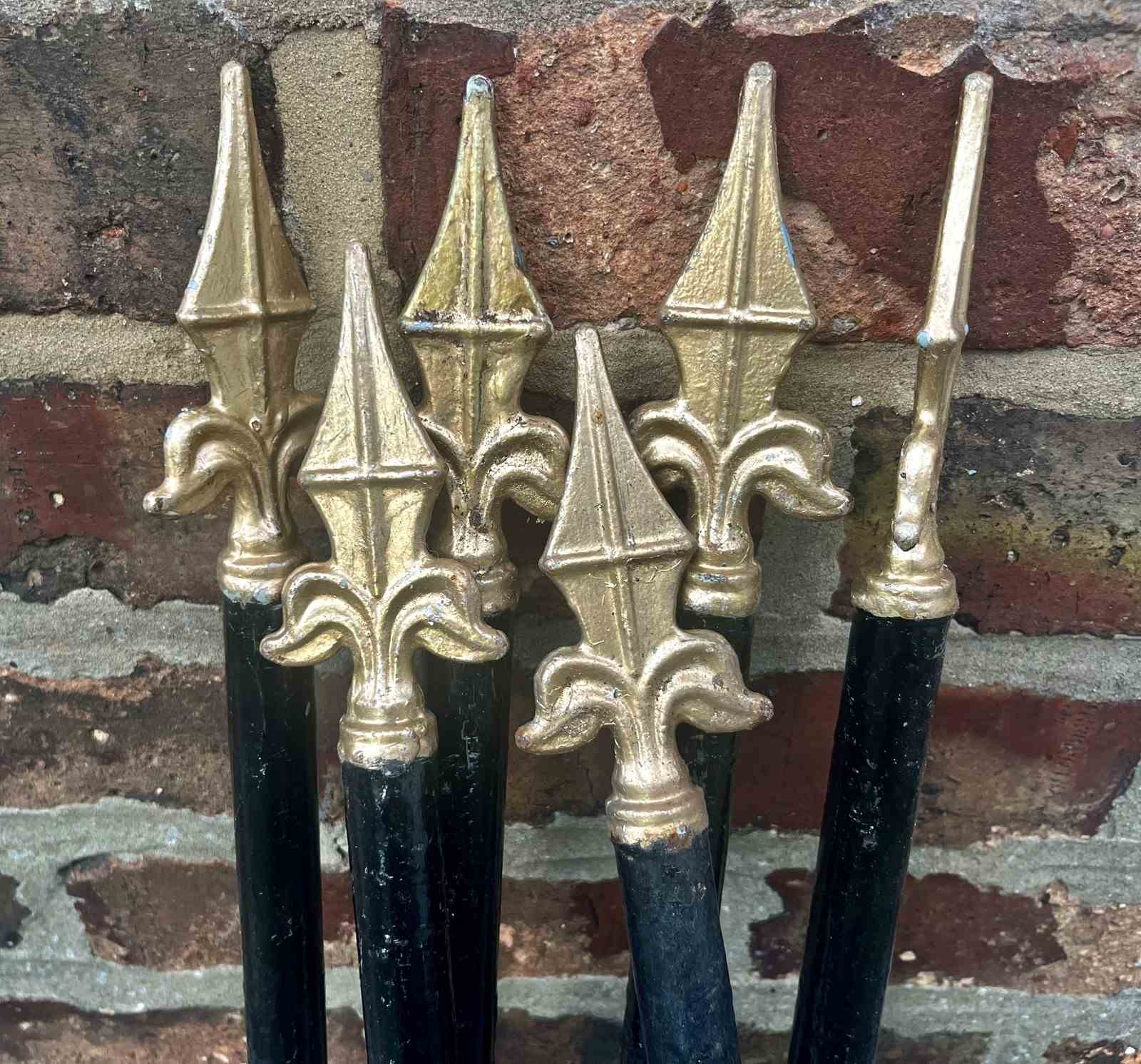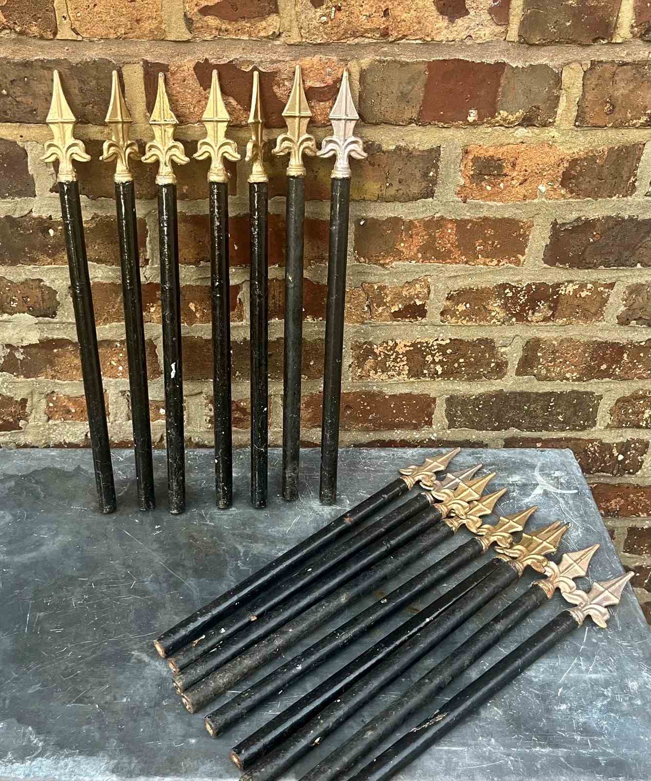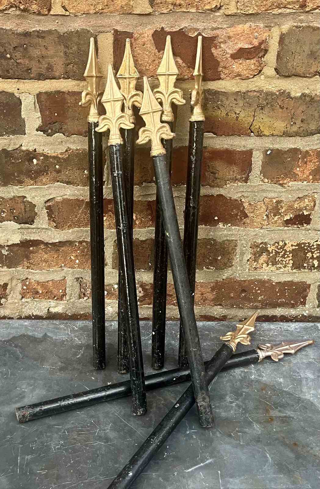 Architectural salvage 16 metal posts with the fleur de lis , painted black and gold, 9 x 50cm and 7 x 53cm.