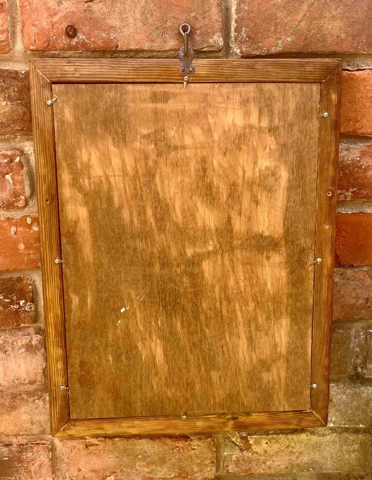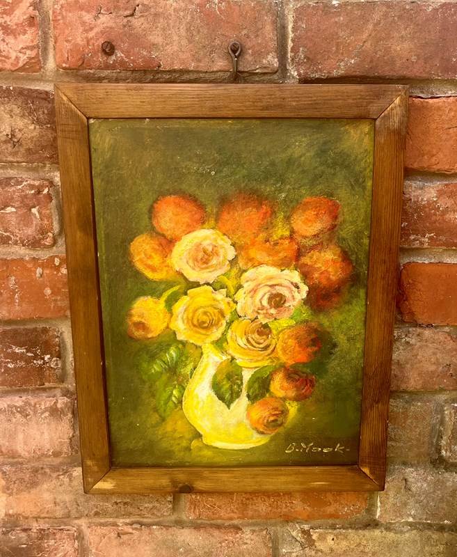 Signed B.Mook, a somber wooden frame and background and then a burst of colour as the Roses shine through. A painting on board with also a nice wooden backboard to the frame.