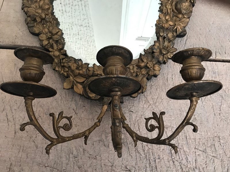 A beautiful French Repousse mirror with slightly foxed mercury glass and 3 candelabra. Wooden backed 19th century with beautiful gilt floral decoration. A stunning mirror.