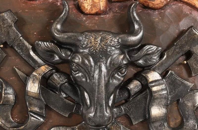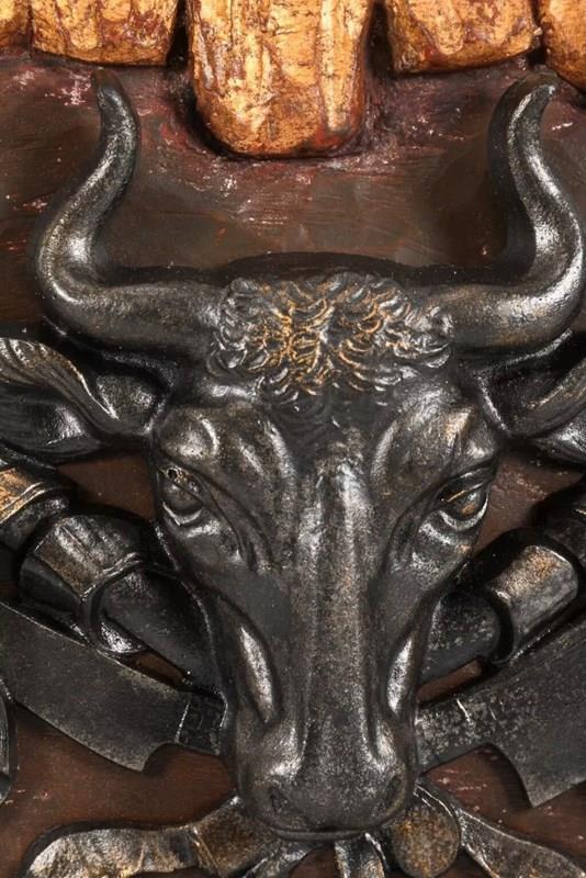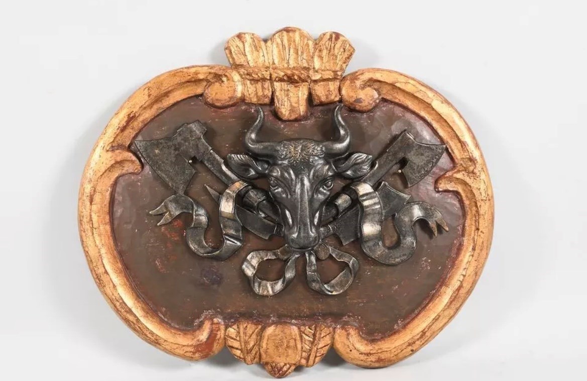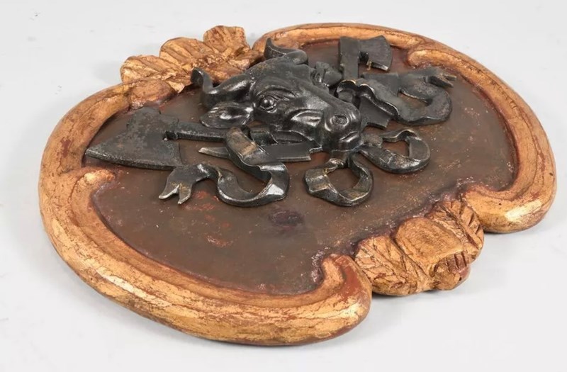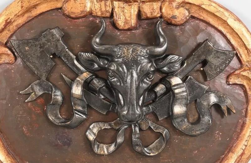 A butchers coat of arms (metzger wappen Schild) on a gilt wooden plaque.