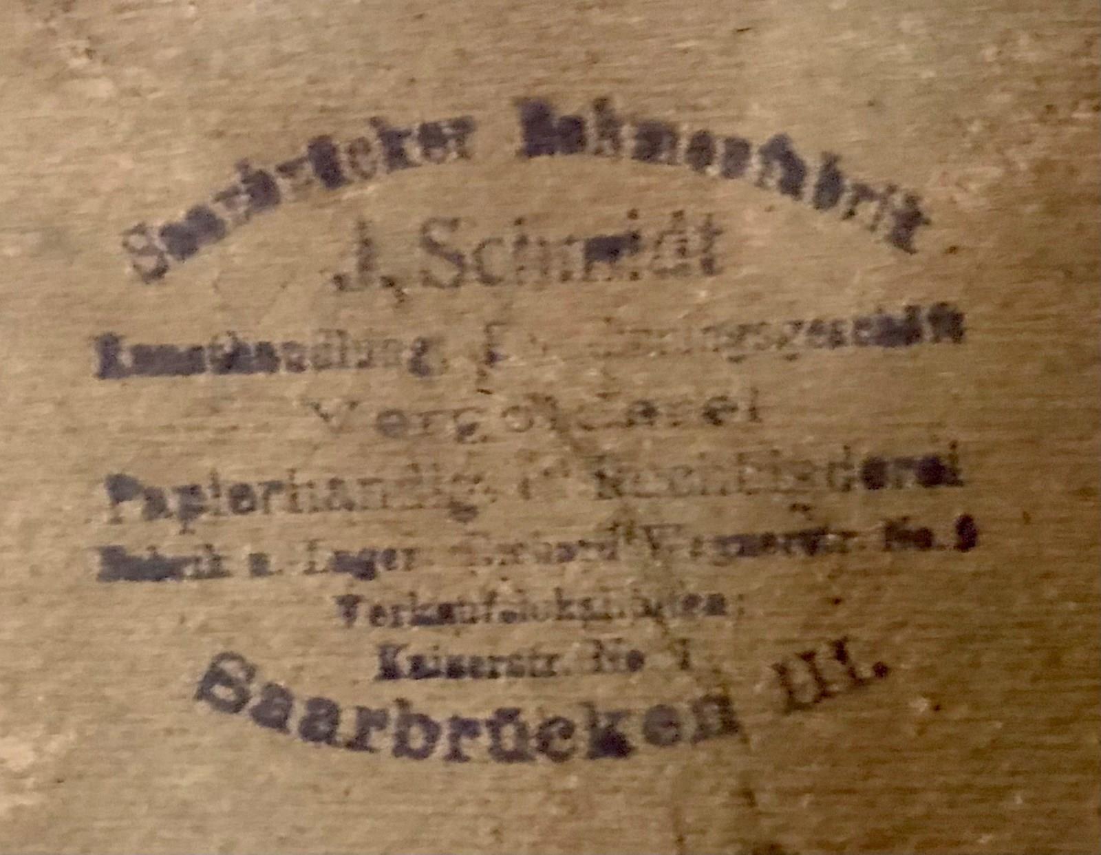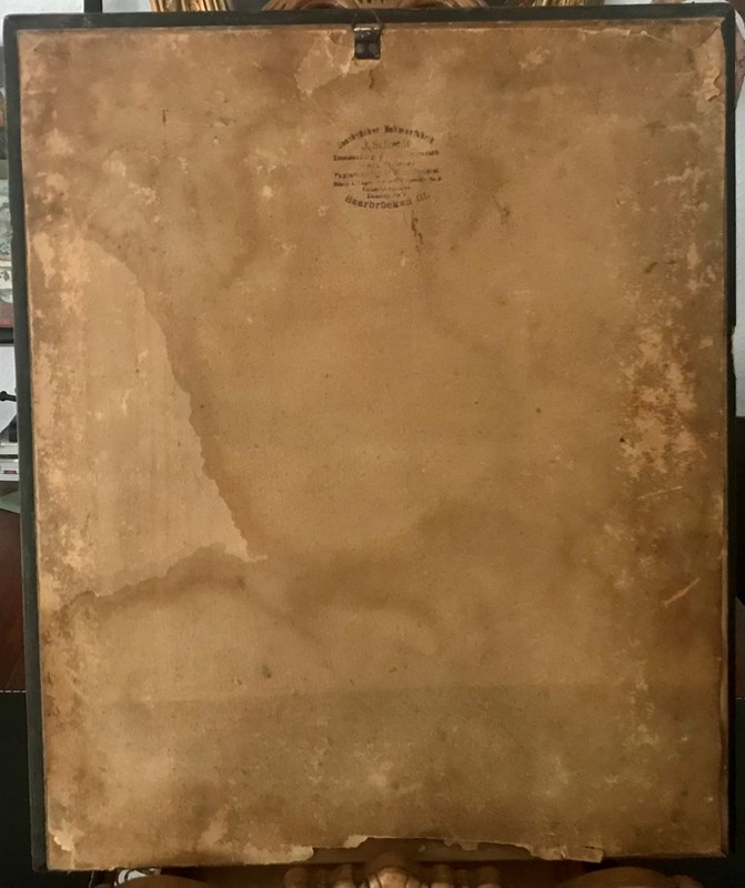 the Wooden frame is showing signs of age also the card back showing the stamp of the framers in Saarbrueken.