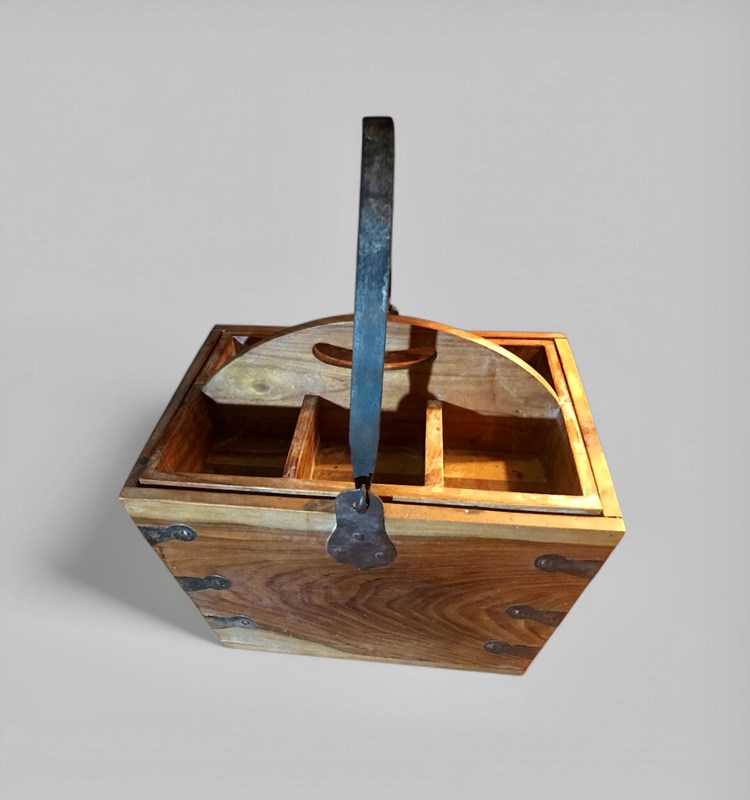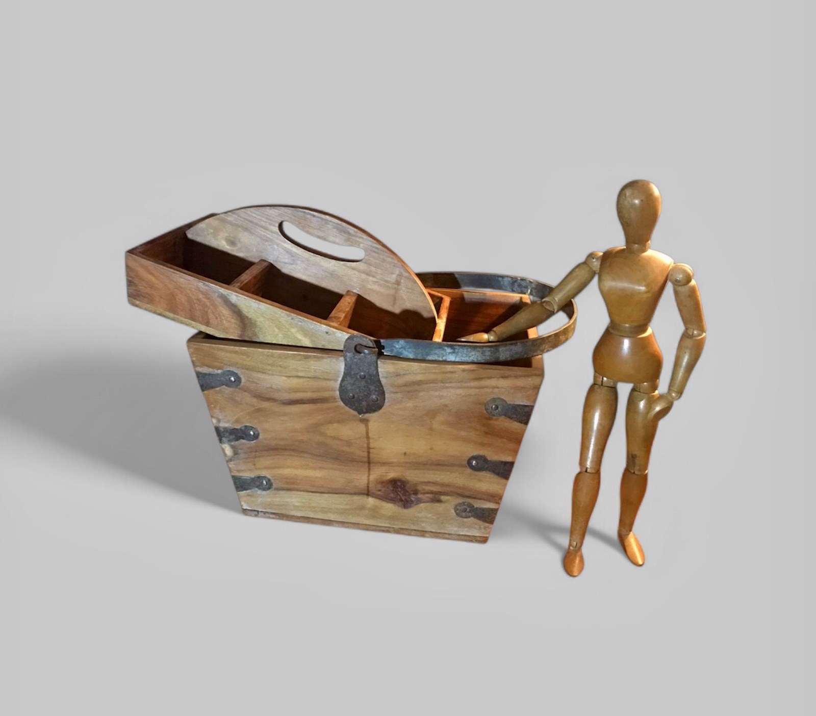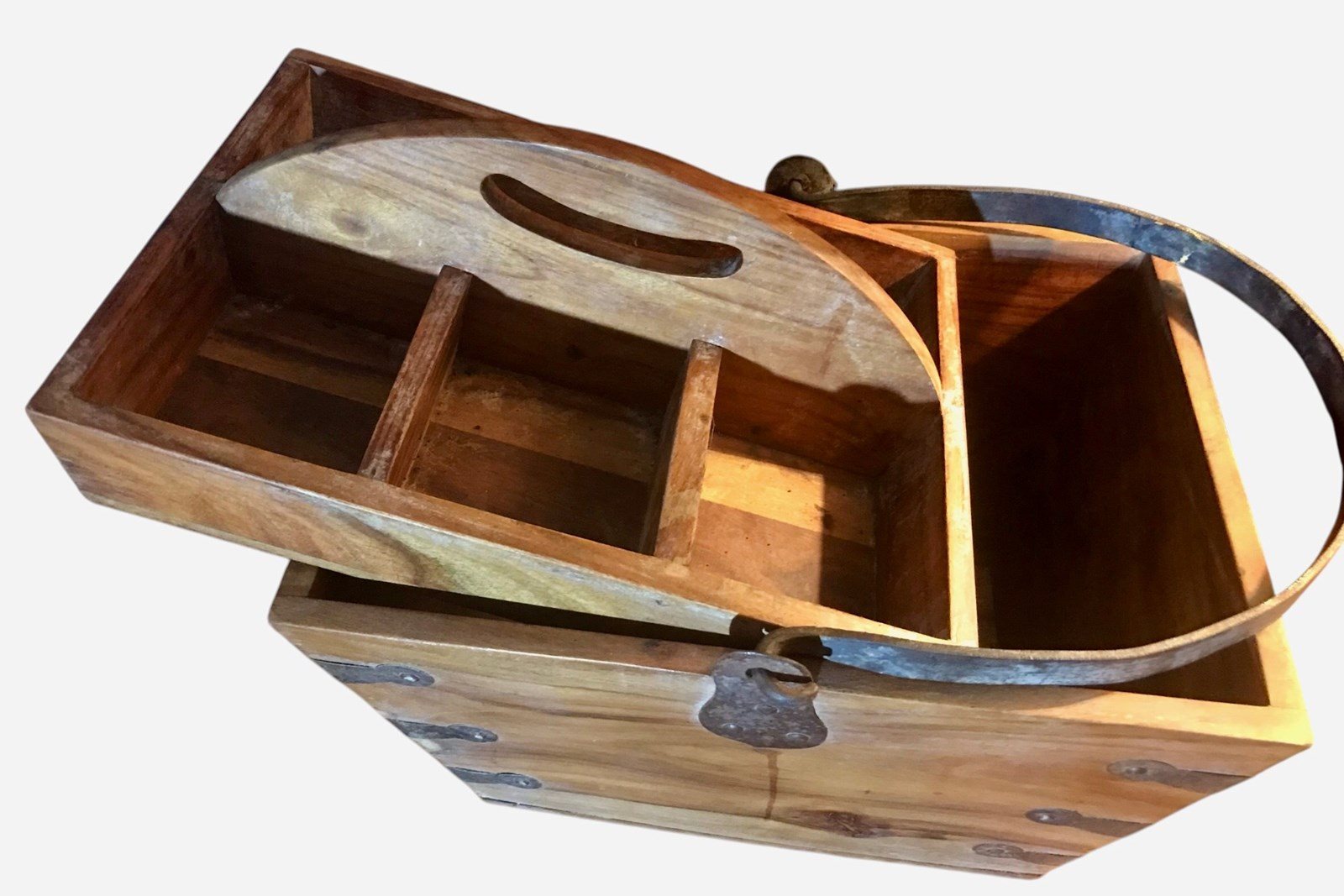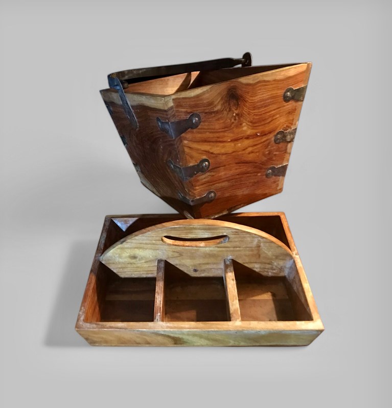 A tapered swing handle solid pine trug with 4 compartment tray that fits snugly in the top and beautiful iron rivets and handle.
