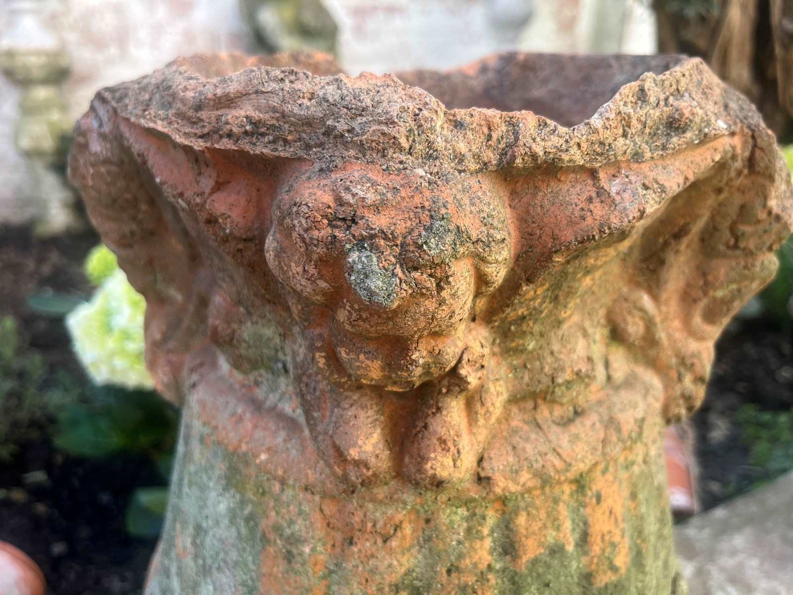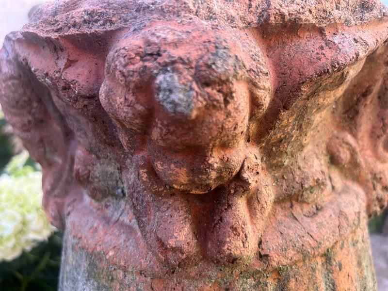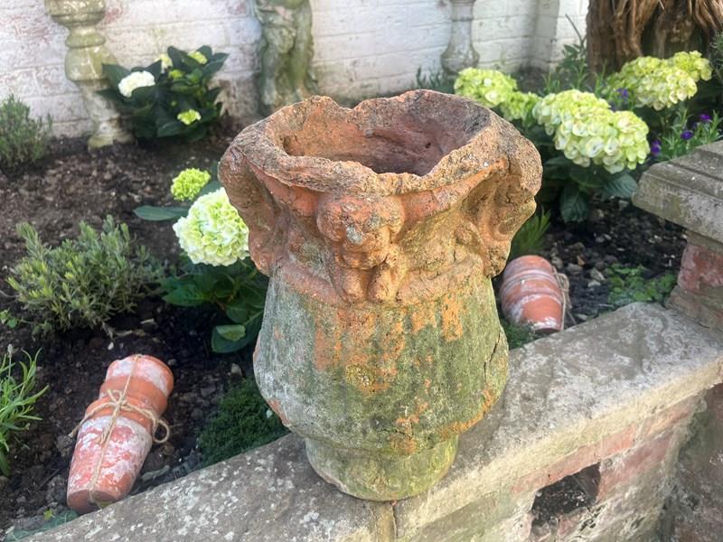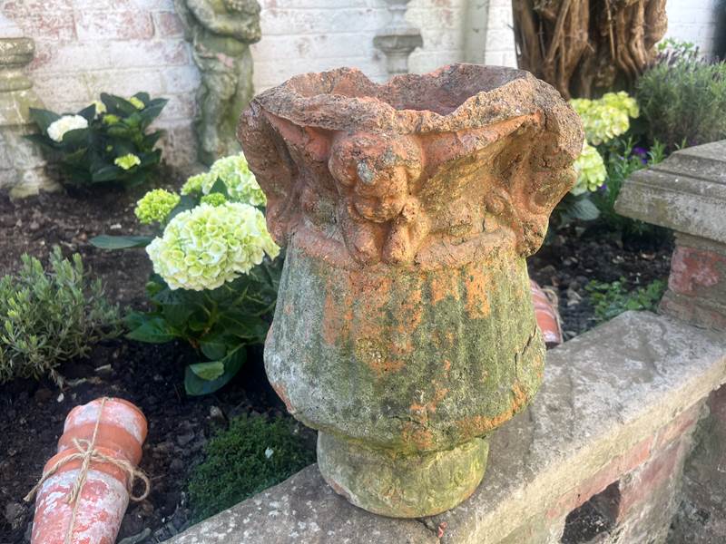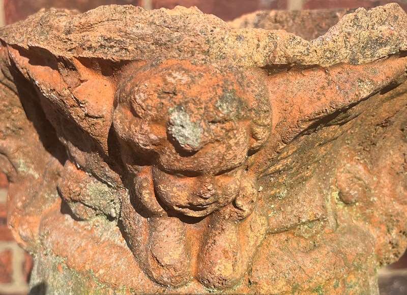 19 th century Aged terracotta with significant weathering and patina decorated with putti’s around the rim.