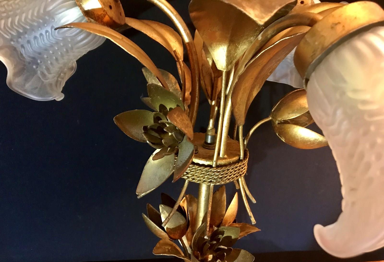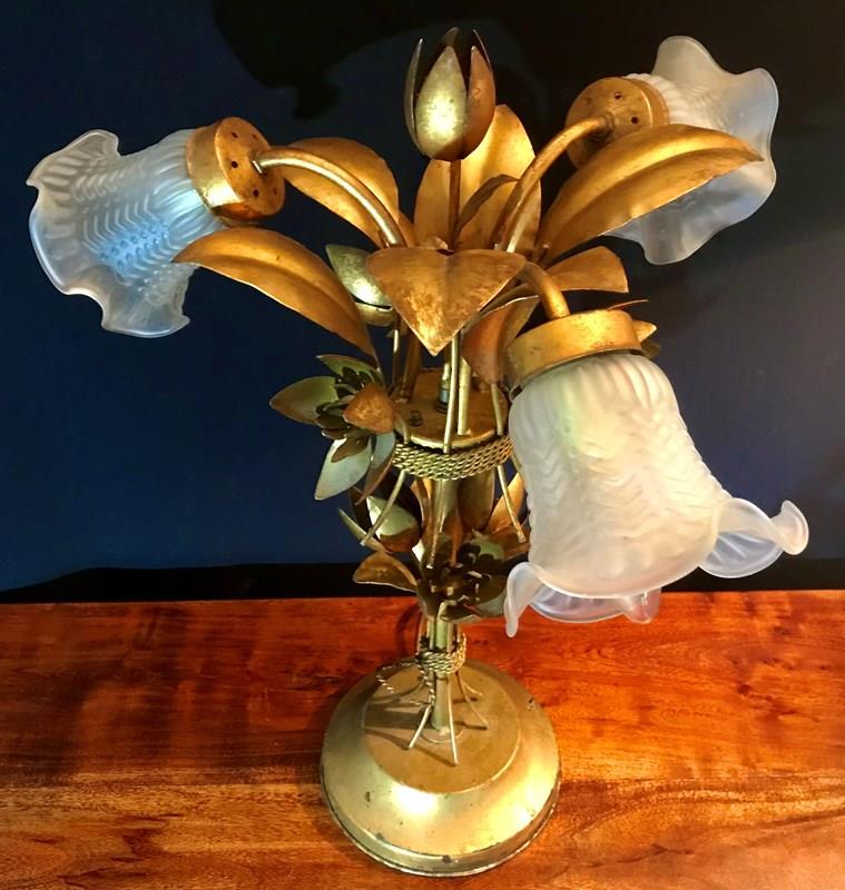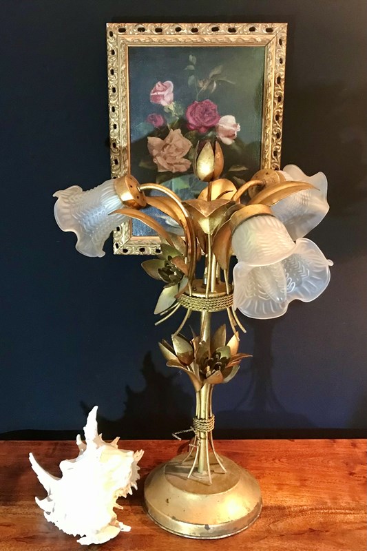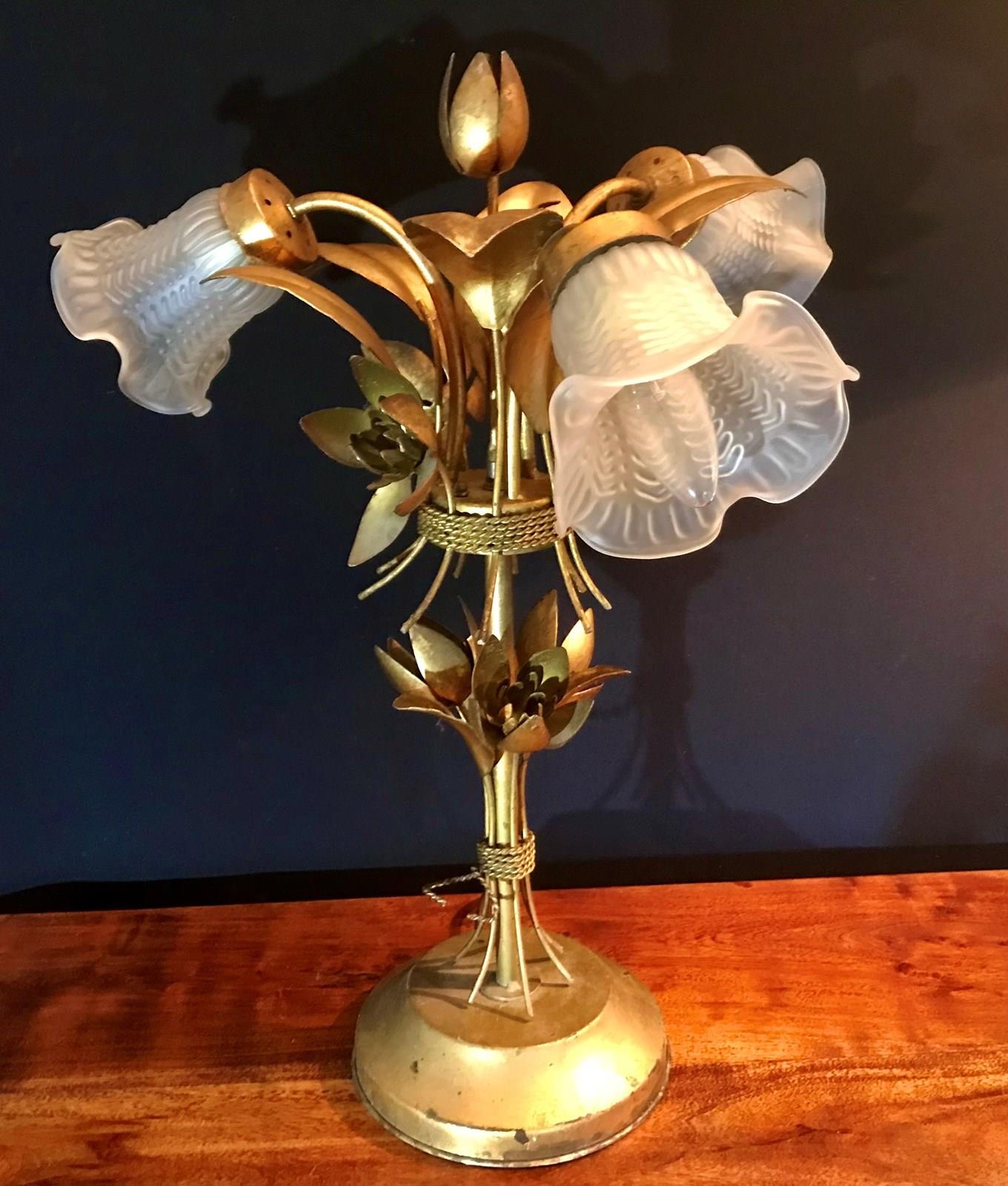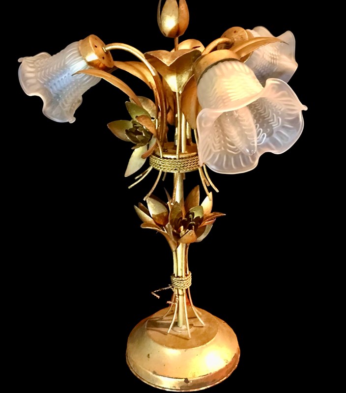A beautiful gilt toleware with glass Hans Kögl table lamp. No chips on the glass but a little wear in places on the gilding.