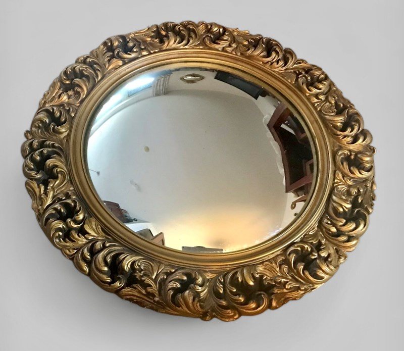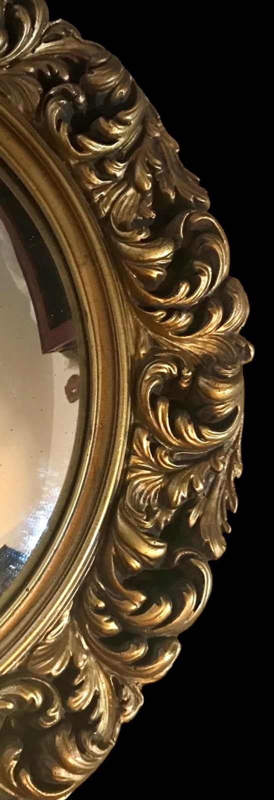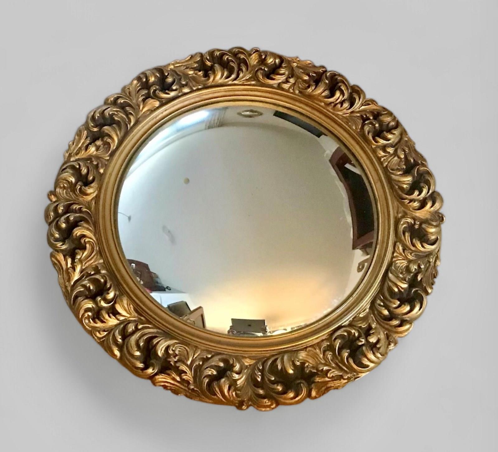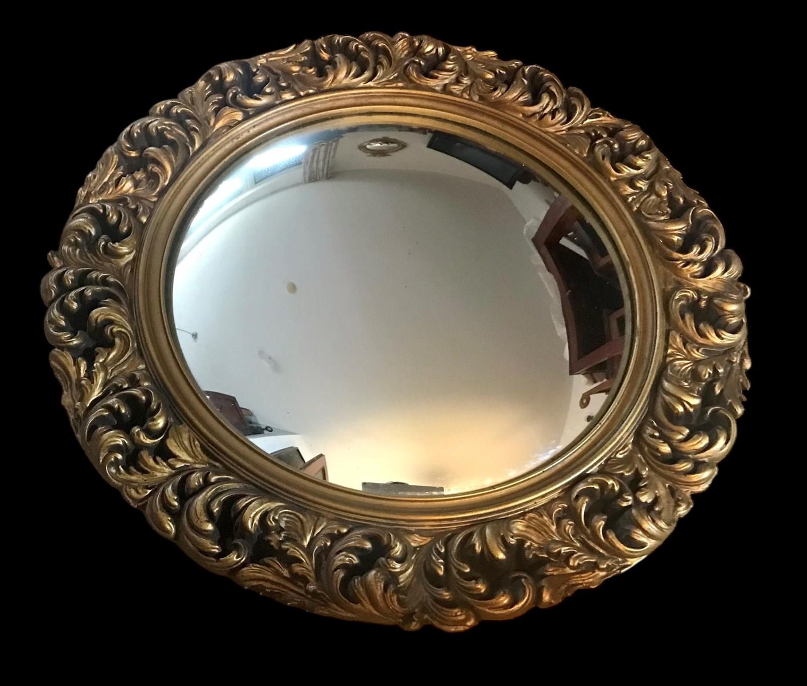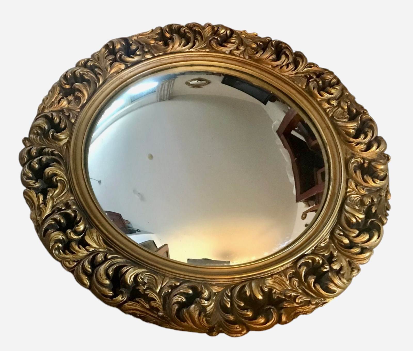 A large plaster and gilded convex mirror with excellent detailing on the frame.