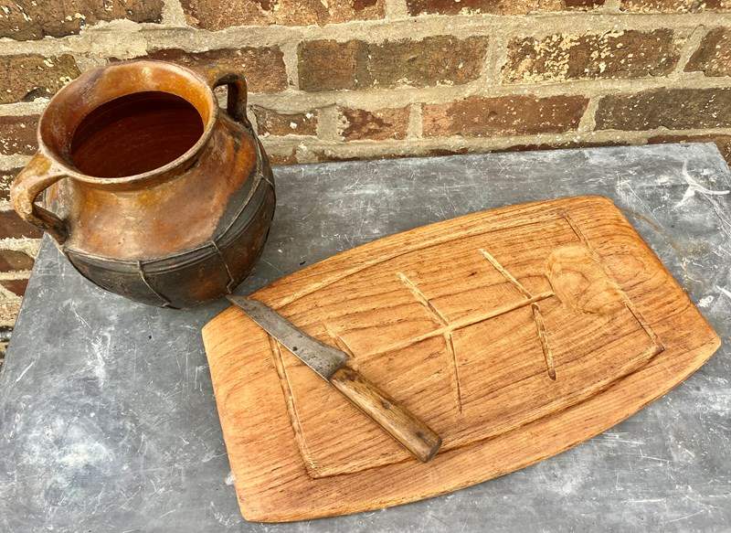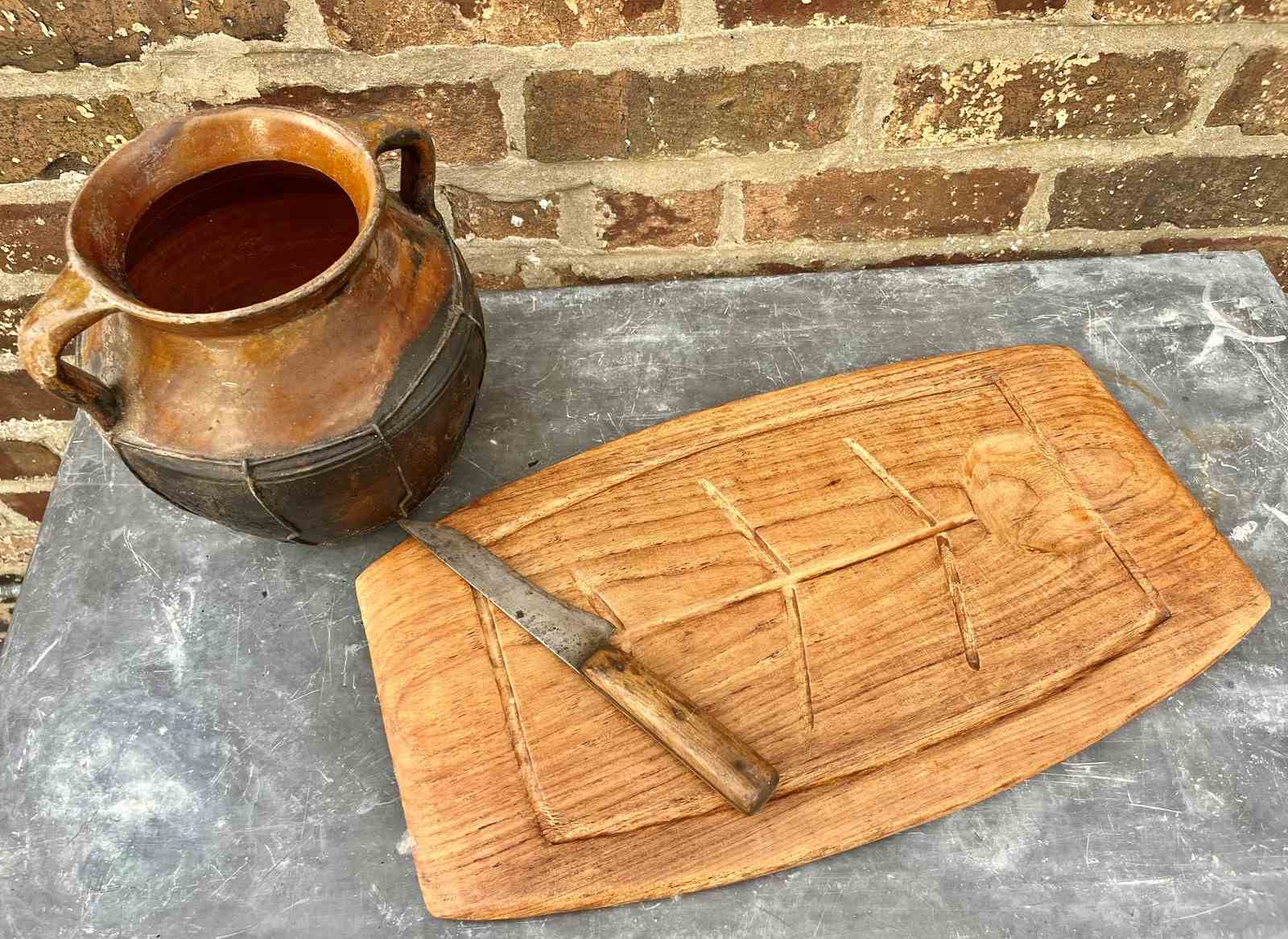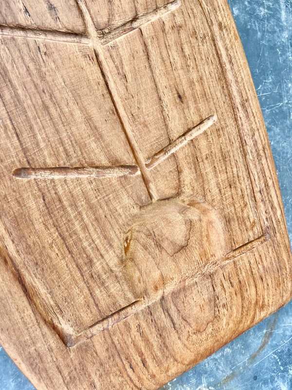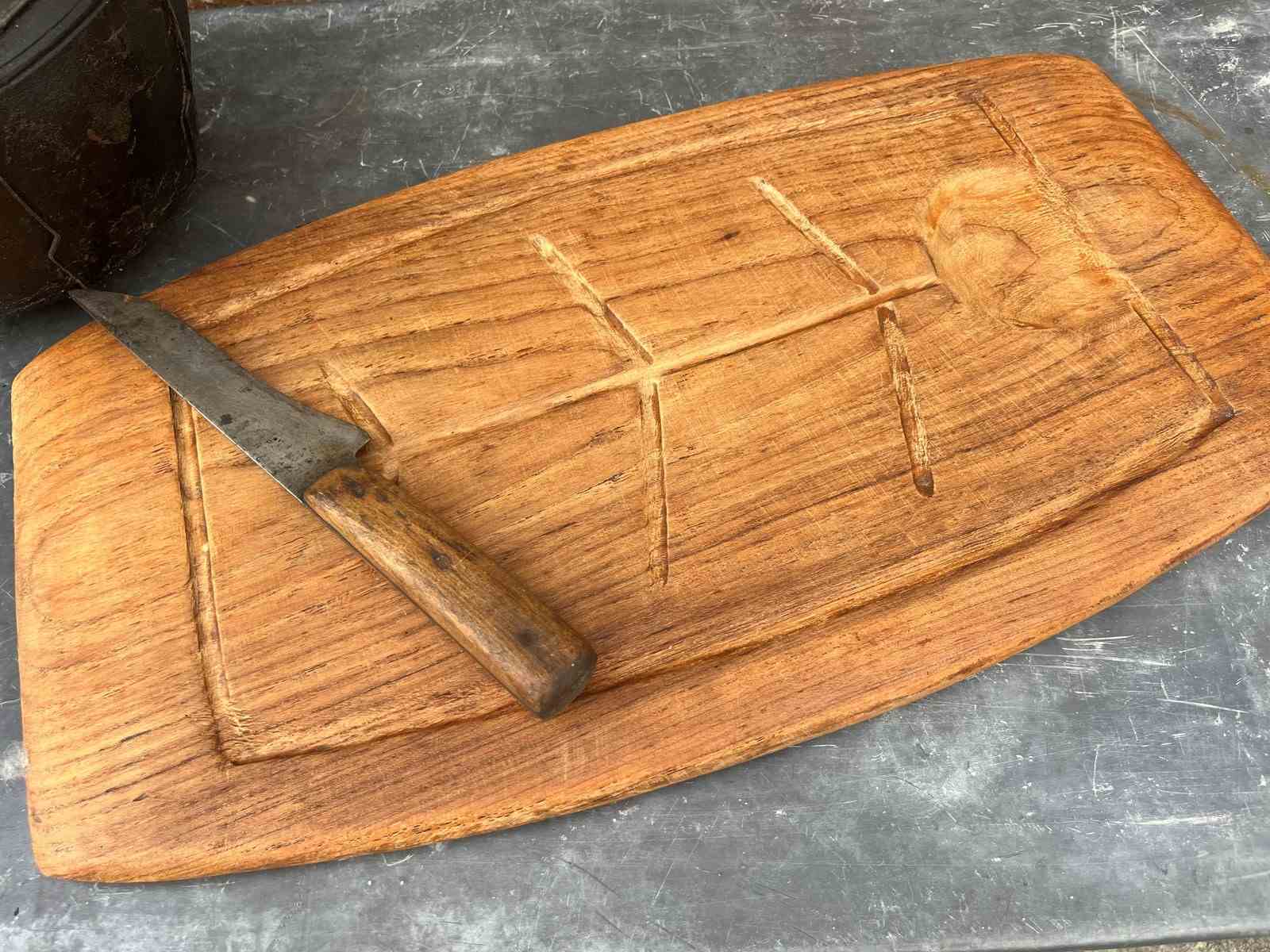 A mid century meat chopping board with drainage ports,turn over and can be used for bread etc.