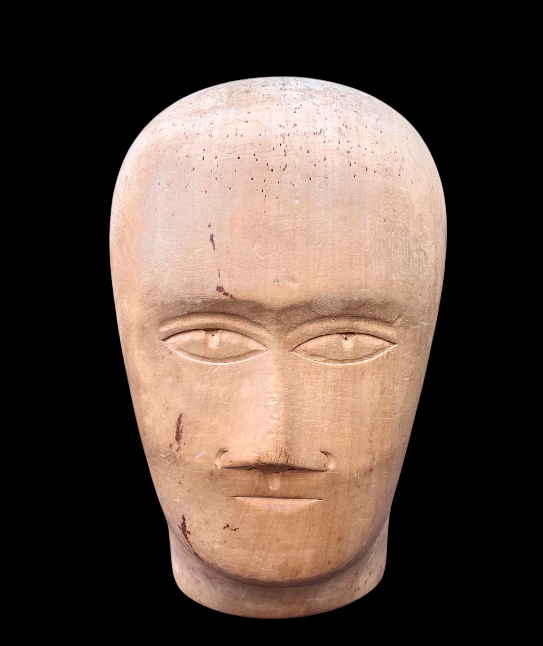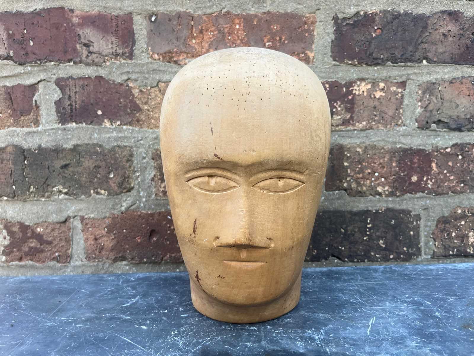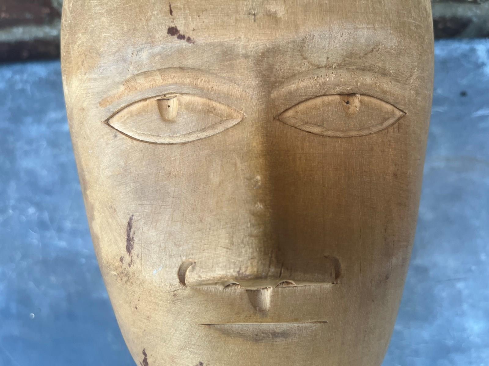 A 1920s carved milliners head or wig makers head on turned wood, some historical worm, great face however.