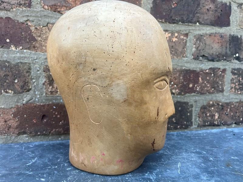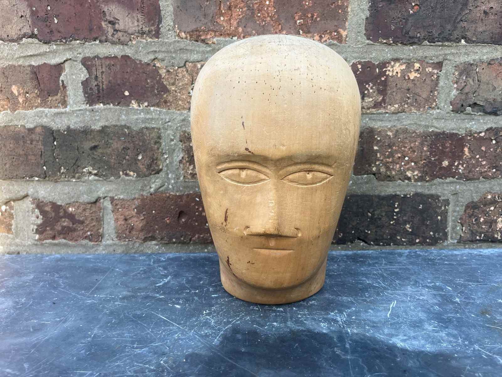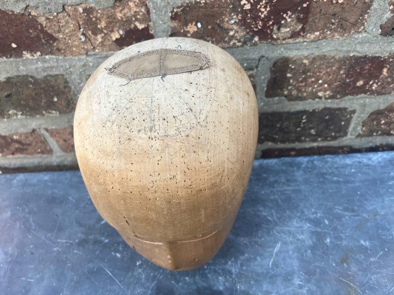 A 1920s carved milliners head or wig makers head on turned wood, some historical worm, great face however.