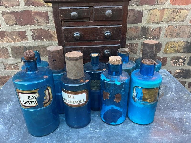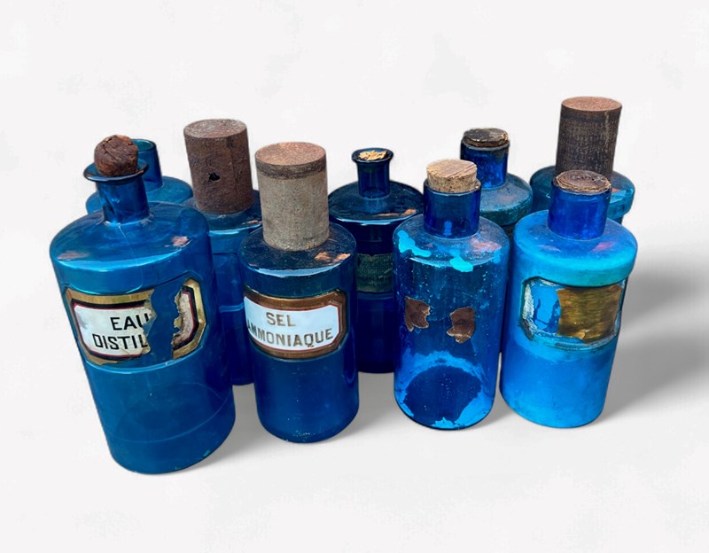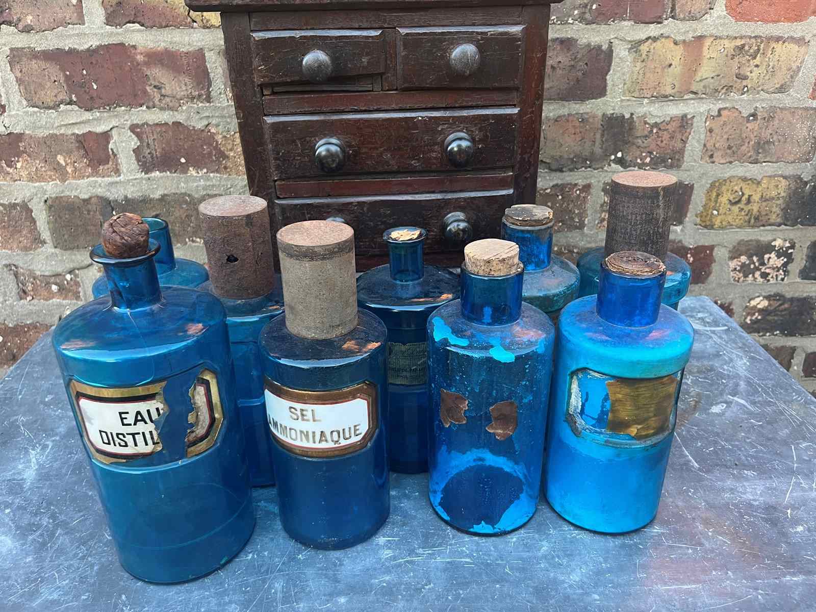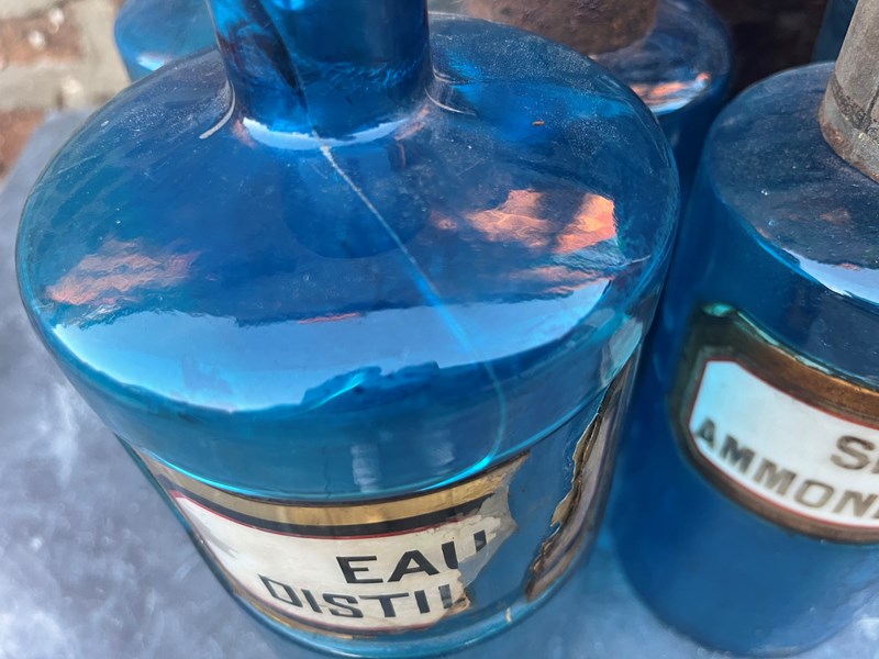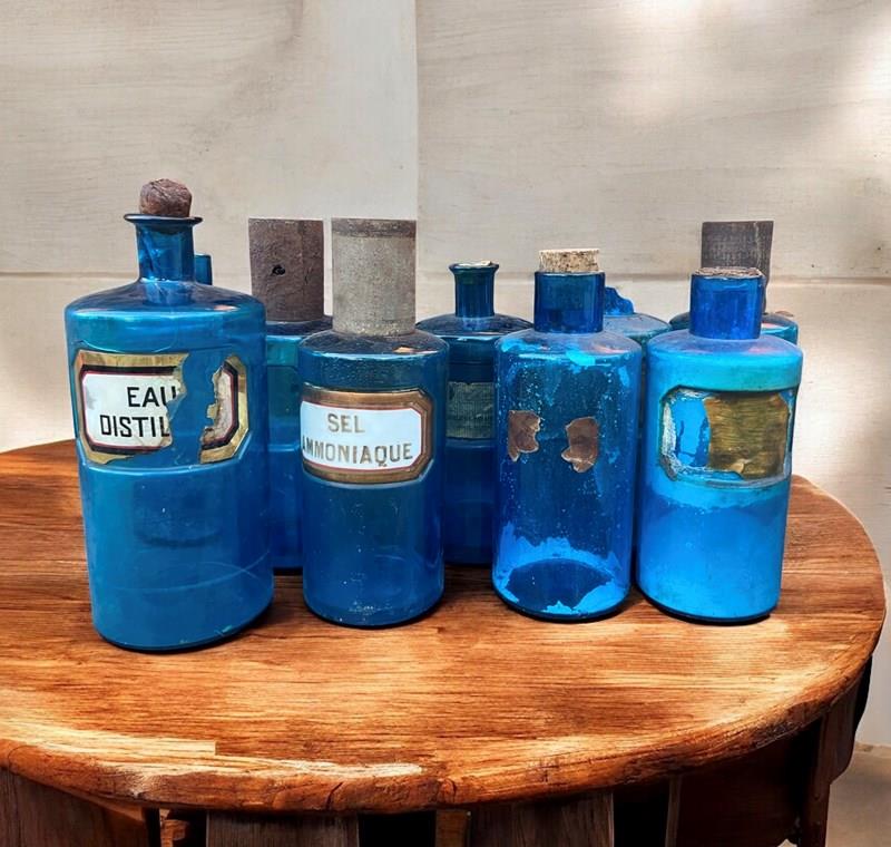 A beautiful set of early opaline glass apothecary bottles, large 9 in total bottles unfortunately some missing the lids and one with a crack through as seen but it remains solid.
