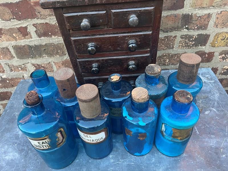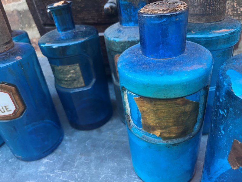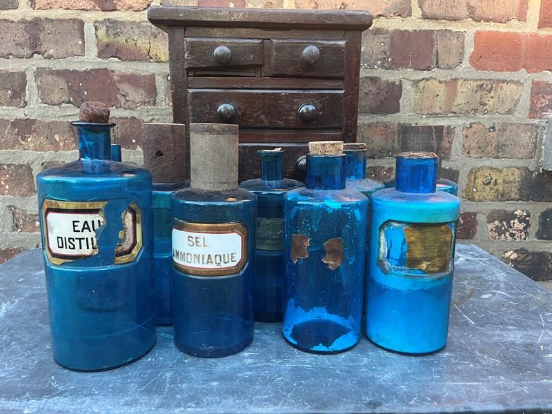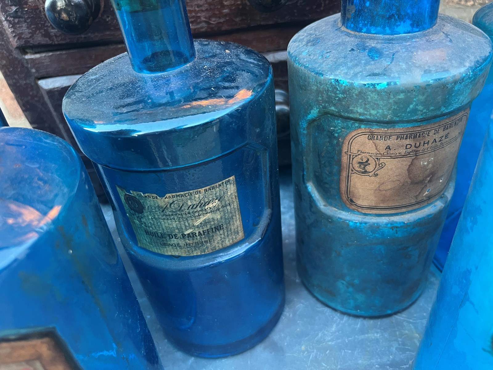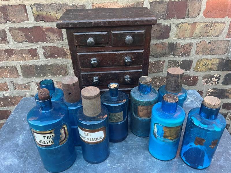 A beautiful set of early opaline glass apothecary bottles, large 9 in total bottles unfortunately some missing the lids and one with a crack through as seen but it remains solid.