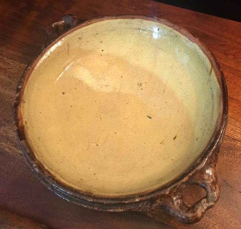 A beautiful mustard coloured glazed pancheon, mustard on the inside with a dark brown outer surface.