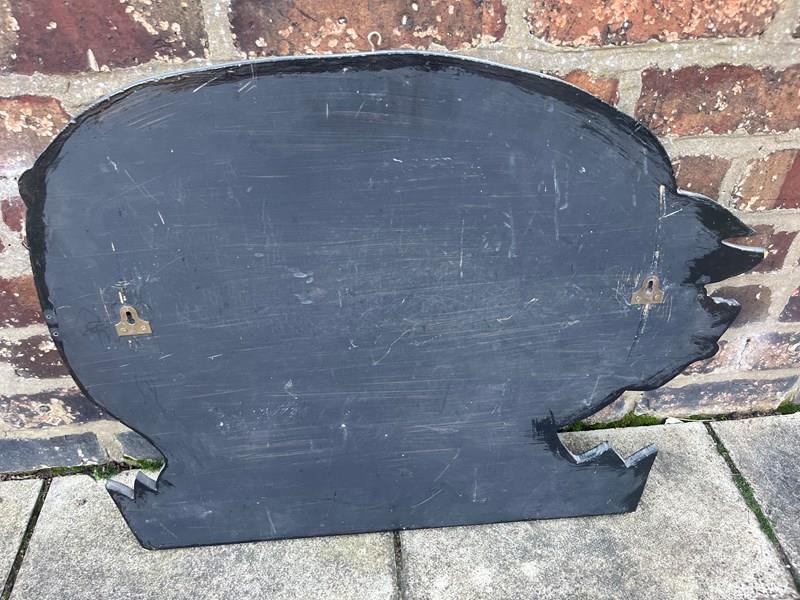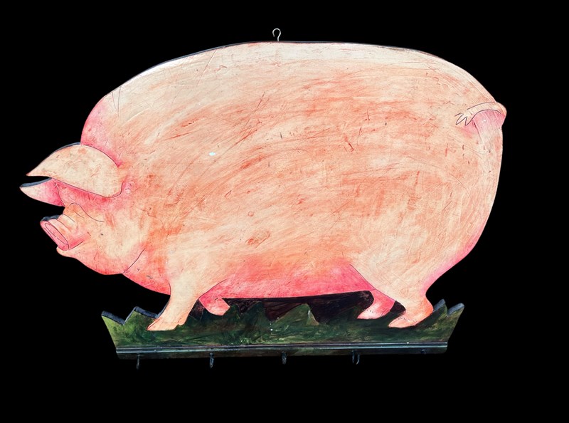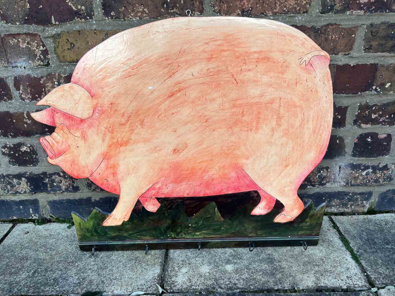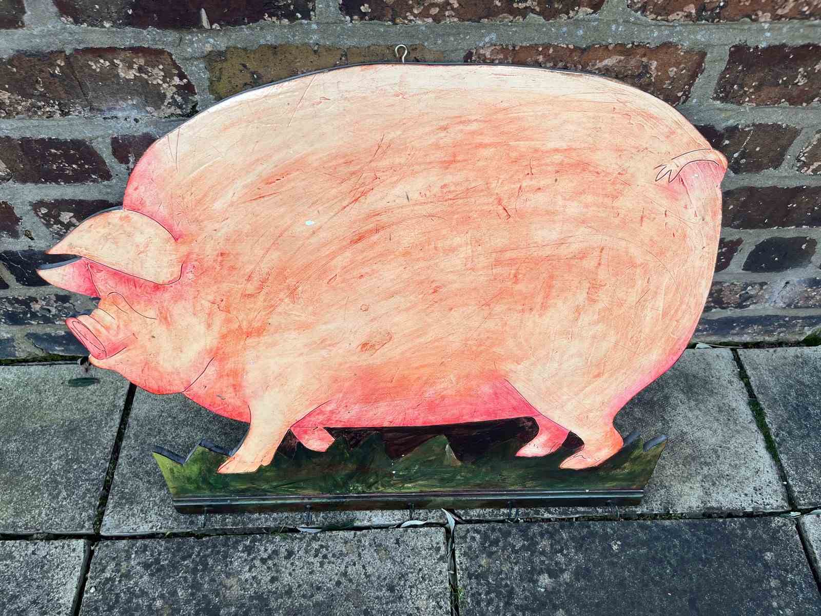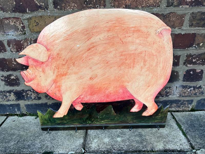 A well made solid heavy pig, could be used as a sign or a wall hanging with hooks on the base. Hand painted interesting sign that could be used in the household or as a business sign.