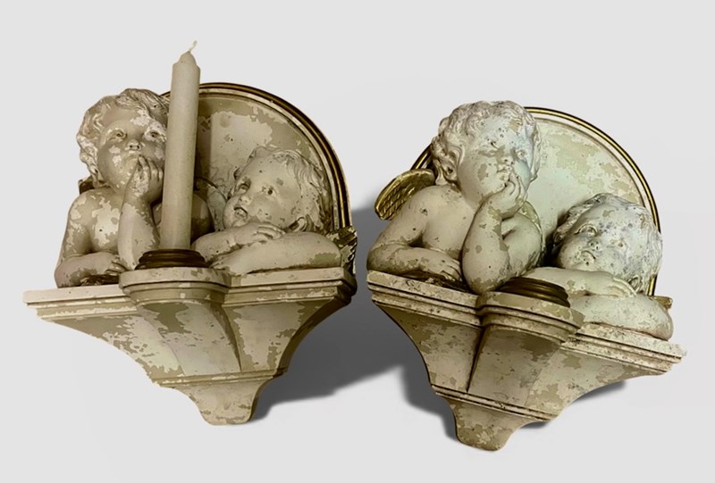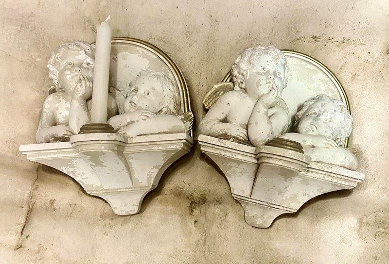 A nice pair of decorative wall hanging, heavy plaster putti angels as candle holders.